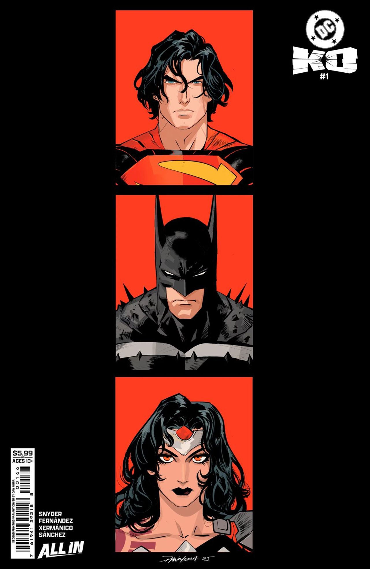 DC K.O. #1 Second Printing will showcase Javi Fernández’ main cover from DC K.O. #1 with new trade dress, and a new Dan Mora variant cover featuring Darkseid’s three destroyers, the Absolute Universe’s Batman, Superman and Wonder Woman.