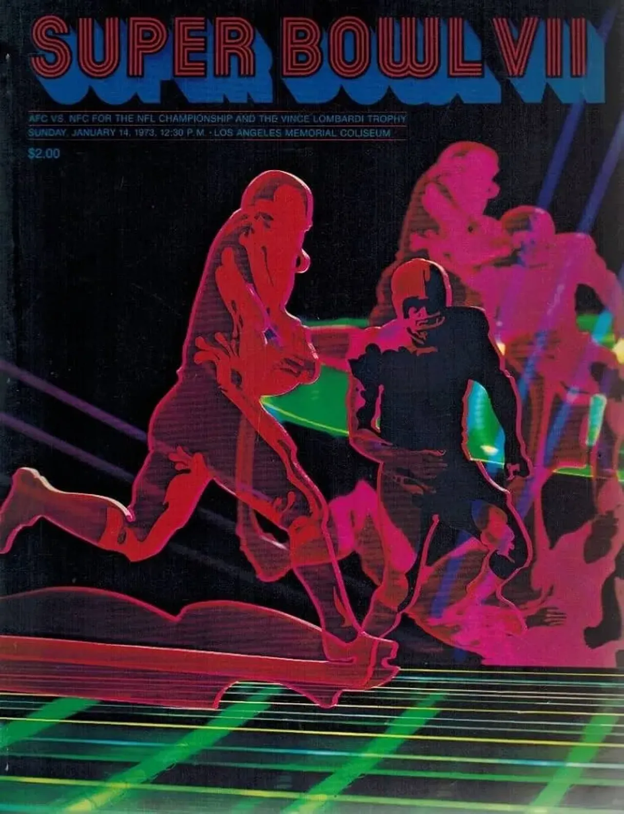Super Bowl VII. Dolphins and Redskins. Collectors must be loving how much this cover plays into the era’s graphic vernacular, with chunky, shadowed lettering and retro pop design. It sells frequently. 1 of 2 CGC 9.4s (the highest grade found for this program) sold during last year's Super Bowl frenzy in February for $960. There have been 6 sales between kickoffs. The most recent was an 8.5 that sold for $250 a day ago.