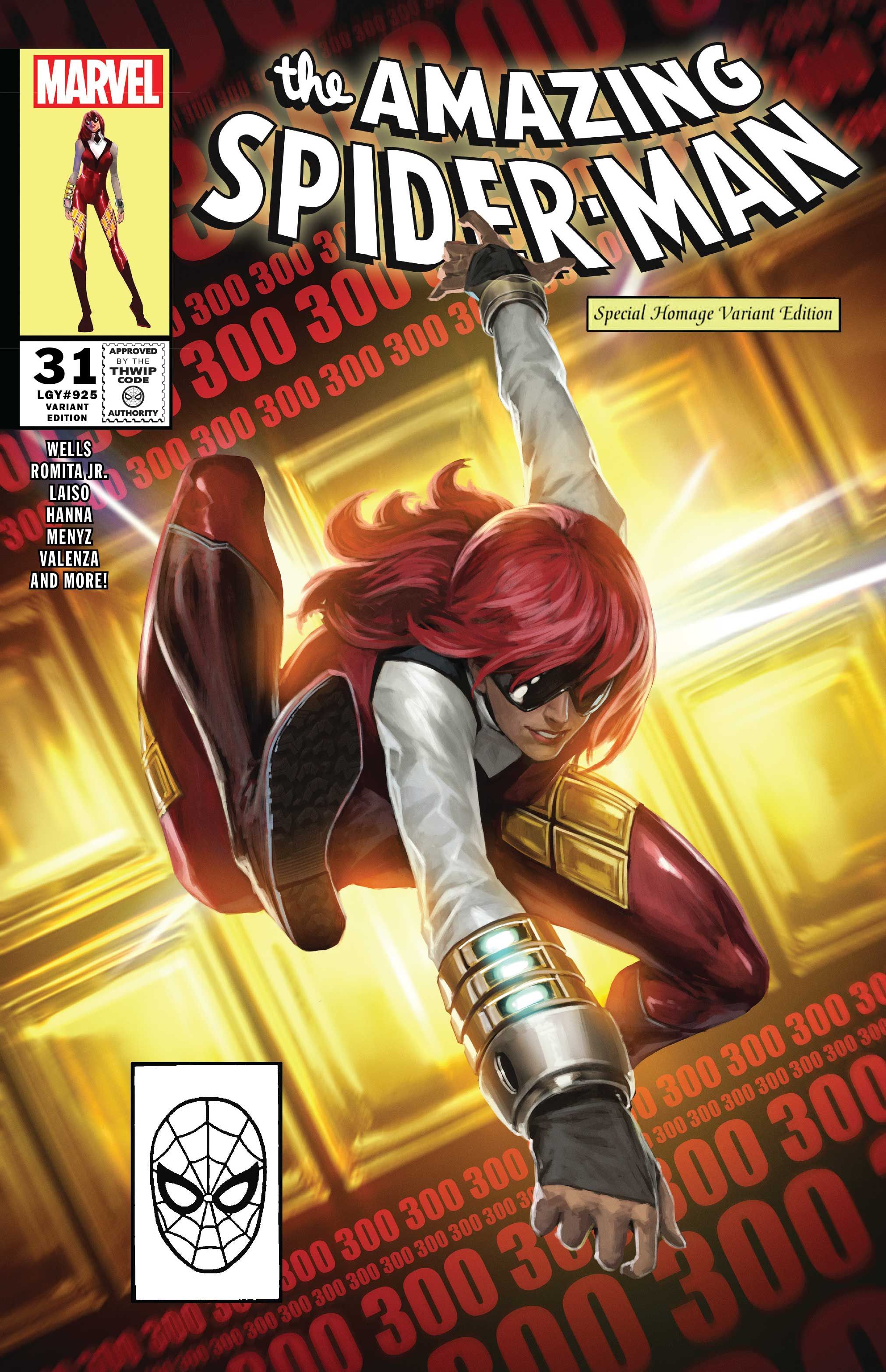 The new printing will have two jaw dropping covers. One will be a magazine style pinup that pays tribute to MJ's fashion model days by superstar Spidey artist Humberto Ramos, the designer behind the new look. The other will be an homage to Todd McFarlane's iconic Amazing Spider-Man #300 cover by popular cover artist Skan, which will also be available as a virgin variant cover.