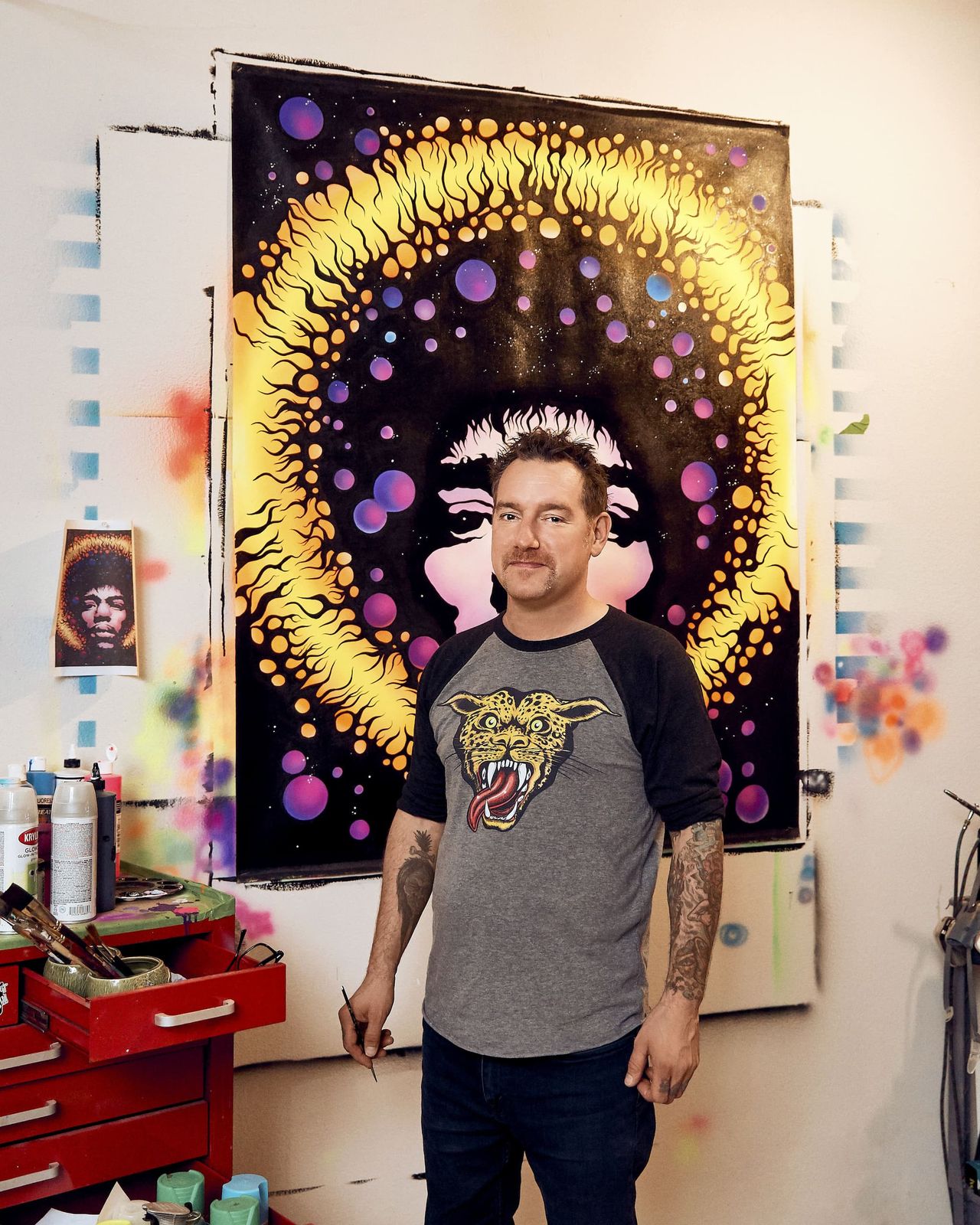 Born in Ottawa, Canada, in 1974, Donny Gillies is a highly influential artist in the punk, rock 'n' roll and heavy metal scenes. He is known for his art across various mediums, such as skate decks, pinball machines, and album covers. His artistic style, kustom kulture, was born out of the hot rod movement, blending monster themes with heavily modified automobiles and motorcycles. Early in his career, he worked with Metallica on murals, merchandise, and pinball machines, creating the iconic character "Sparky." Donny's work with Metallica led him to a commission from Stern Pinball for an Aerosmith game, thanks to his reputation and Metallica's recommendation. His recognizable hand-drawn designs have promoted kustom kulture to a wider audience than ever before.