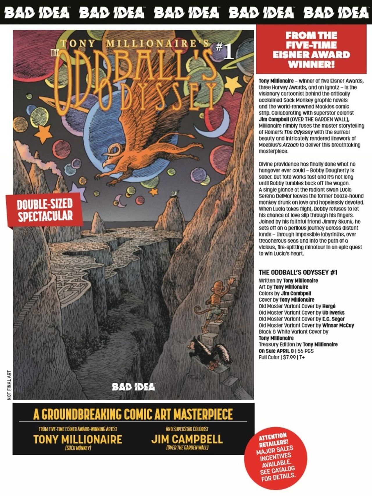Tony Millionaire – winner of five Eisner Awards, three Harvey Awards, and an Ignatz – is the visionary cartoonist behind the critically acclaimed Sock Monkey graphic novels and the world-renowned Maakies comic strip. Collaborating with superstar colorist Jim Campbell (OVER THE GARDEN WALL), Millionaire nimbly fuses the master storytelling of Homer's The Odyssey with the surreal beauty and intricately rendered linework of Moebius's Arzach to deliver this breathtaking masterpiece.