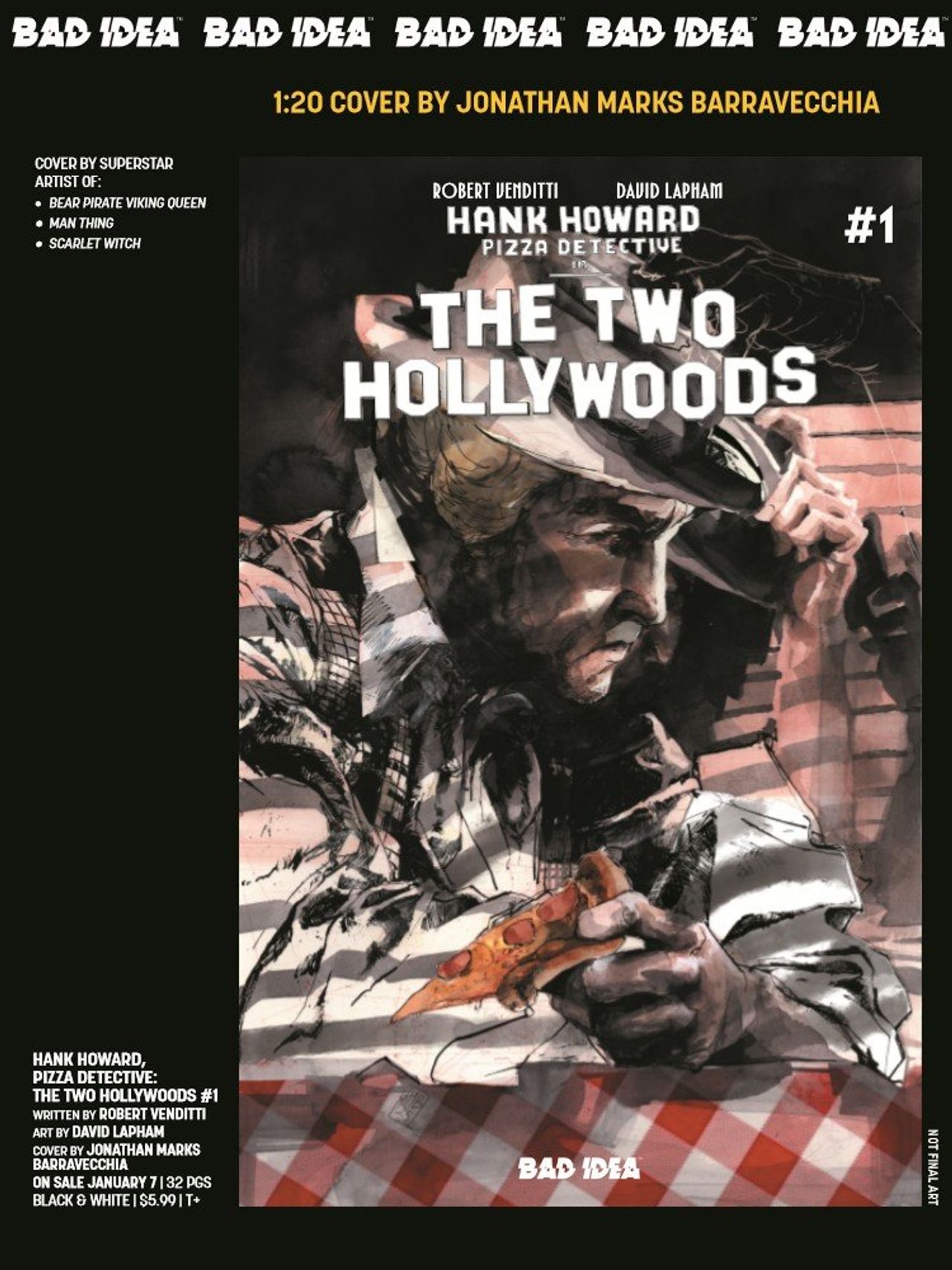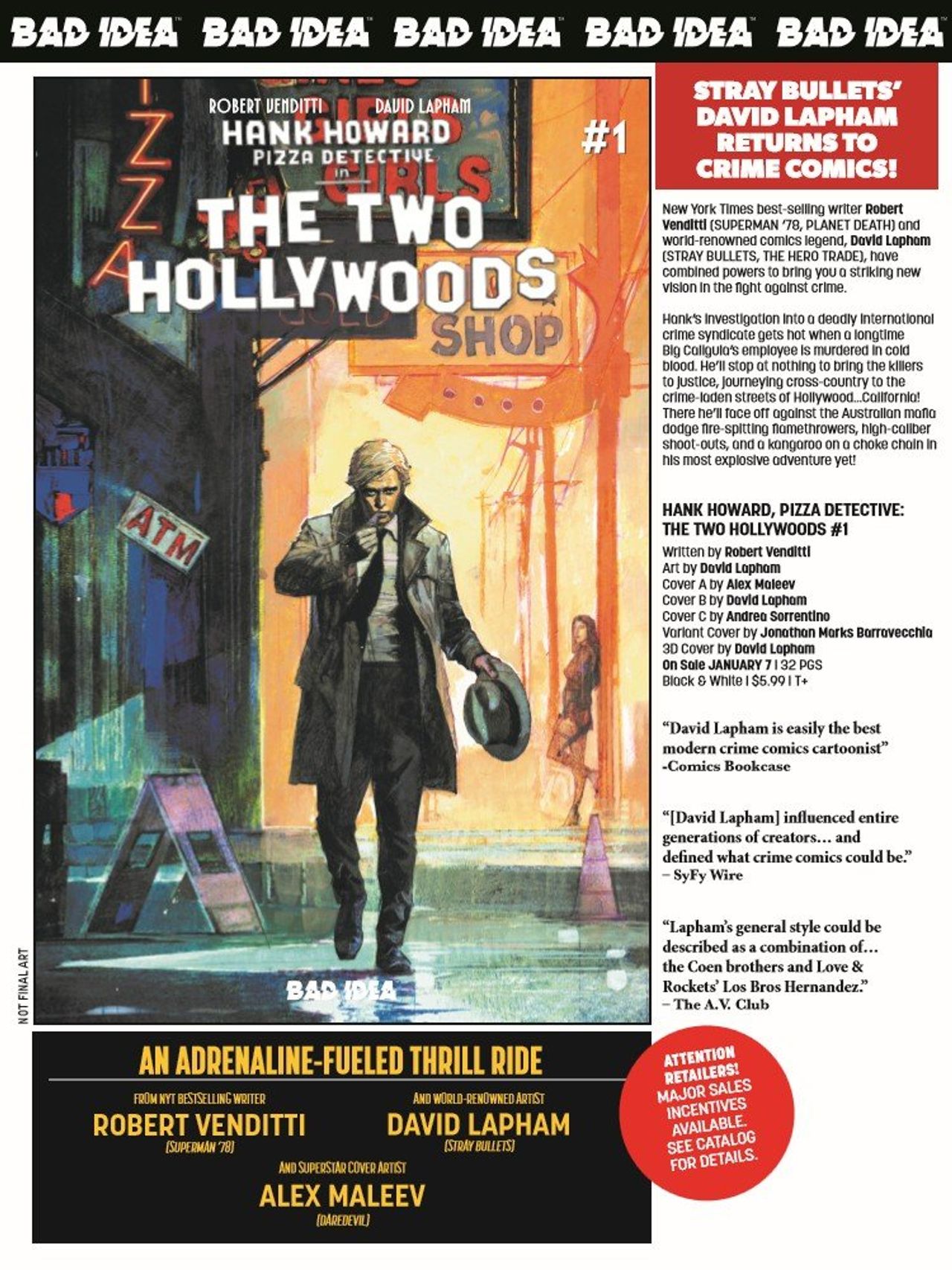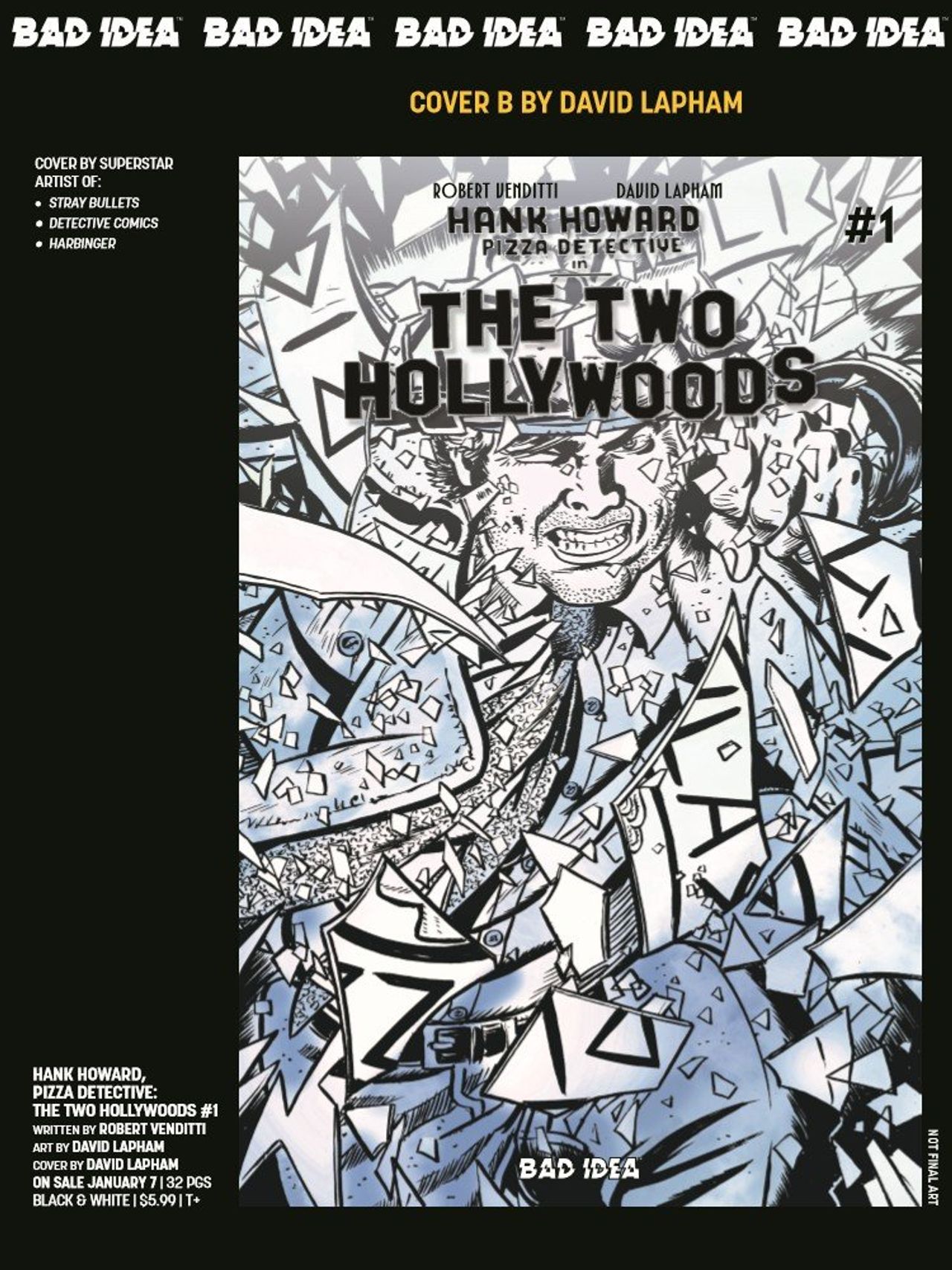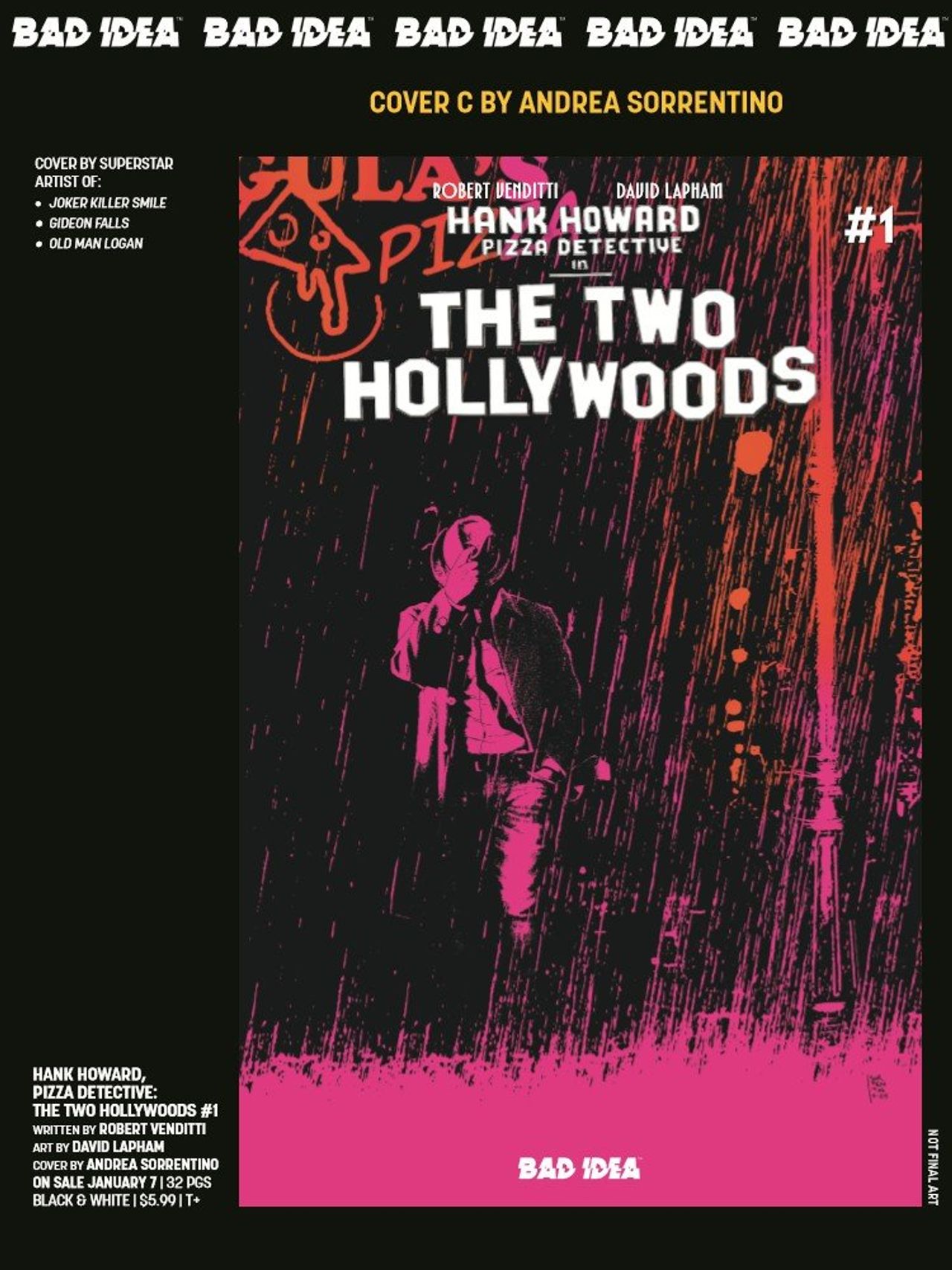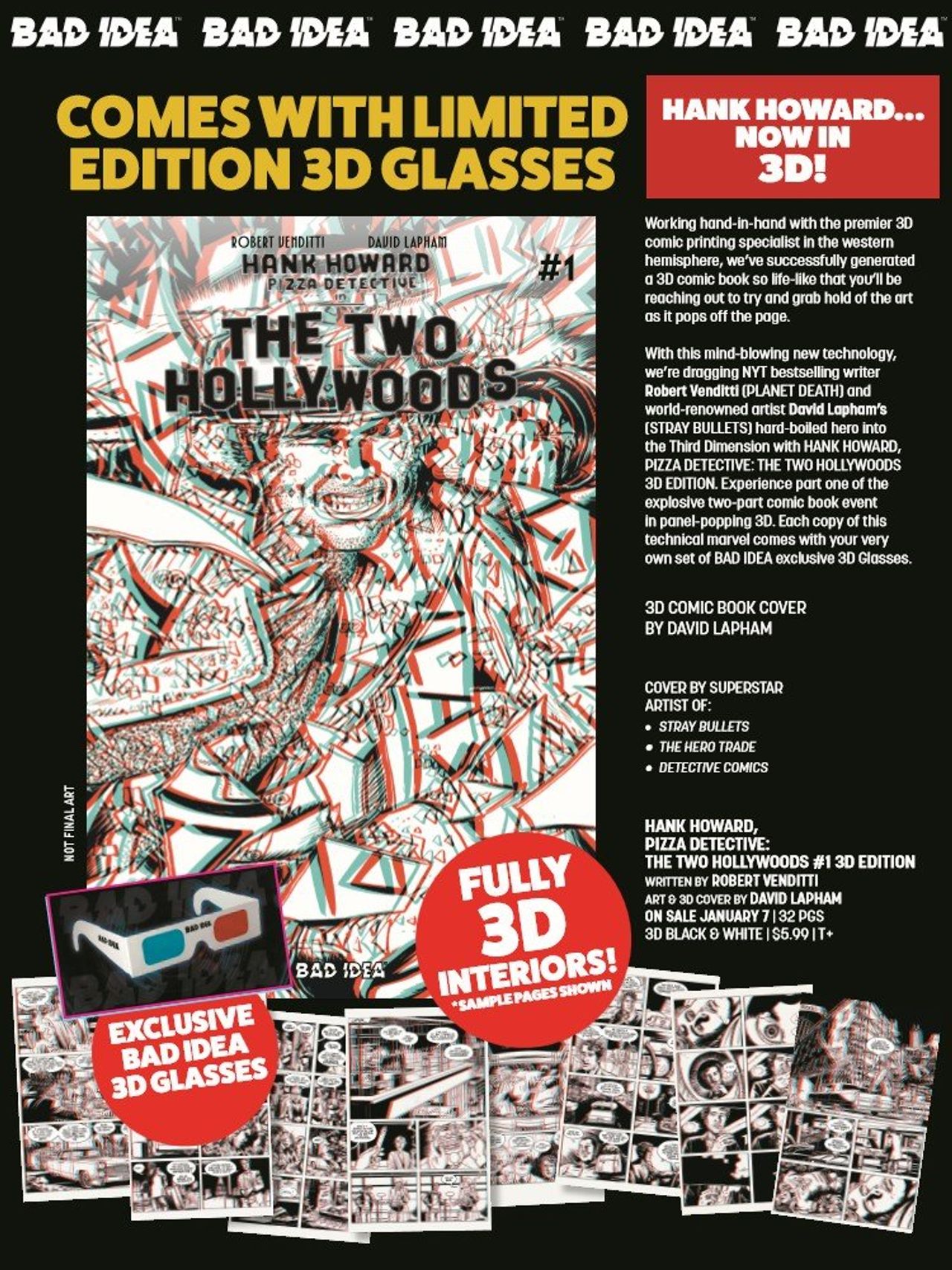 New York Times best-selling writer Robert Venditti and world-renowned comics legend, David Lapham (STRAY BULLETS, THE HERO TRADE), have combined powers to bring you a striking new vision in the fight against crime with the first issue in their explosive, two-part series -- HANK HOWARD, PIZZA DETECTIVE: THE TWO HOLLYWOODS #1! And we're giving you the chance to witness this bonafide blockbuster in 3D!