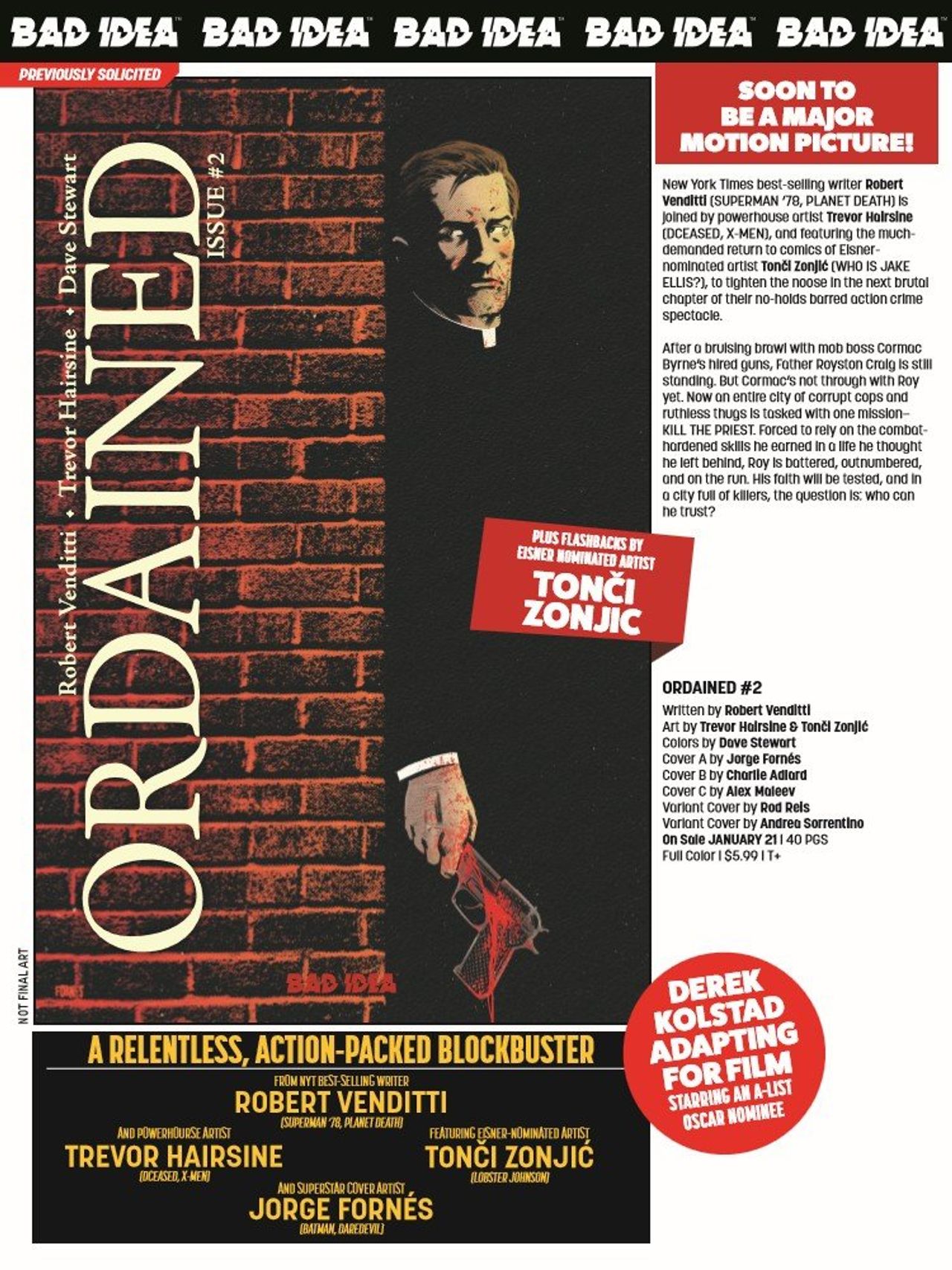 PLUS, New York Times best-selling writer Robert Venditti (SUPERMAN ‘78, PLANET DEATH) and powerhouse artist Trevor Hairsine (DCEASED, X-MEN) tighten the noose in the next brutal chapter of their no-holds-barred action spectacle ORDAINED. And this time, they're joined by Eisner-nominated artist Tonči Zonjić!