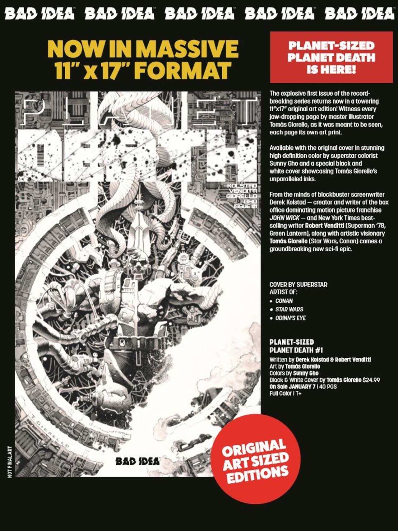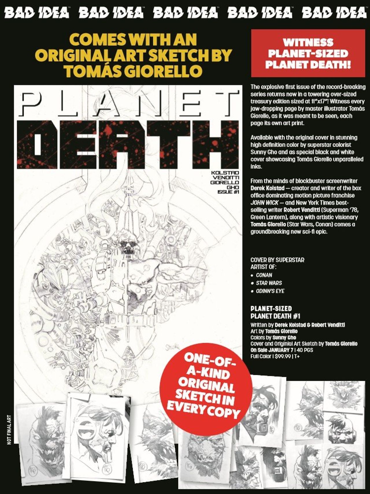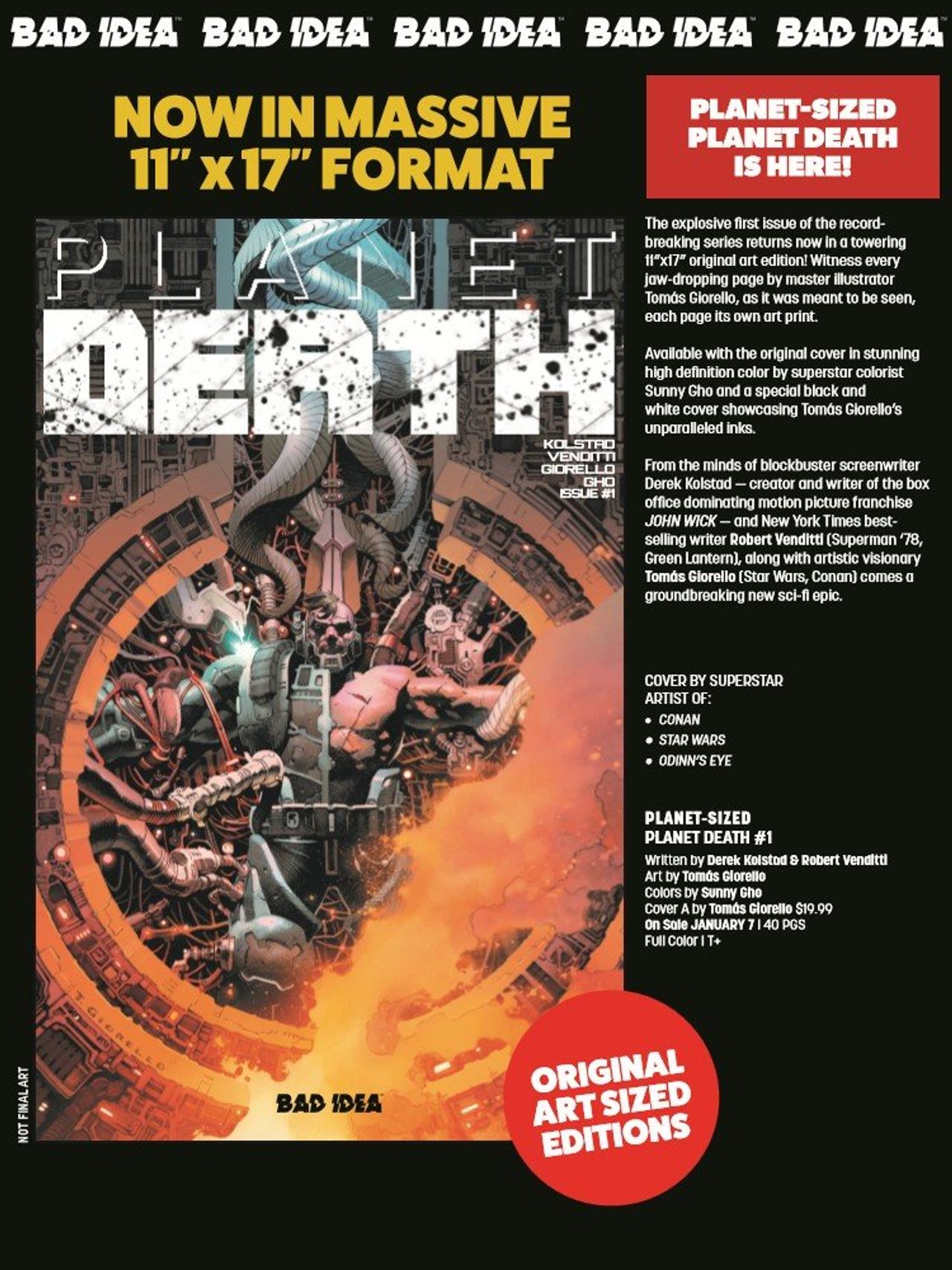 The explosive first issue of the record-breaking series, PLANET DEATH, returns now in a towering over-sized treasury edition sized at 11”x17” in PLANET-SIZED PLANET DEATH #1! Witness every jaw-dropping page by master illustrator Tomás Giorello, as it was meant to be seen, each page its own art print.