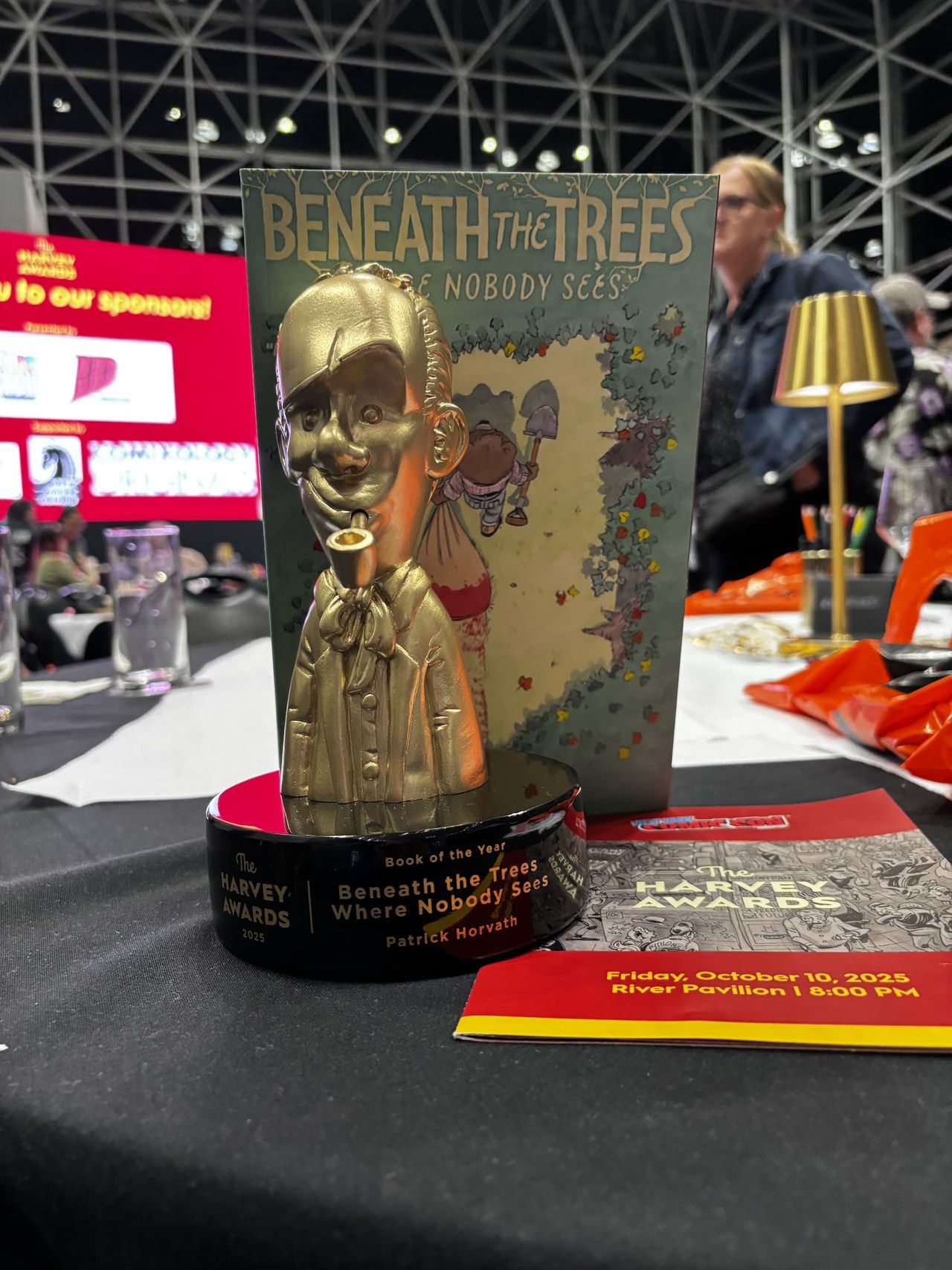 Patrick Horvath's BENEATH THE TREES WHERE NOBODY SEES, a brilliantly twisted creation, won "Book of the Year" at the 2025 Harvey Awards during New York Comic Con.