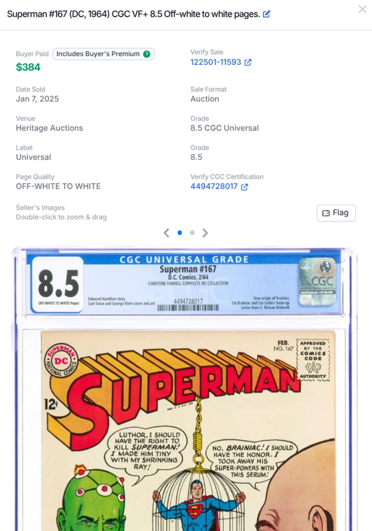 A much more affordable Silver Age Brainiac key is Superman #167 (1960), an issue that explains Brainiac’s new alien origins for the first time. And features the first Team-Up with Lex Luther. With 173 universal blue label issues on the CGC Census, this book has a light demand when it comes to collectors / dealers submitting this issue for grading. Throughout all of 2025, 8 copies sold, with this 8.5 selling for $384 at Heritage way back in January.