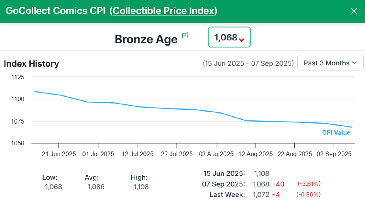 Overall, the Bronze Age CPI dropped 40 points from an index value of 1,108 to 1,068 over the past three months. That’s a cumulative index loss of 3.61% in just 90 days. There was no particular time period of note, just a sure and steady decline that’s steeper than the last time we reported on the index. Of the 50 comics in the index, five were gainers, 42 were losers, and three ended up where they started 90 days ago.