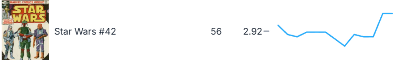 The first comic book appearance of Boba Fett – and Yoda’s first full appearance – had been spiraling downward for a while, so it’s nice to see at least a little upward movement. And it’s up despite declines in the average price in the 9.8 and 9.4 grades. The 8.0 through 9.2 grades all saw increases, the most impressive of which was the 8.5 grade, which climbed roughly $80 in average selling price. It’s too soon to say if this issue has hit rock bottom, unfortunately. The increase is far too modest to make any assumptions about future trends.