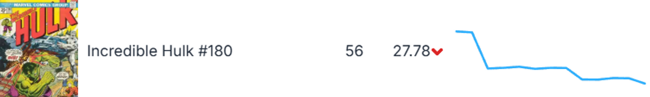 The Phoenix is not rising based on recent trends. Of course, this is a book whose value waxes and wanes with regularity; it could easily be one of the top gainers in our next report. The big culprit here was the 9.8, which saw the average price fall 28.8%. While there was an increase in the 9.6 grade, grades 9.4 through 9.0 saw declining values. The one bright note was the mid to high mid grades of 6.5 through 8.5, all of which (other than 7.5) showed increasing value, and the 7.5 only saw a modest decline of $10.