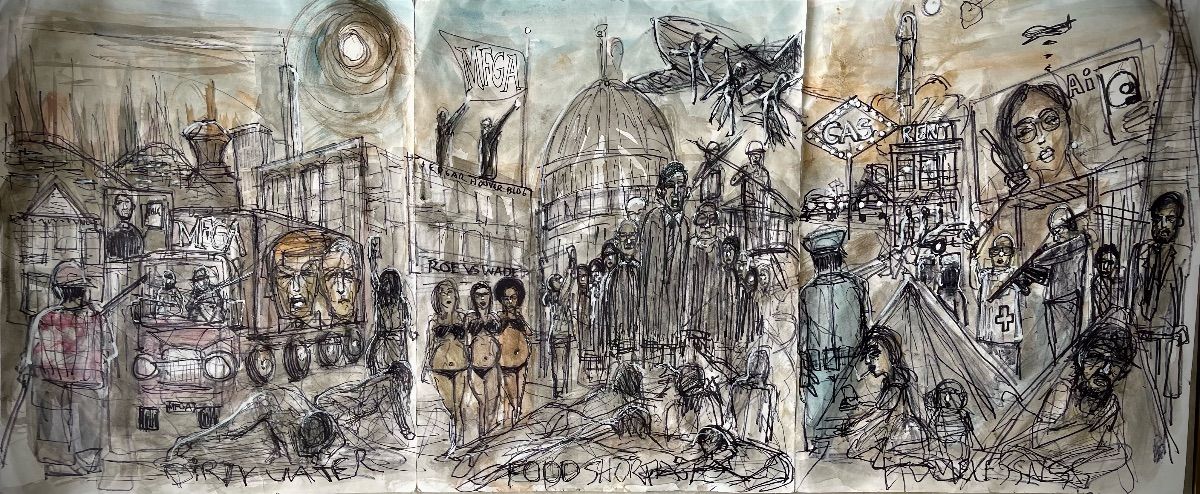 "We set out to make ROGUE STATE a comic that's politically charged but is optimistic and celebrates the history of radical art and street art. At first, Chuck was going to do one cover, but he went far beyond with this panorama of our modern hellscape, and as soon as I saw it I realized that it needed to be part of the story world itself," says Pizzolo. "It's like the most raging street art, and it conveys the inferno of horrors we all have burning away in our minds. The story is about staying hopeful enough to keep fighting, and Chuck captures that too. His work is never about wallowing in the turmoil, it's a call to arms."