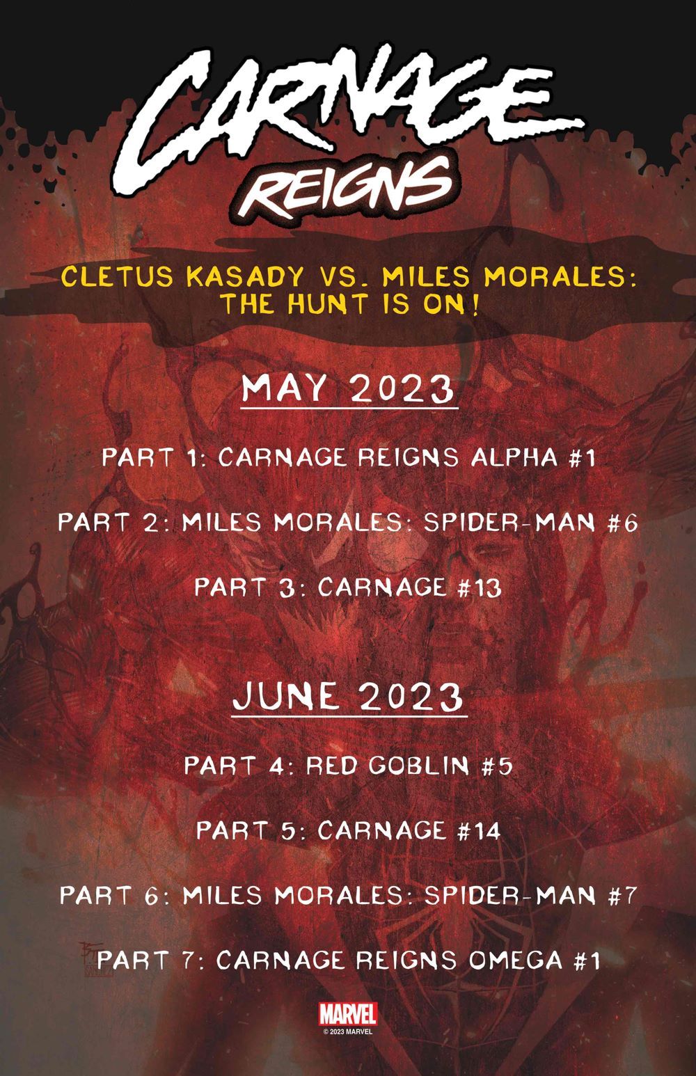 Check out a complete crossover checklist and all the CARNAGE REIGNS ALPHA #1 covers, including Taurin Clarke's connecting variant that will on the first three parts. See how far Carnage is willing to go to satisfy his hunger, and if Miles can step up to stop him when CARNAGE REIGNS ALPHA #1 arrives on May 3!
