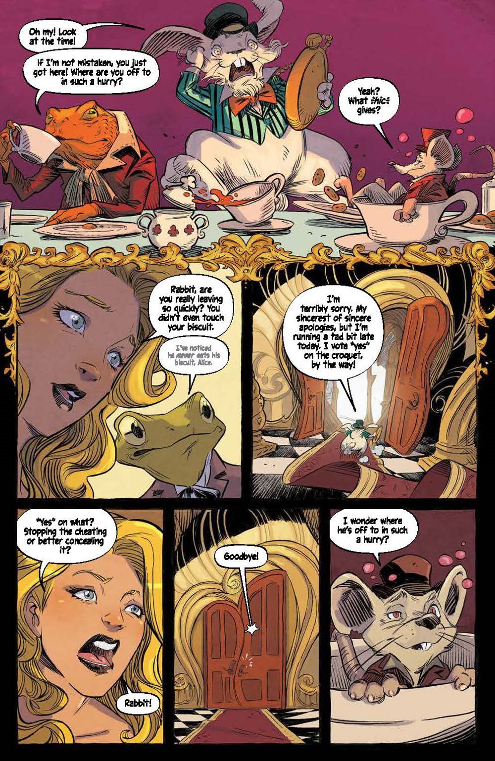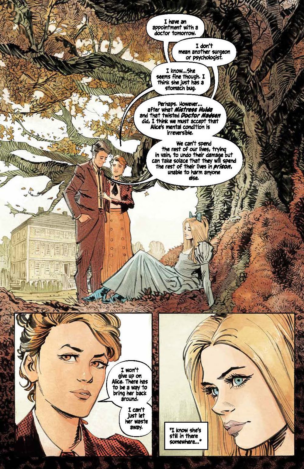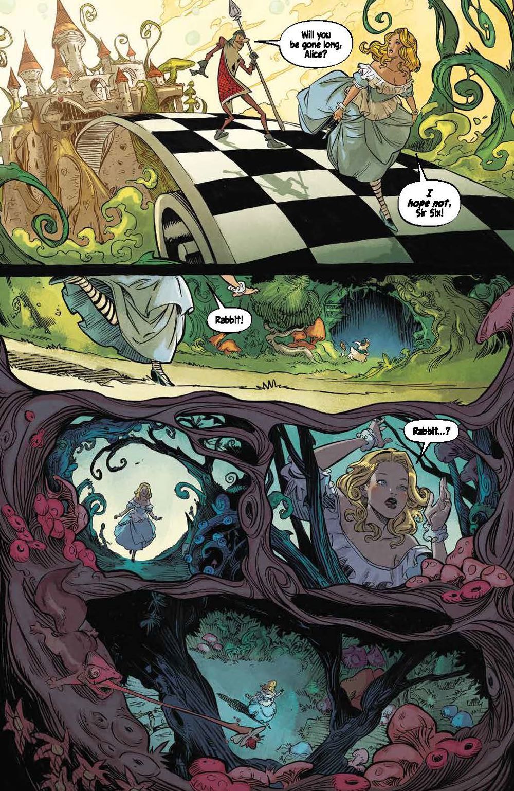 NEW SERIES. New Twists and Turns Into the Darkest Corners of Dan Panosian's Wonderland! Alice finally got her wish. Wonderland has become her new home, but with her abuser's avatar with the uncanny grin turning the mad residents of a moonstruck world against her, she's clawing for a little rationality amongst the chaos. As Alice's sister Edith and her childhood friend Earl fight for a way to bring her back, Alice has to contend with whether or not her torment is due to her father, herself, or maybe a curious combination of both… Superstar writer Dan Panosian (Unkindness of Ravens, Black Tape) and artist Giorgio Spalletta (007: For King & Country) explore the morbid side of escapism in this twisted tale that blurs the line between fantasy and reality.