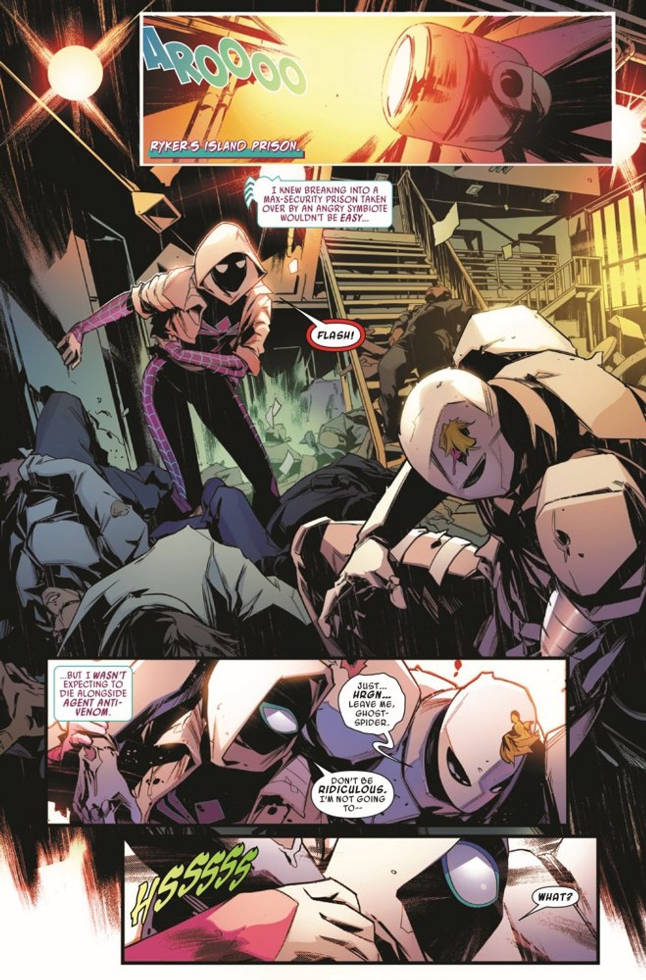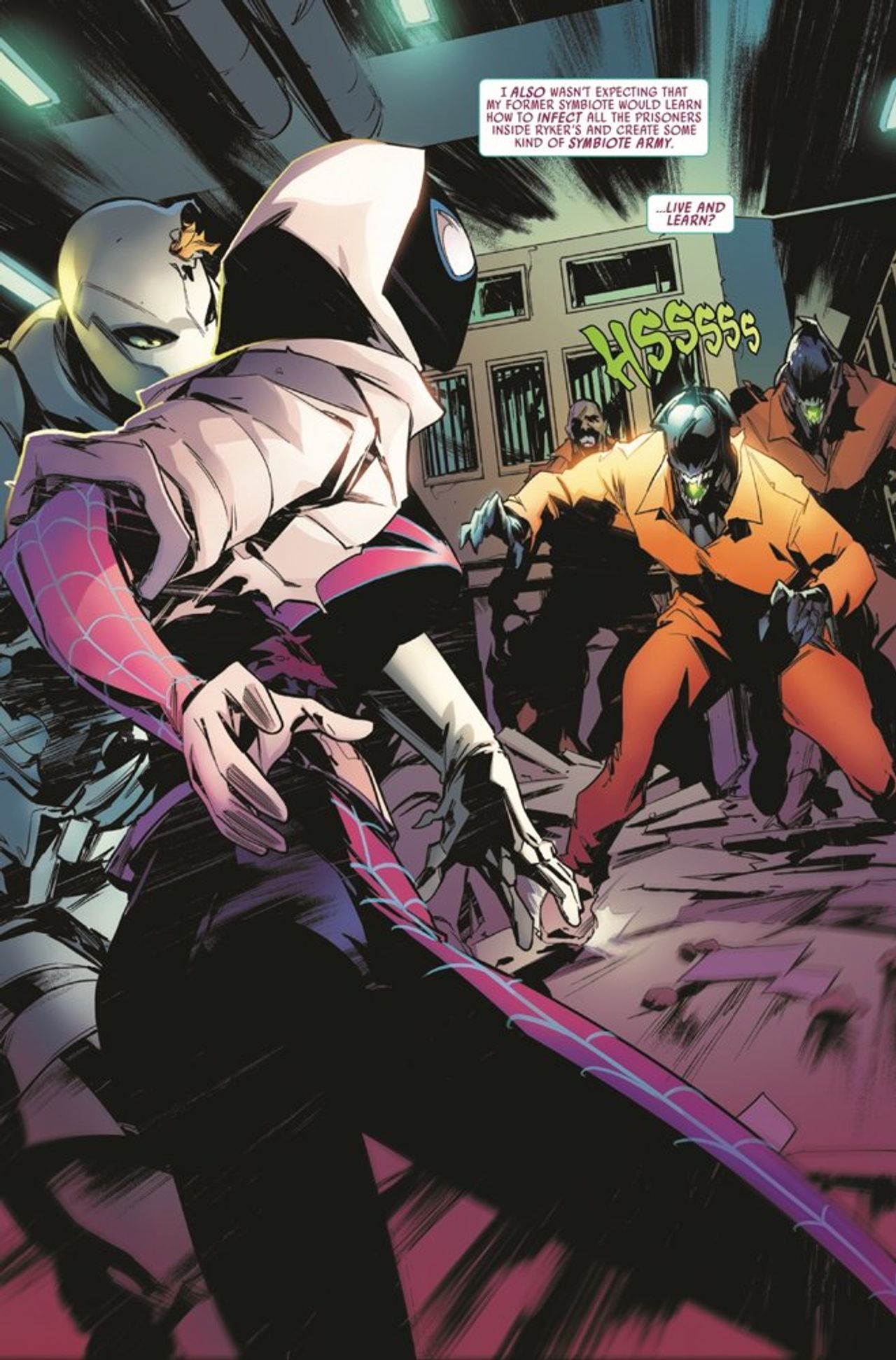 PANIC! AT THE PRISON! Tantrum has taken over Ryker's Island, creating an army of symbiote-d prisoners, and government soldiers are at the doors! Can Gwen stop Tantrum before the military levels Ryker's to the ground?