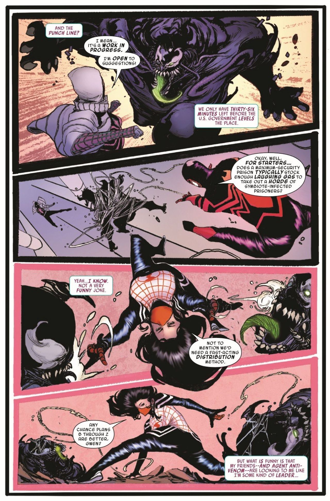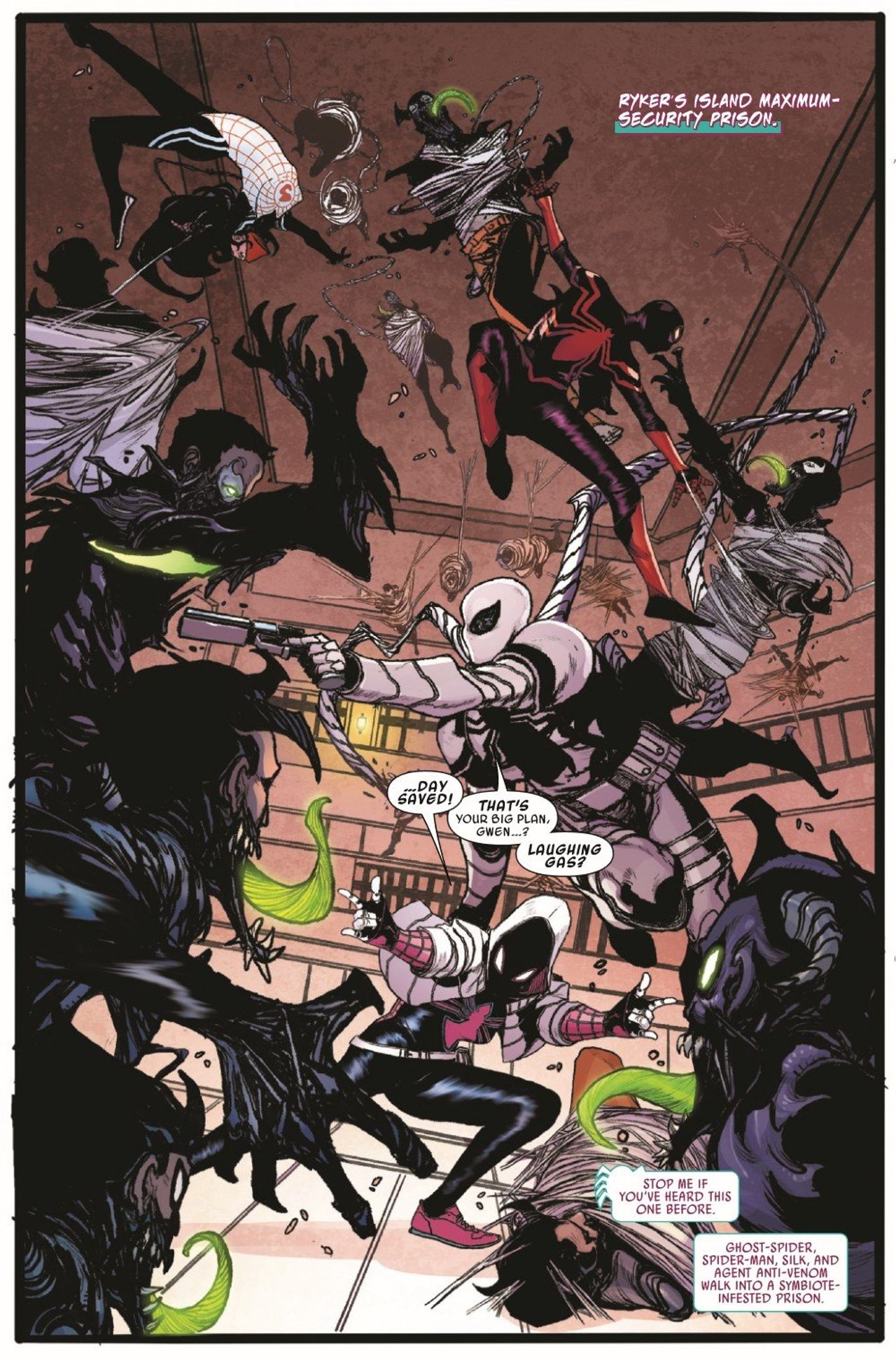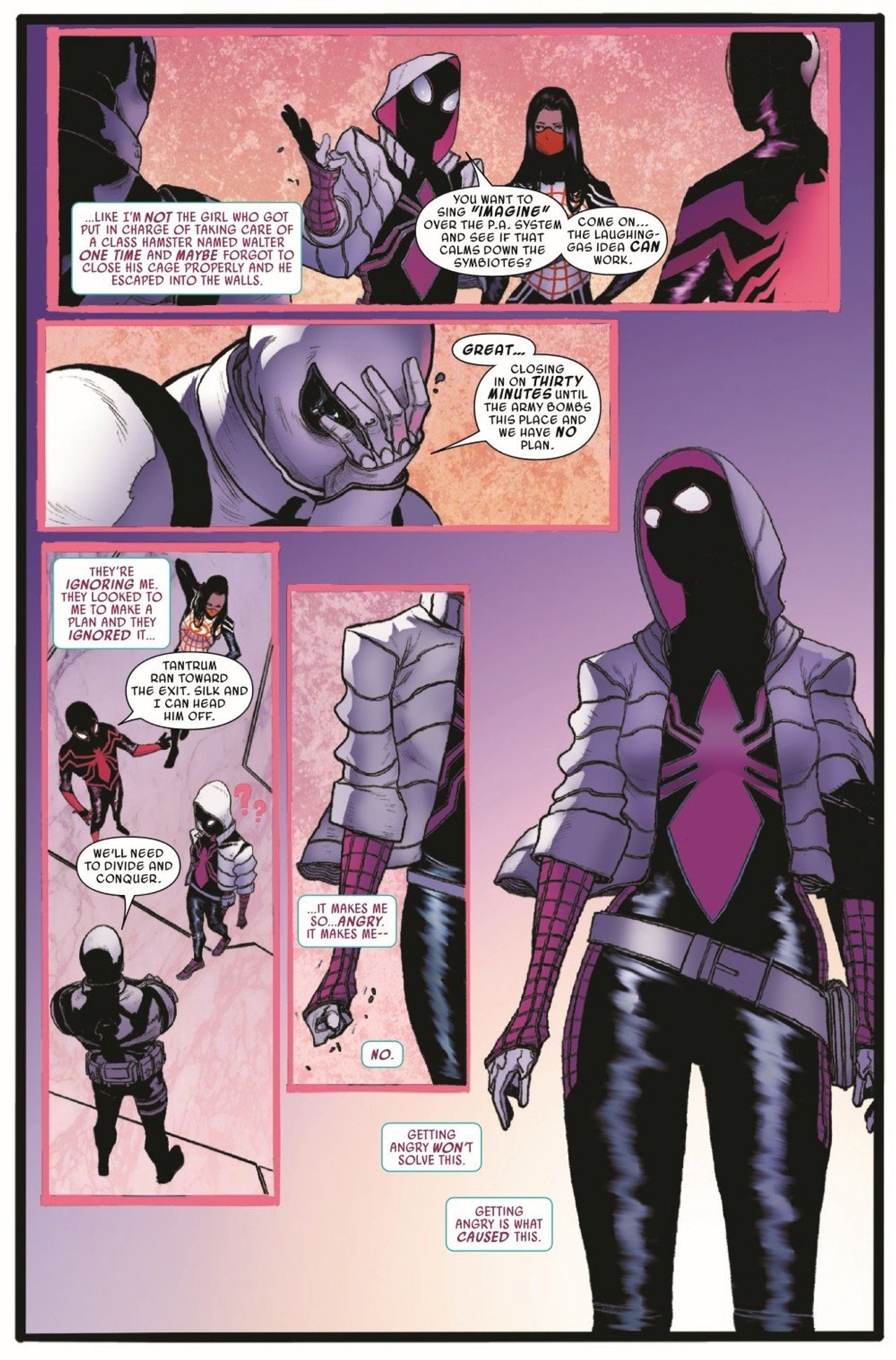 CAUGHT IN HER OWN WEB?! Ghost-Spider is ensnared in a web of trouble she stirred up herself! Thankfully, she has friends on her side in the form of Silk, Miles Morales and new ally Agent Anti-Venom, Flash Thompson! Is it enough to overcome a foe fueled by their own anger?