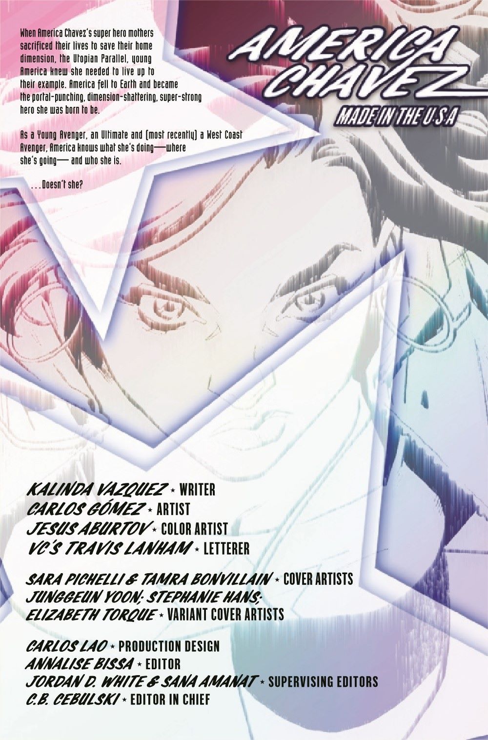 WHO IS AMERICA? America Chavez is incredible - her origins, her strength, her dimension-shattering star portals! But when the foundation of everything she believes is shaken, America will stand up and face the parts of herself she's been running from. From writer Kalinda Vazquez (Marvel's Runaways) and artist Carlos Gomez (Amazing Mary Jane) comes an explosive, brand-new story all about what made America Chavez who she is - and what she'll do to protect the ones she loves.