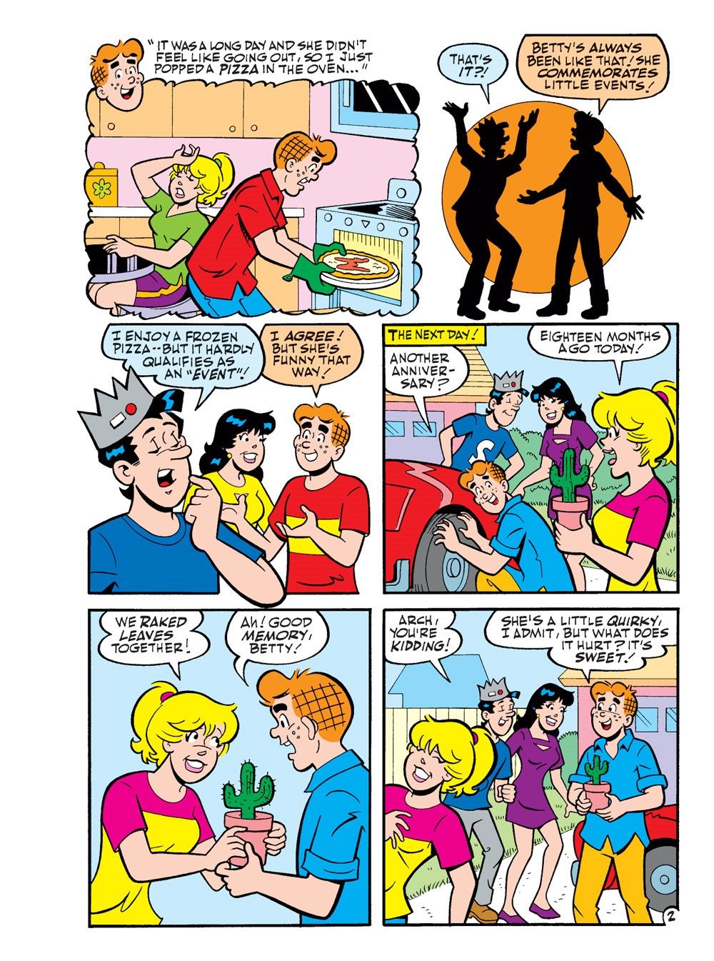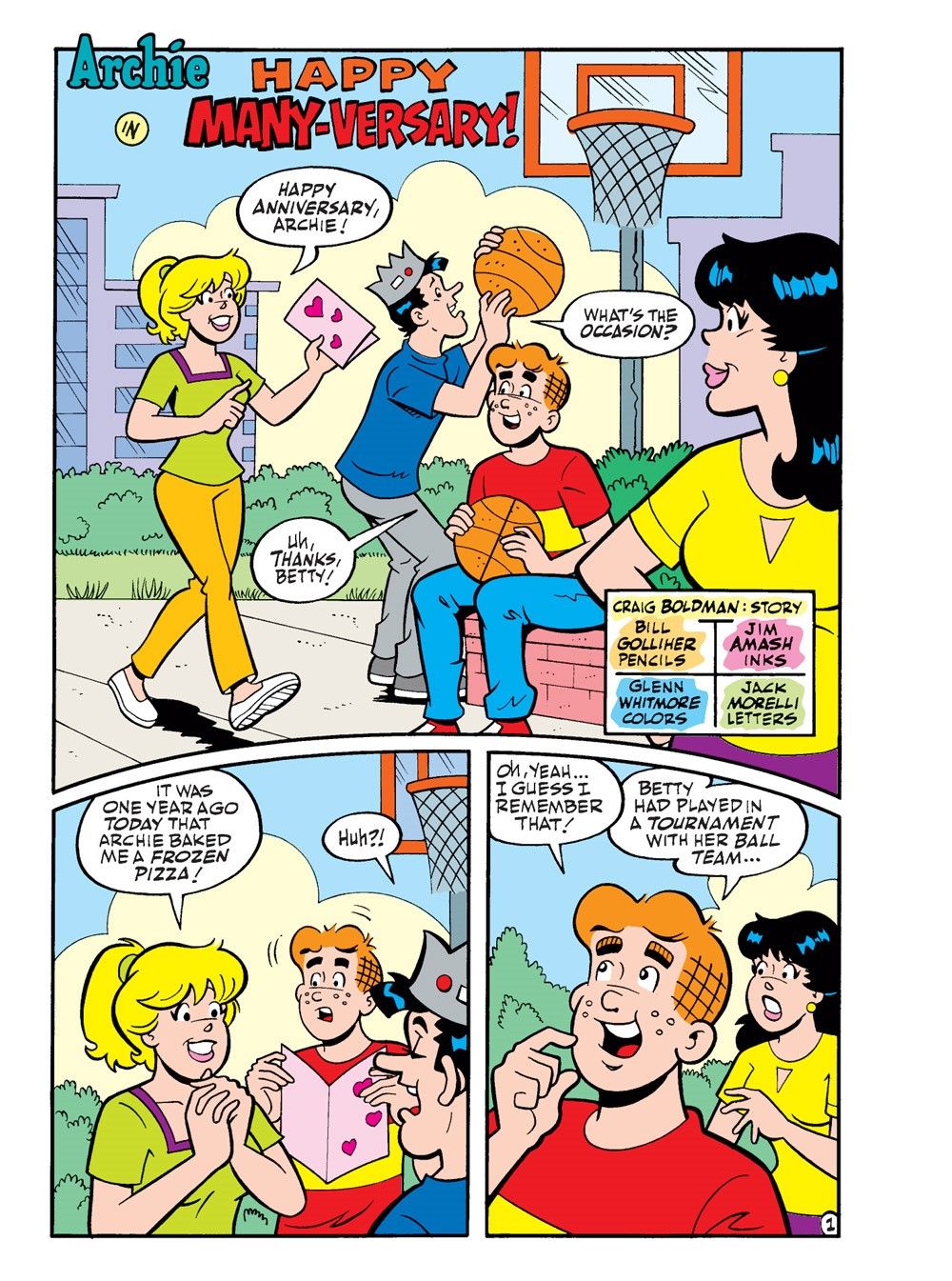 NEW CLASSIC-STYLE STORY: "Happy MANYversary!" Betty has a habit of keeping track of and mentioning every type of minor anniversary, such as the anniversary of the first time she and Archie watched a certain movie, played a certain video game, visited a particular comics shop, etc. Archie finds it charming, but could there be such a thing as too much celebrating?