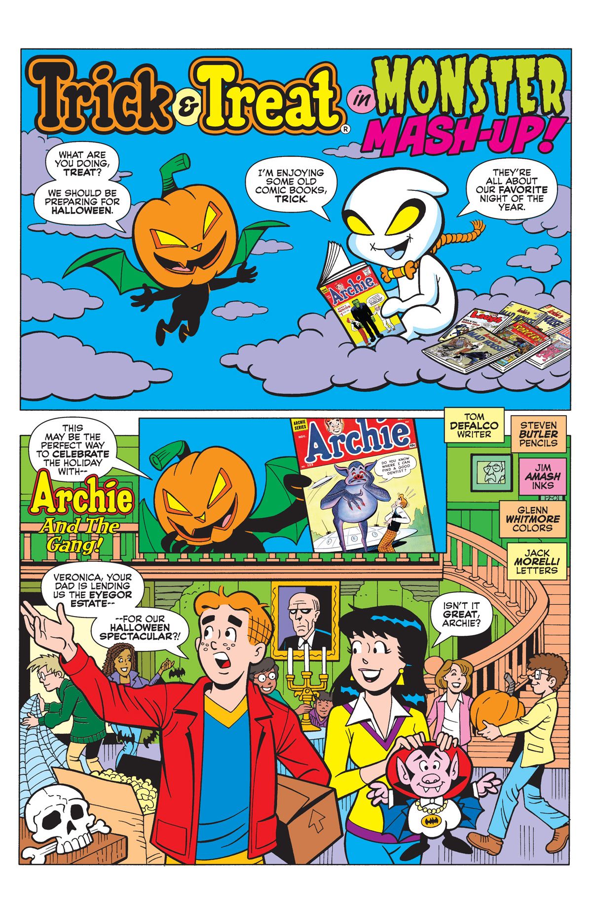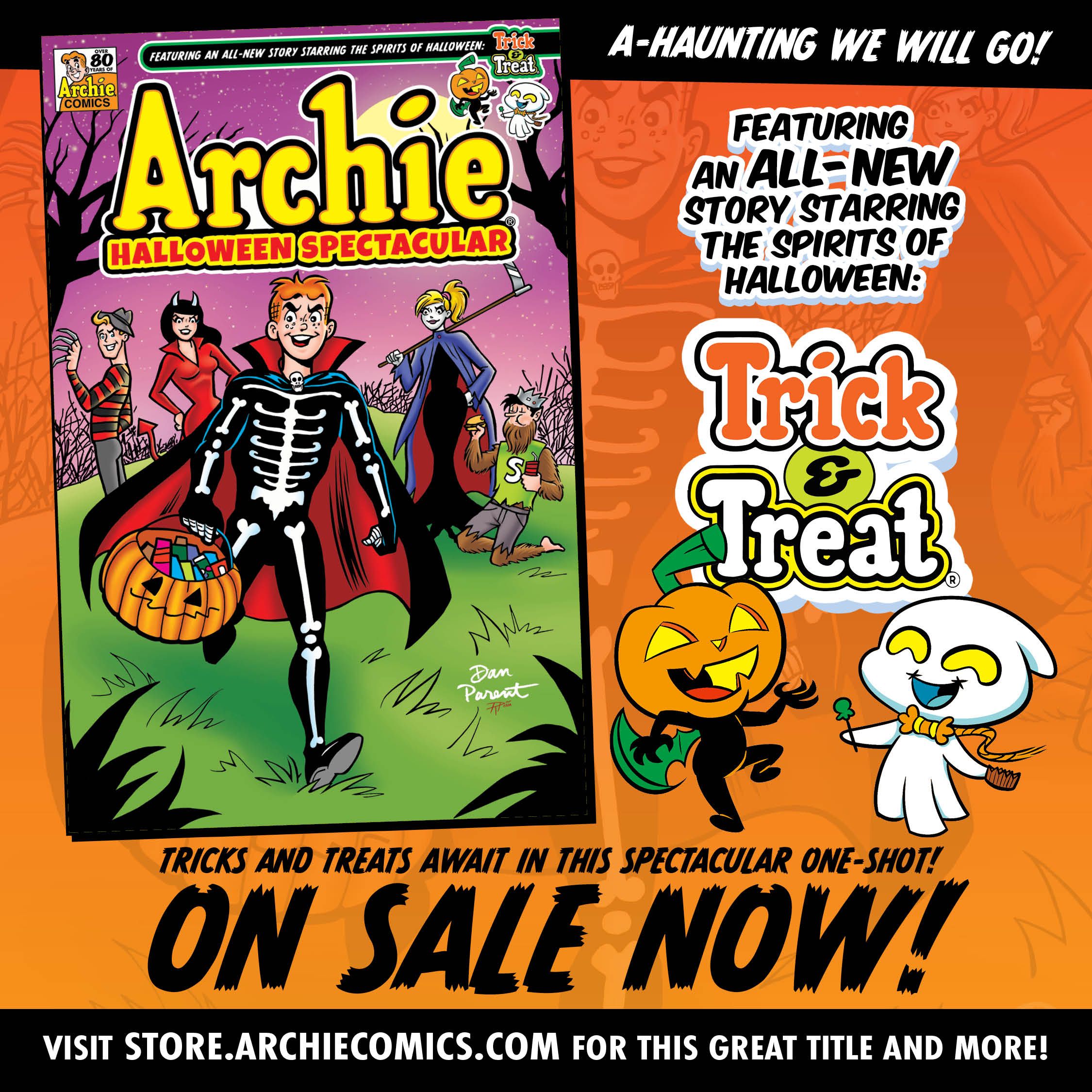 BRAND NEW STORY: "Monster Mash-Up!" Trick and Treat return on Halloween night to harass Archie and Jughead with assorted monsters until Sabrina takes charge. All that plus more scary-fun stories!