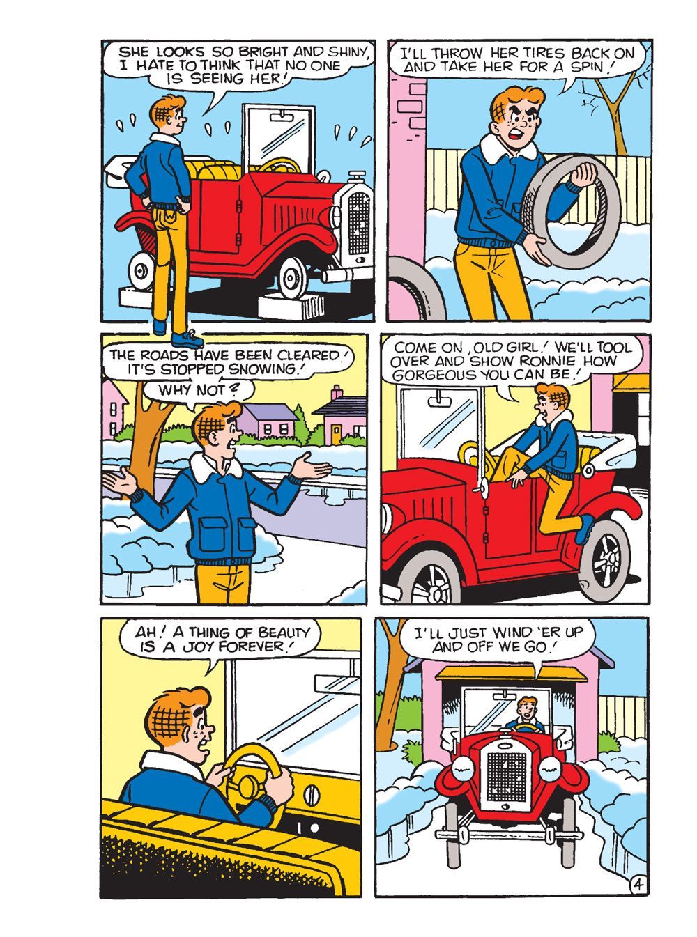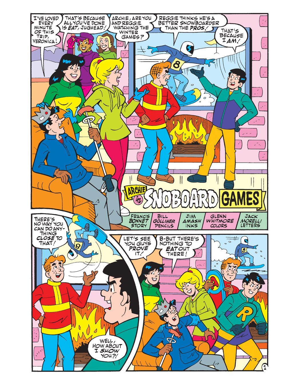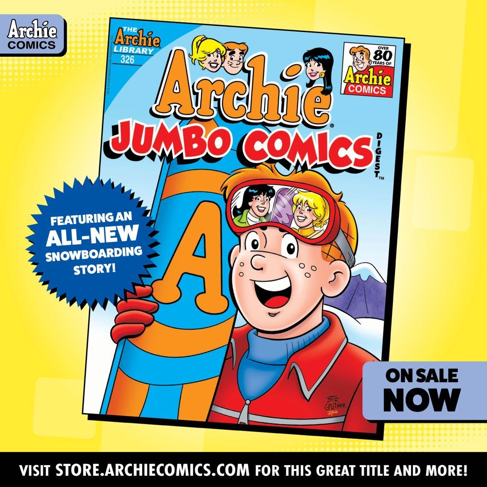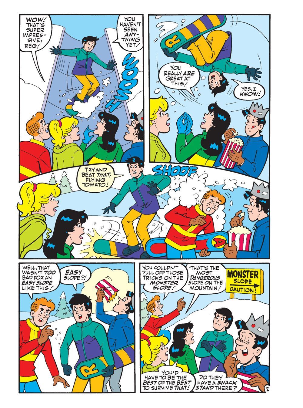 NEW CLASSIC-STYLE STORY: "SnoBoard Games" Archie, Betty, Veronica, Jughead, and Reggie are on a snowboarding trip in the mountains. While watching the Winter Olympics on TV in the lounge, Reggie brags that his snowboarding skills rival the professionals. Archie is skeptical, but when Reggie impresses the girls with flips and other tricks on the slope, Archie becomes jealous. Does Archie have what it takes to outdo Reggie on the "Monster Slope," the scariest, most dangerous slope on the mountain? Or will it be a total wipeout?