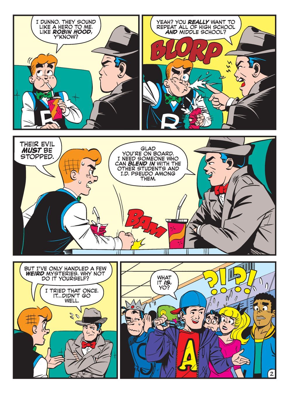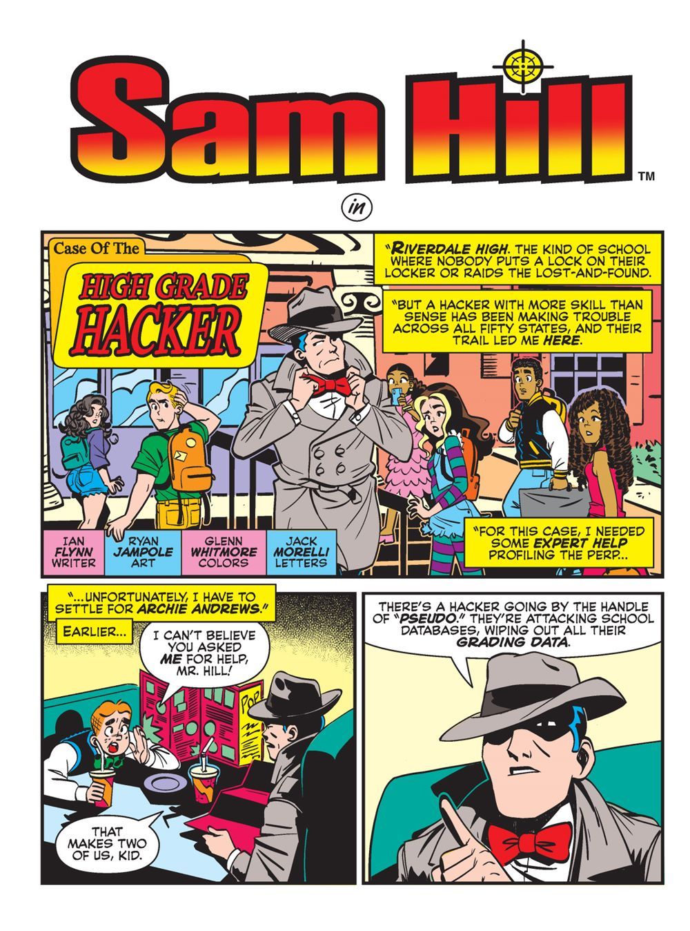 Then, in "Case of the High Grade Hacker!" An internet threat known only as "Pseudo" has come to Riverdale. They're attacking school databases, and wiping out all students' grading data. Worried that this will cause Archie to have to repeat the school year, he enlists the help of Detective Sam Hill to crack down on this hacker!