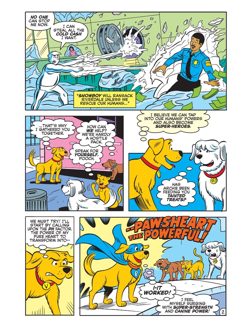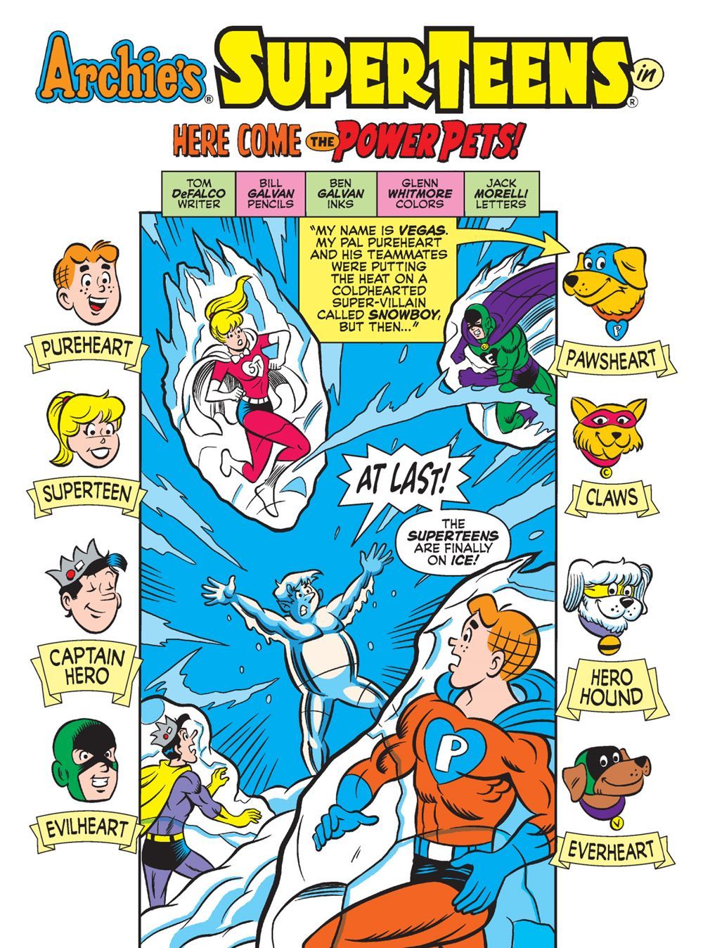 Then, in "Here Come the Power Pets!" The Superteens battle an evil villain called Snowboy. As Snowboy uses his powers to put the Superteens in a deep freeze, Archie's beloved dog Vegas realizes that he's got to find a way to rescue them. He gathers Vader, Hot Dog and Carmel and convinces them to join him. Our new heroes become the Power Pets, but do they have what it to rescue their humans?