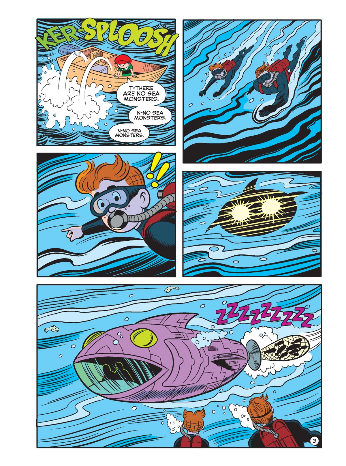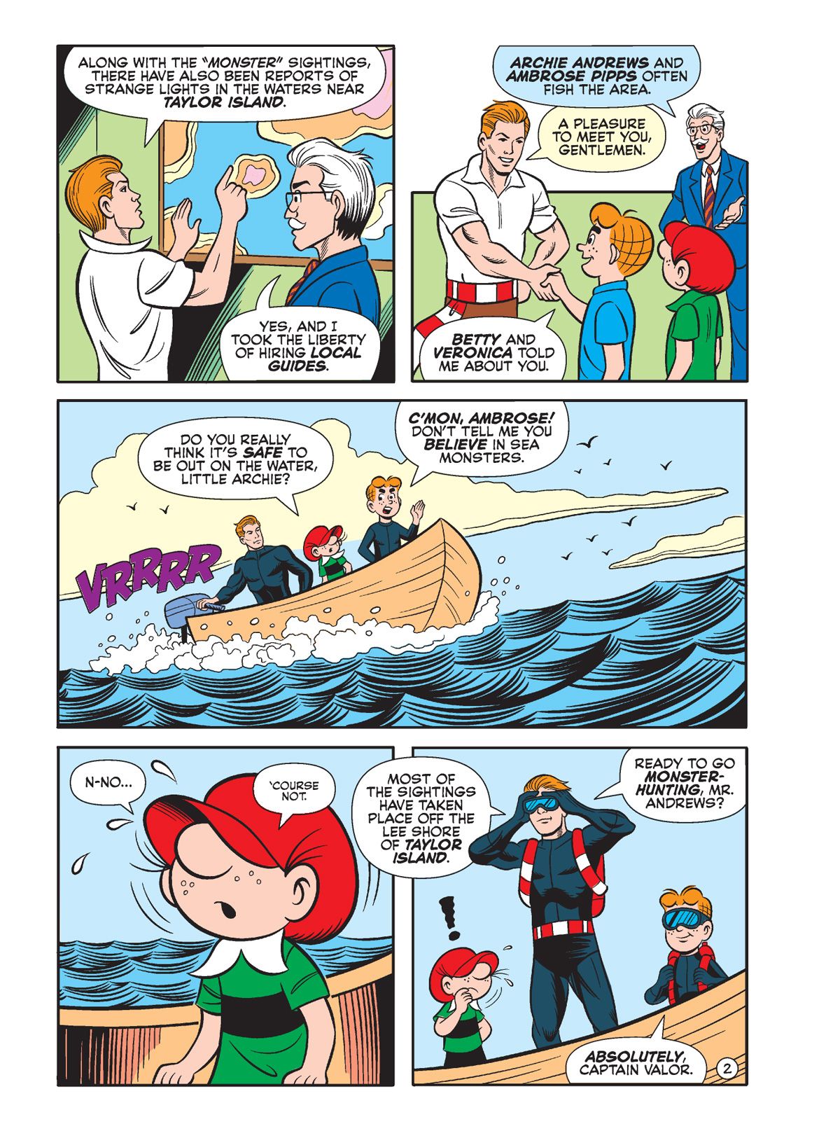 TWO BRAND NEW STORIES! First, in "The Beast of Bolling Bay," Something shatters a rowboat on Bolling Bay, almost drowning two fishermen. Was it a giant turtle or some other unidentified sea monster? Assuming there must be a logical explanation, Mr. Lodge hires Captain Valor to investigate and suggests he take Little Archie as a local guide since he and his friends often fish the area. Will Captain Valor, Little Archie and his friend Little Ambrose be able to find out the truth about the "monster"?