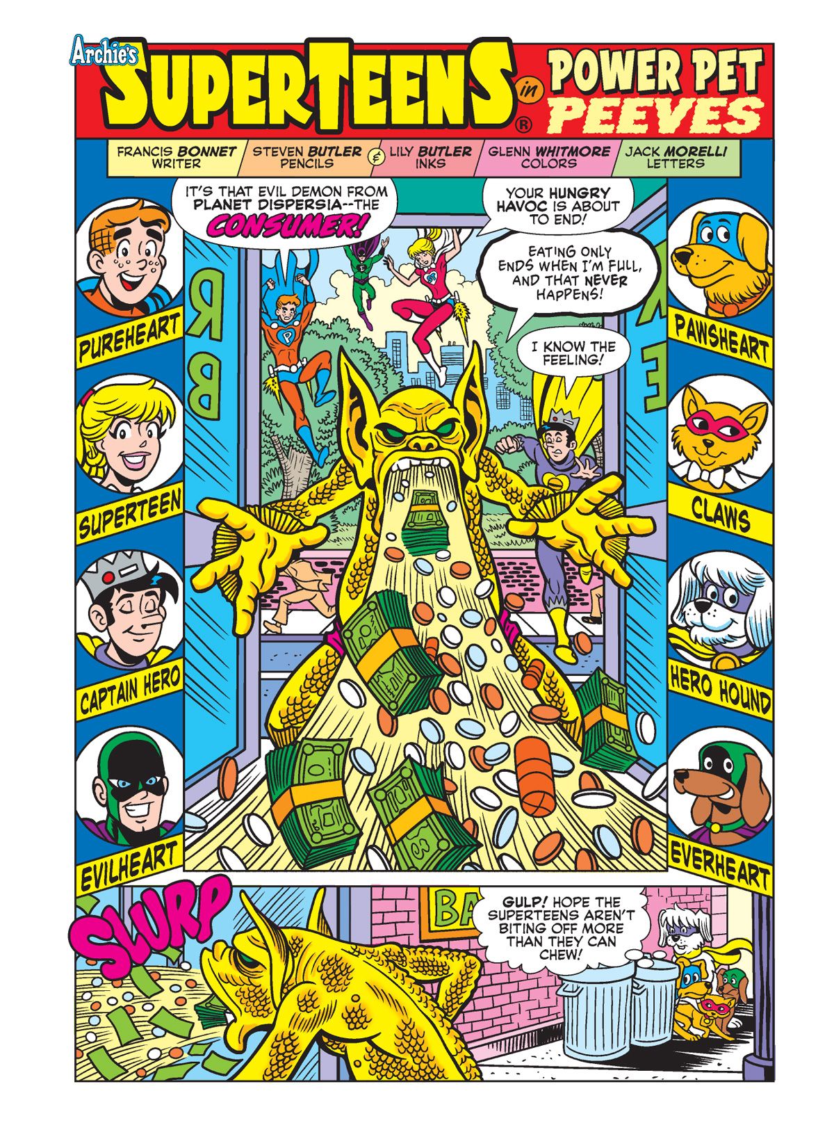 TWO BRAND NEW STORIES! First, in "Power Pet Peeves," the Superteens get word that a handful of supervillains are loose in Riverdale. As the team goes to stop these villains, the Power Pets tag along unnoticed. But when our teen superheroes come face-to-face with a villainous bank robber, the Power Pets leap into action!