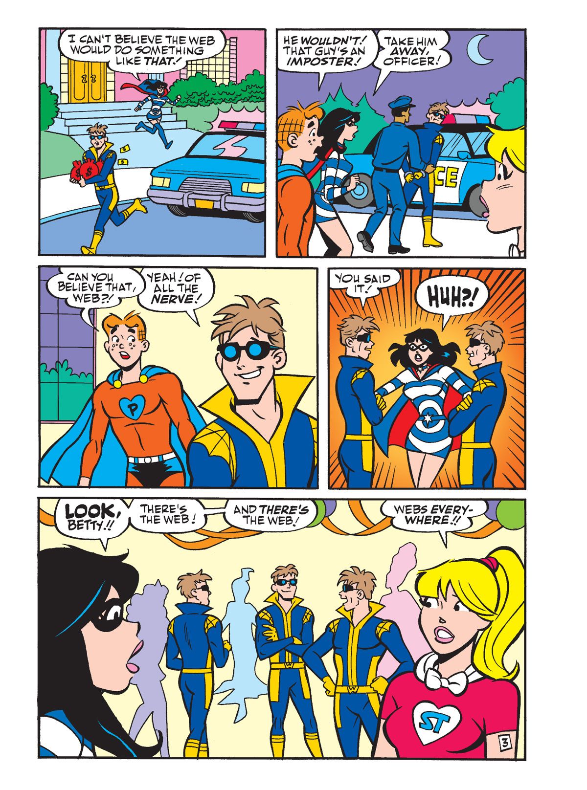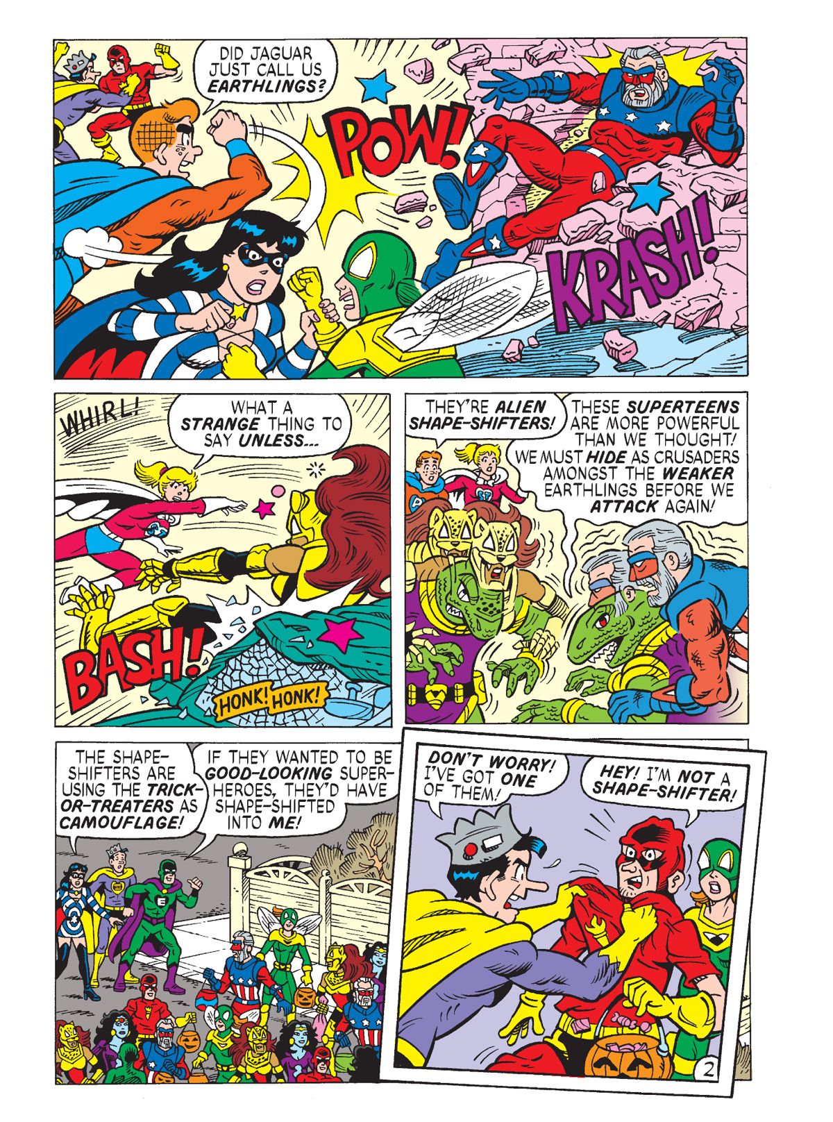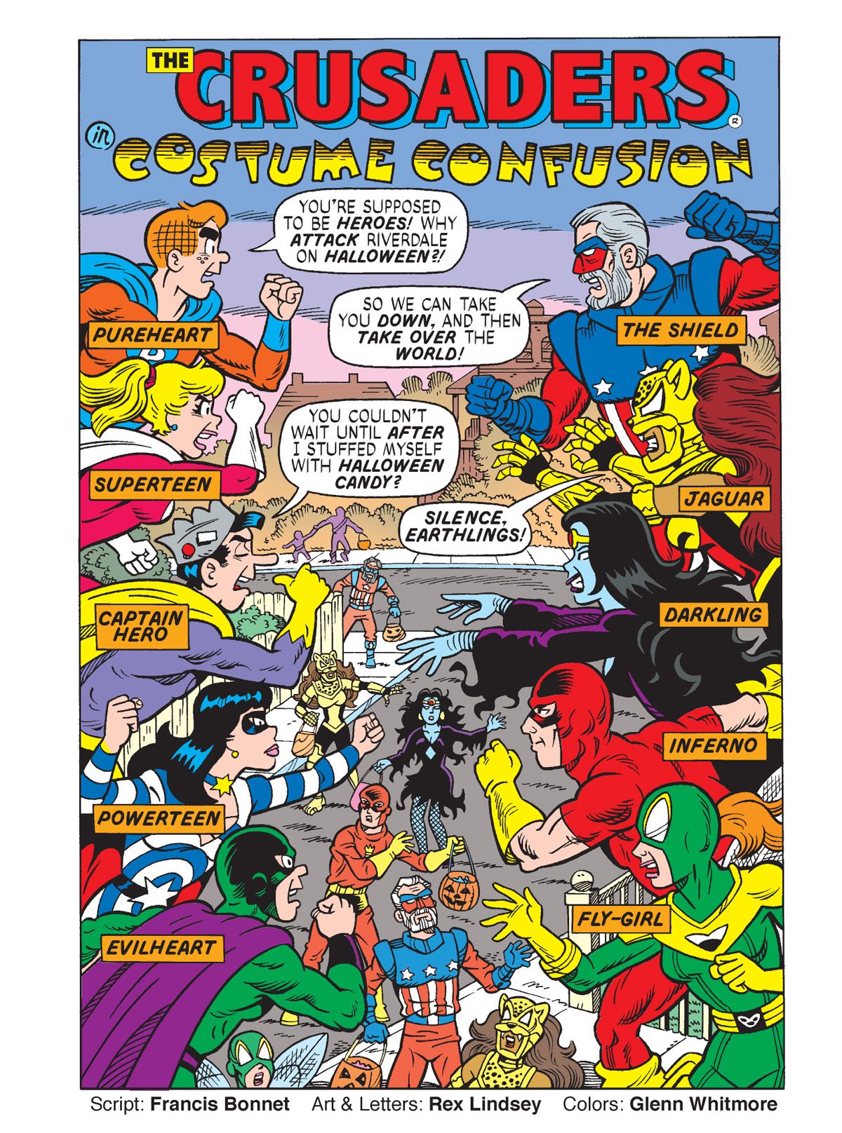 TWO BRAND NEW STORIES! First, can the Crusaders and Superteens trust each other as they face off against a group of shape-shifters, or will they end up fighting themselves? Then, THE WEB makes a surprise appearance at the Lodge Halloween party—but is it the actual Web or a costumed imposter?