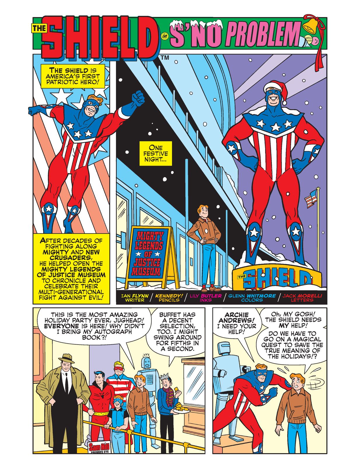 TWO BRAND NEW STORIES! First, the Shield enlists Archie in finding a dangerous artifact before the winter celebration becomes a disaster! Then, CHRISTMAS IS CANCELED!? When Ethel reads a rumor online that Santa won't be delivering presents to Riverdale this year, everyone is up in arms! Could this be true or is it just internet misinformation?