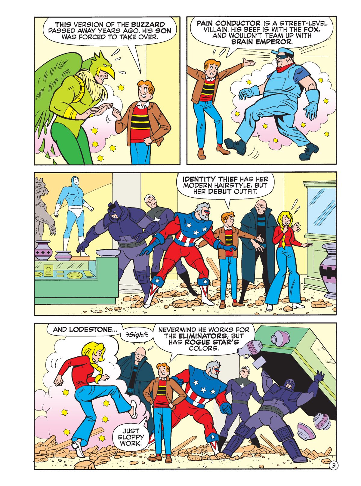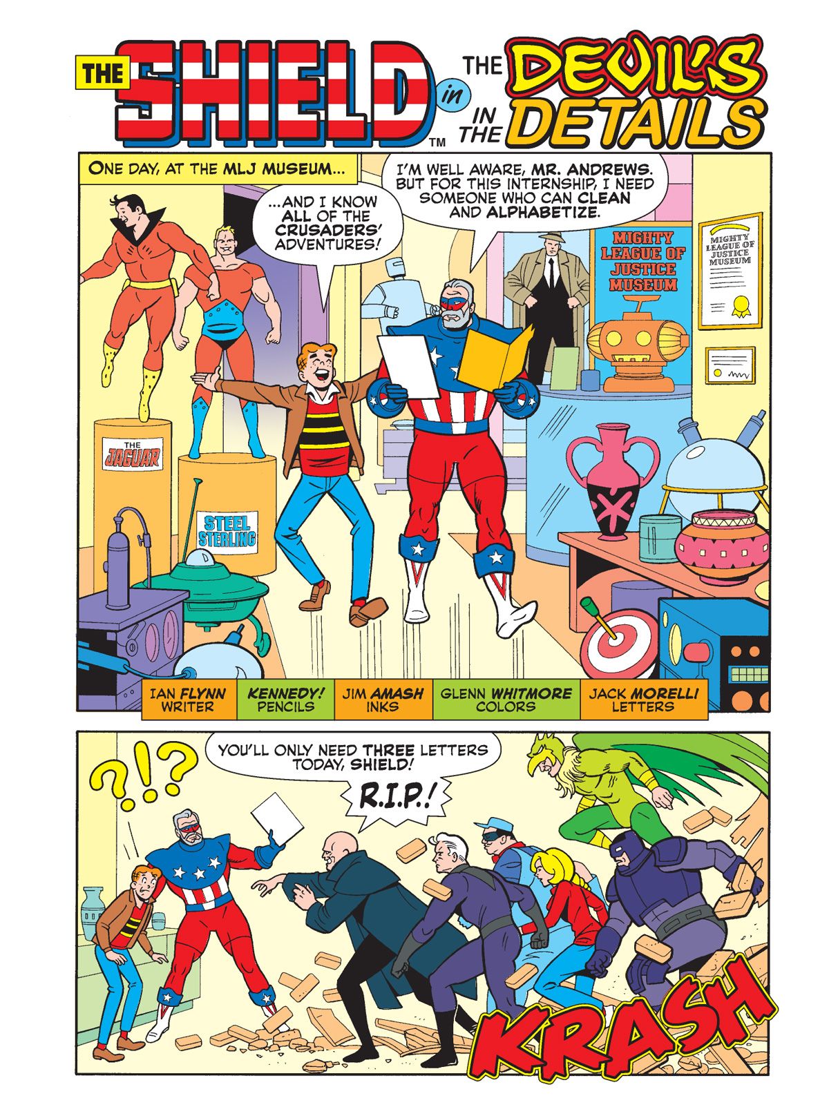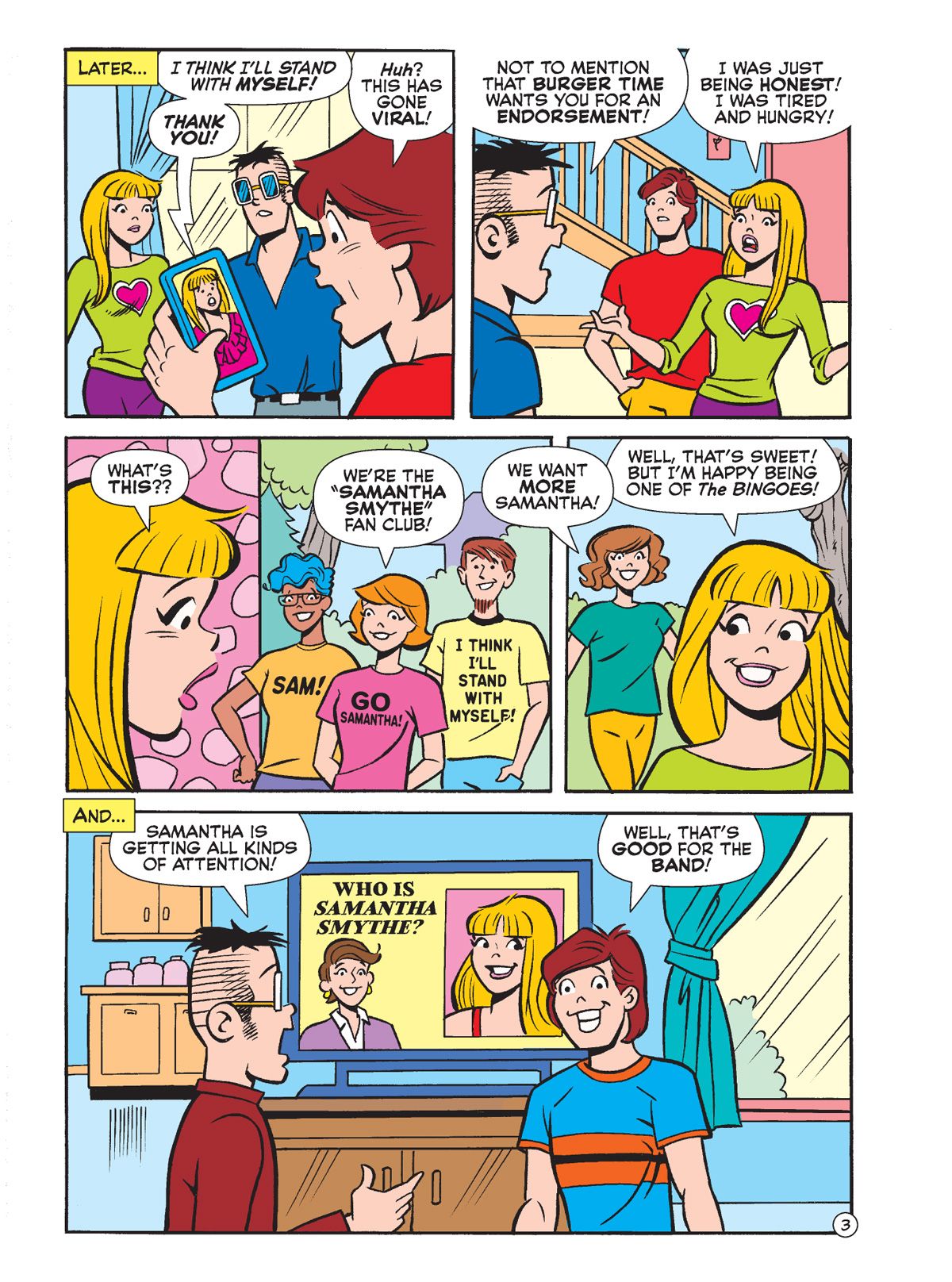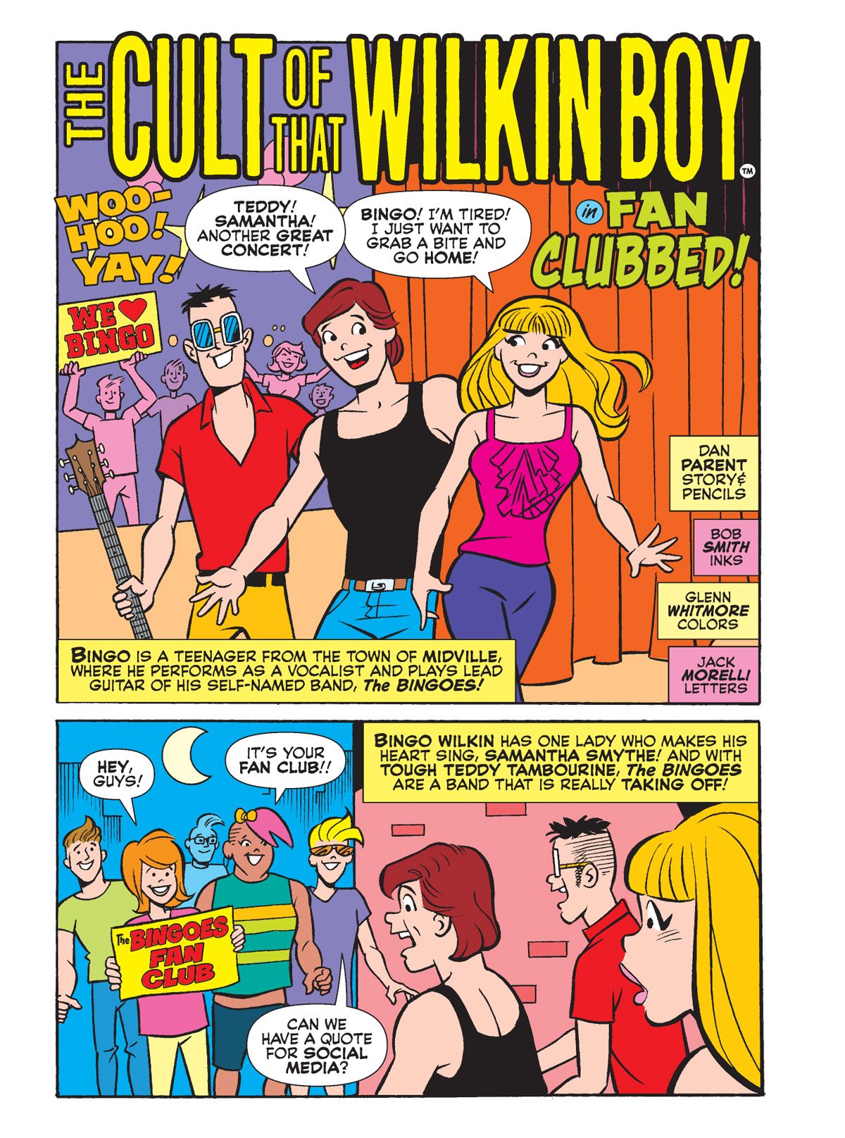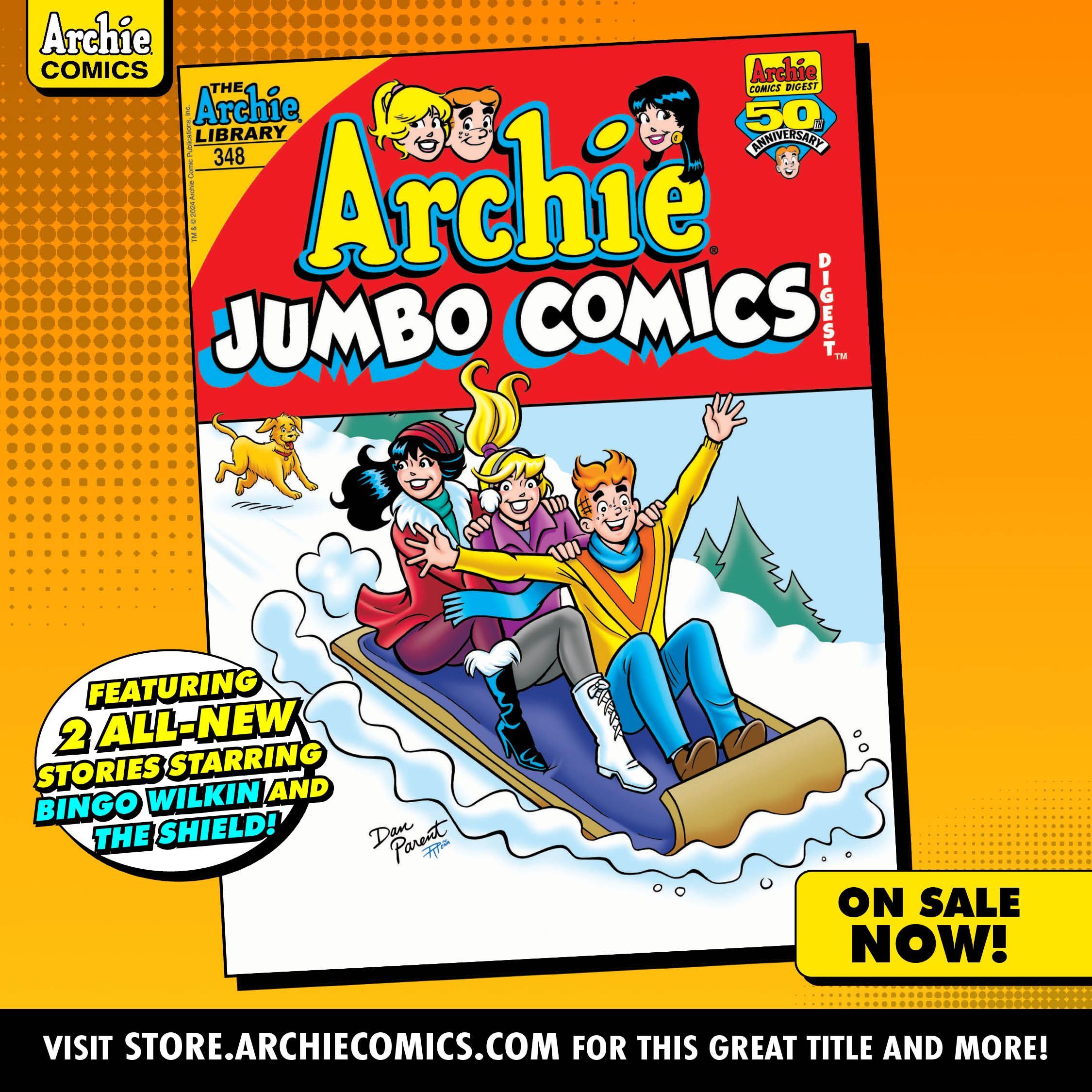 TWO BRAND NEW STORIES! First, Archie saves the day for Shield with the super-power of super-fandom! Then, Bingo Wilkin's new song has gone viral! Unfortunately, the song is so popular that Bingo can't go out in public without being swarmed by fans. How will he manage to celebrate his anniversary with Samantha? Maybe Archie and Jughead can help!