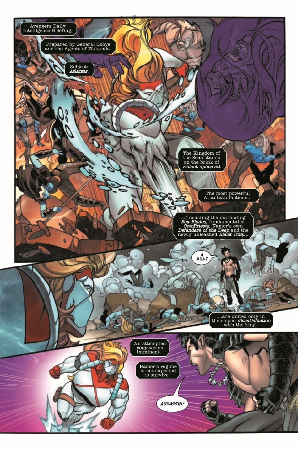 "WORLD WAR SHE-HULK" Goes Nuclear! War beneath the waves. The Winter Hulk has been sent to Atlantis with a dark mission. And things will get even darker and bloodier if the Russian super-assassin Red Widow has her way. But no matter who wins, She-Hulk and the Avengers will be changed forever! And next month, it all explodes in AVENGERS #750!
