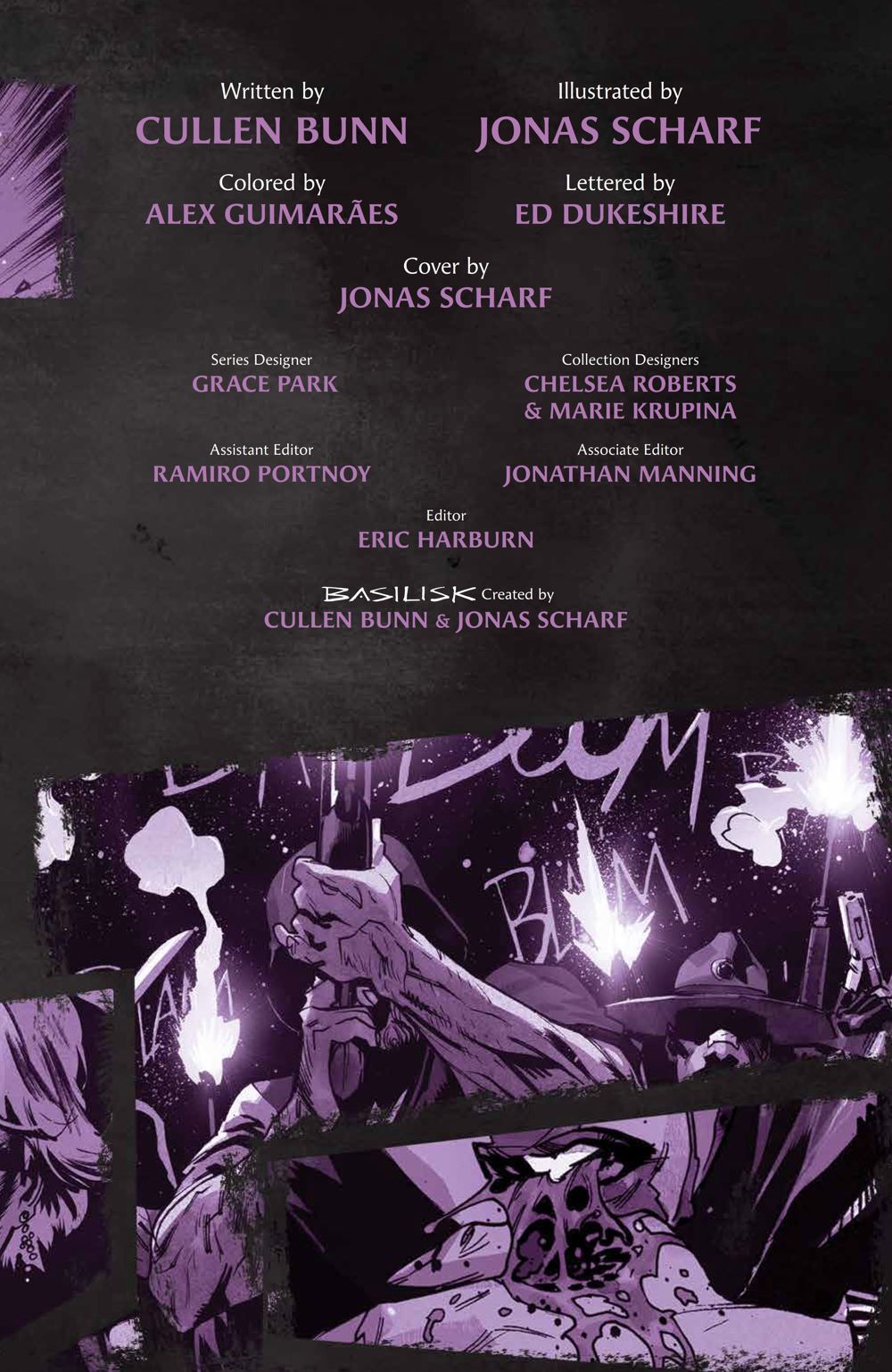 After the shocking conclusion of the first volume, the remaining members of Chimera regroup, sullen. Vanessa confesses she heard Manny's prophecy, and says they have a destiny to fulfill… a sacrifice. Meanwhile, Regan is hesitant to tell Hannah about the prophecy, but before she can, she's overwhelmed by auditory pain, and Hannah hears a hauntingly familiar voice as she tries to help Regan... New York Times bestselling horror writer Cullen Bunn (Harrow County, The Empty Man) reunites with his Bone Parish co-creator, artist Jonas Scharf (Avengers Of The Wasteland), to continue the second chapter of their hit rural horror series laced with supernatural fantasy rooted in the way we process the world—our senses. Collecting BASILISK #5-8.