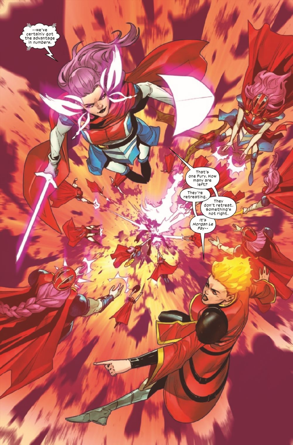 TWO CAPTAINS - ONE COUNTRY - AND ONE HELL OF A FIGHT! Britain has a new champion - but don't be mistaken, she's been here for years. Morgan Le Fay is back for vengeance, and Captain Britain is first on her list! But where one captain fails, another may suffice…and Peggy Carter's got a right hook that would inspire the devil herself. Magical machinations and feral fisticuffs abound in Tini Howard and Vasco Georgiev's continuing epic!