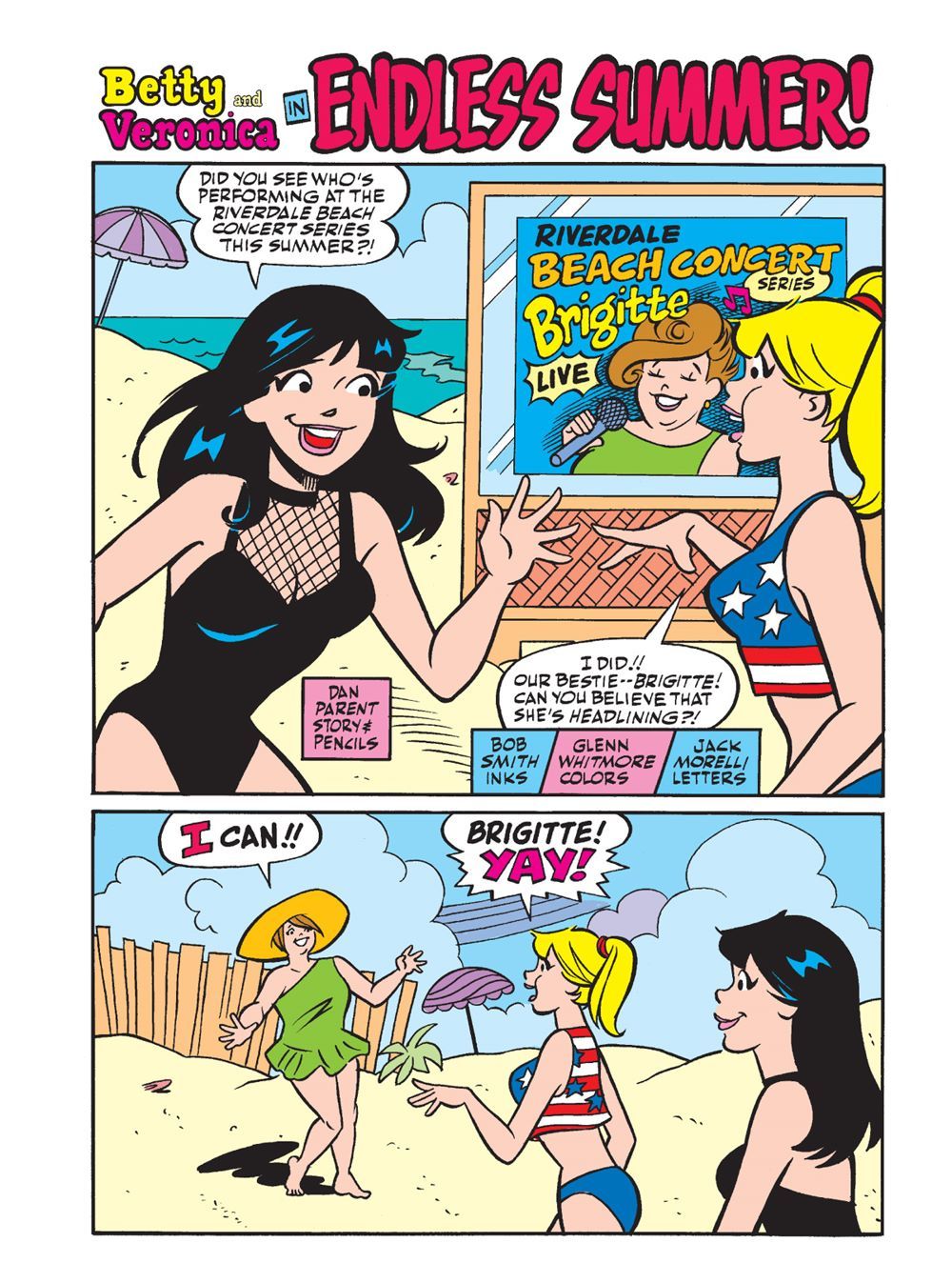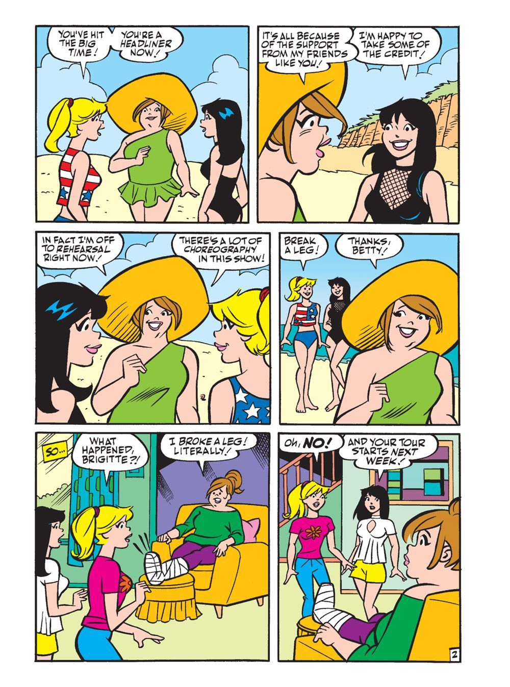 THREE BRAND NEW STORIES!!! You read that right, this jumbo comics digest is jam-packed with not two, but THREE brand new stories! First, in "Endless Summer," Betty & Veronica are excited that Brigitte is back in town, and she's getting ready to put on a summer concert at Riverdale Beach. The only trouble is, she develops a leg injury and can't perform. So, she calls on her friend (and huge superstar!) Coco Perry to take her place!