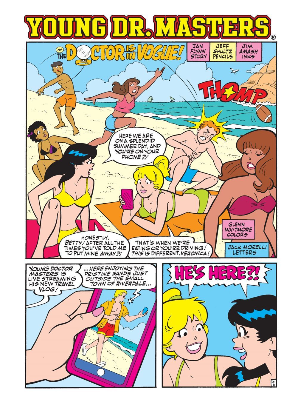 Finally, in "The Doctor is In Vogue," Betty and Veronica are engaging in their favorite pasttime on the beach—watching their new favorite online celebrity, Dr. Masters, livestream his international adventures on his travel vlog! Things get a lot more exciting when they learn that Dr. Masters newest excursion is in... Riverdale, USA!
