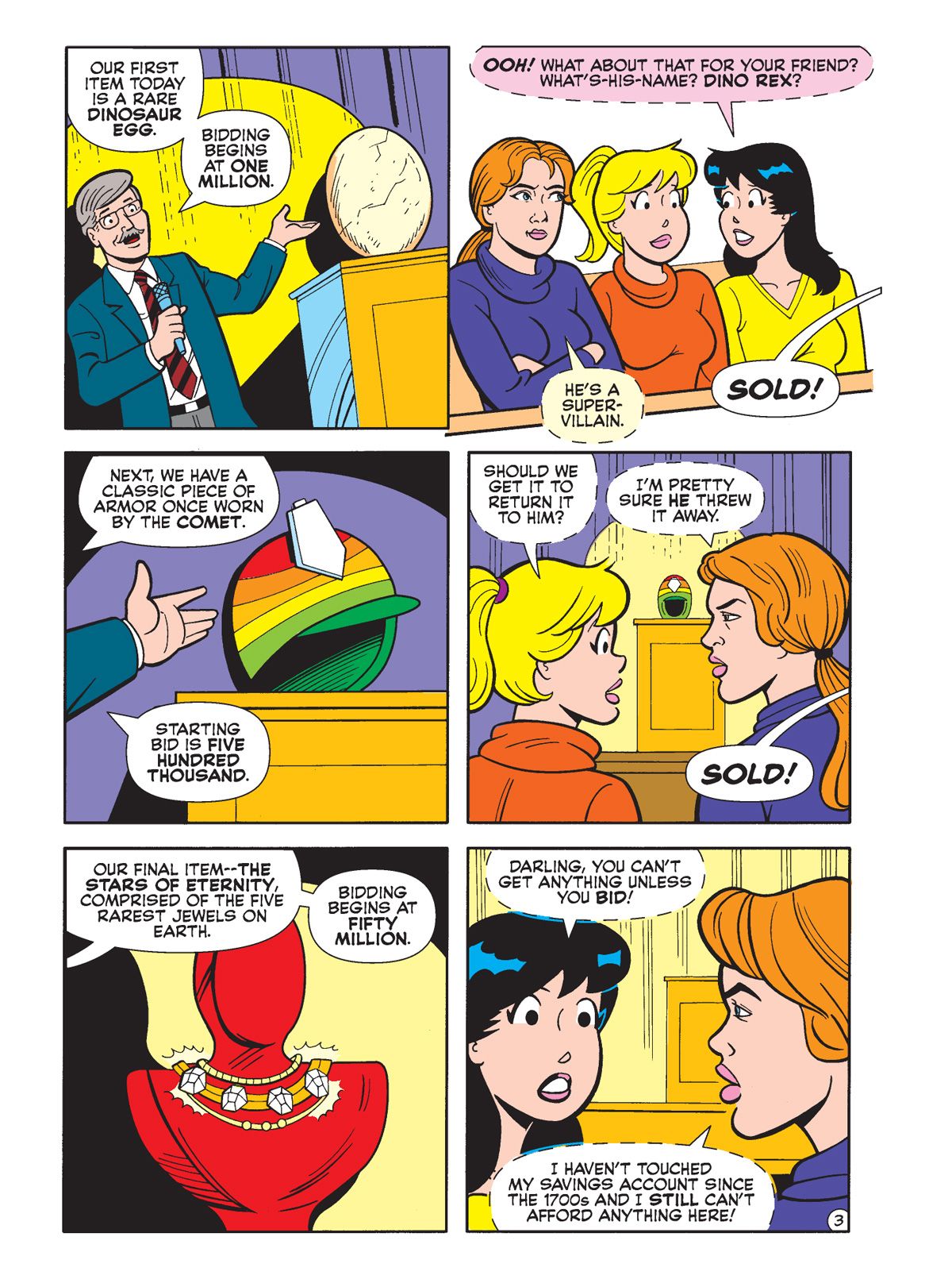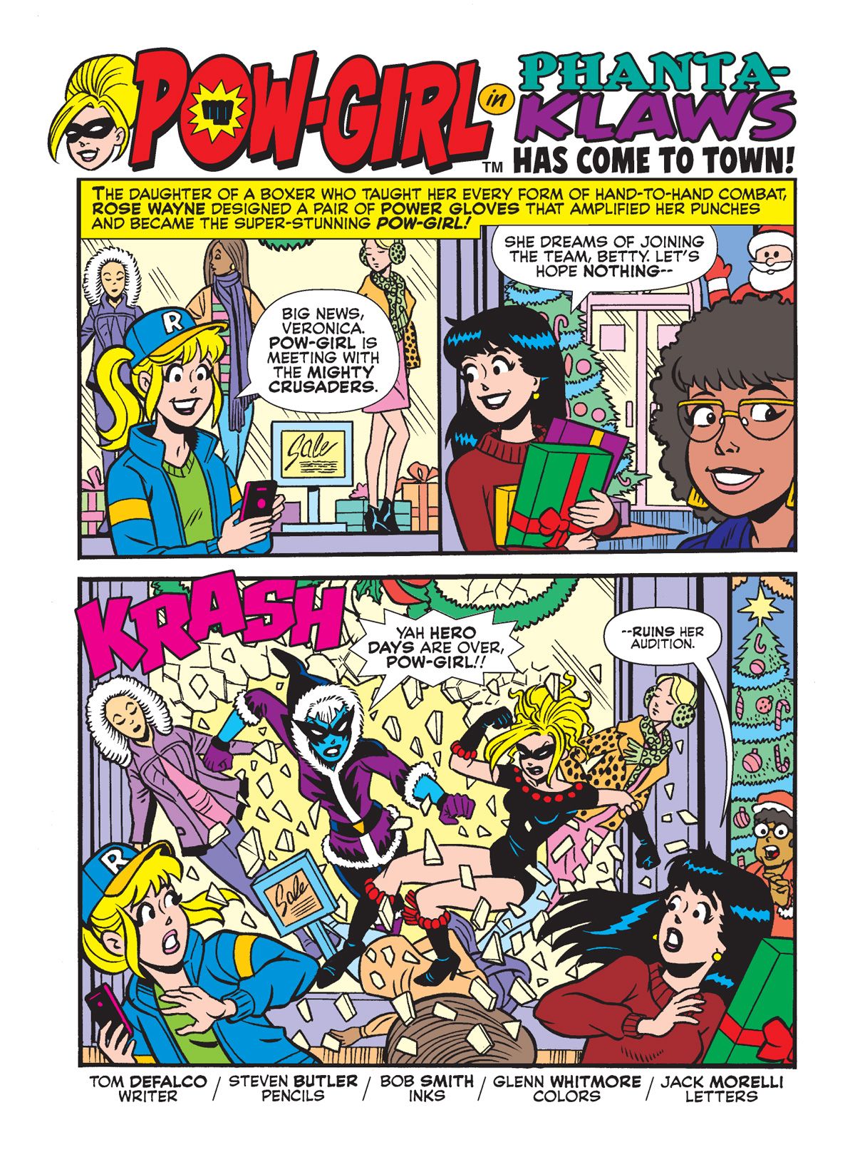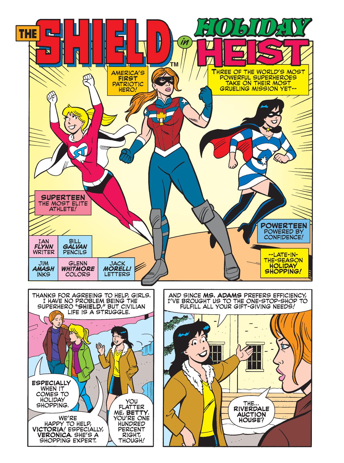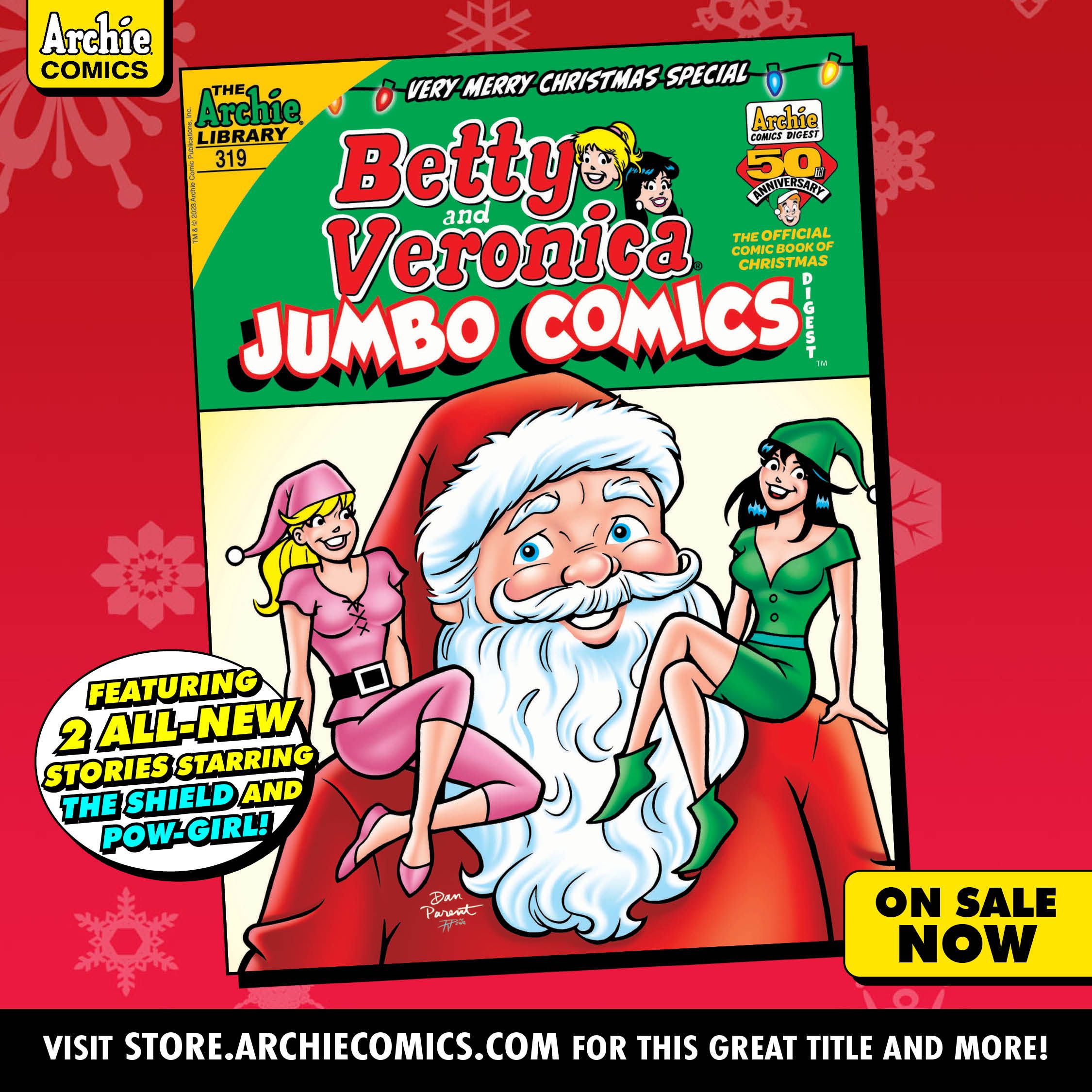 TWO BRAND NEW STORIES! First, on the eve of her interview for membership in the Mighty Crusaders, a battle with a new super-villain ruins Pow-Girl's costume so she must turn to Betty & Veronica to save the day. Then, The Shield is looking for the perfect holiday gift. Lucky for her Betty and Veronica are there to help her shop–and stop some shoplifters!
