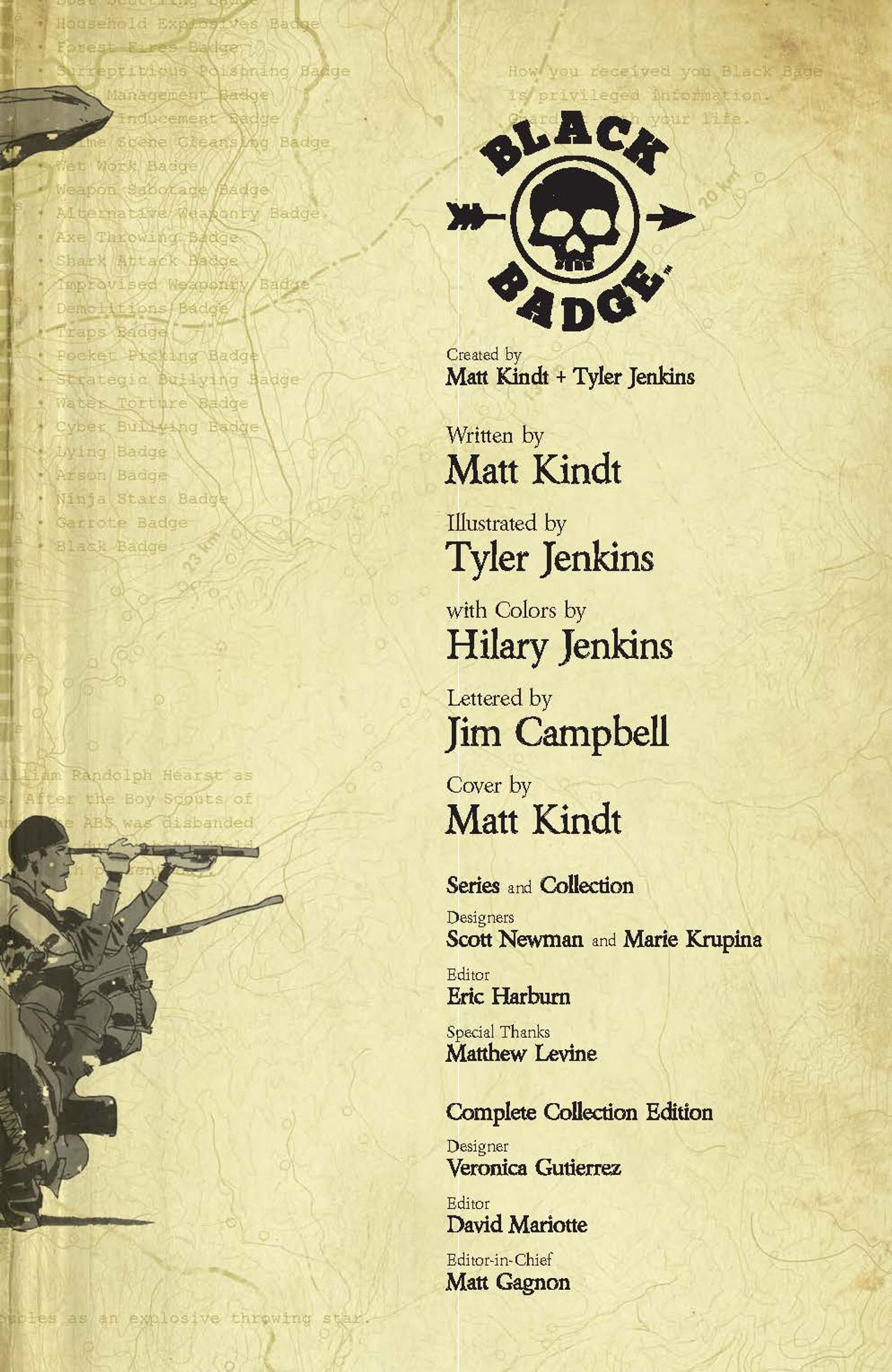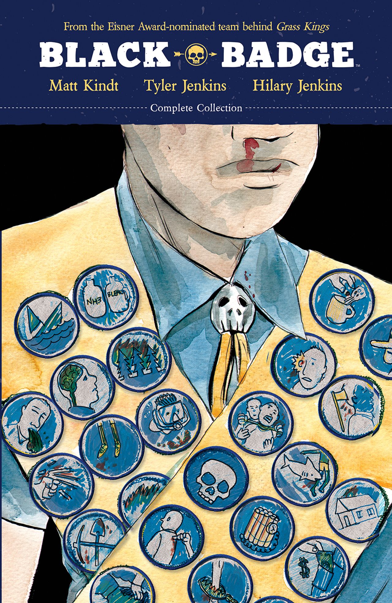 Willy was the first boy scout to get every merit badge offered… except one. The one you don't get, the one you become: The Black Badge, a top-secret branch sent off to accomplish missions that adults never could. Kenny, Cliff, Mitz, and Willy may look like scouts who lost their tour group, but they're actually one of the most elite teams working for the government. But there are many secrets kept from them: the location of a long-presumed dead former member, the roles of the other Rainbow Jamboree participants, and ultimately the murderer of one of their own! Intrigue abounds as the kids have to pick up a world made a mess by adults. Experience the complete series by the Eisner-Award nominated creative team of New York Times bestselling writer Matt Kindt (BRZRKR, Mind MGMT), and illustrators Tyler Jenkins and Hilary Jenkins (Peter Panzerfaust, King of Nowhere), in one volume for the first time! Collects Black Badge #1-12.