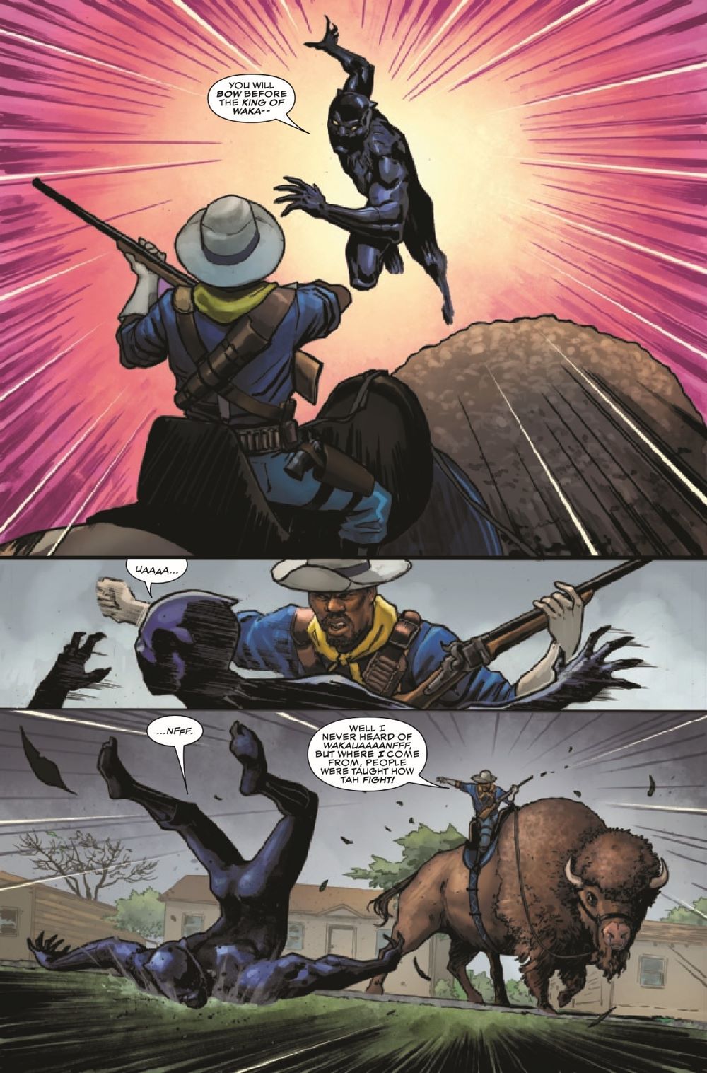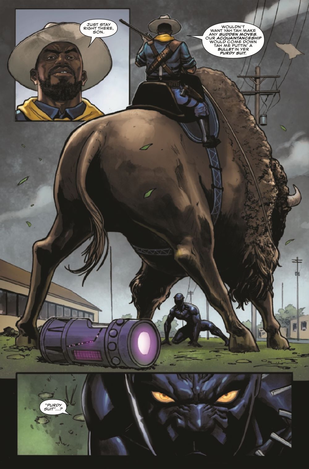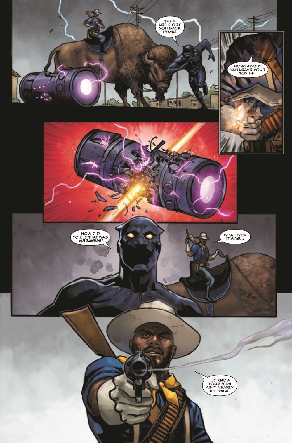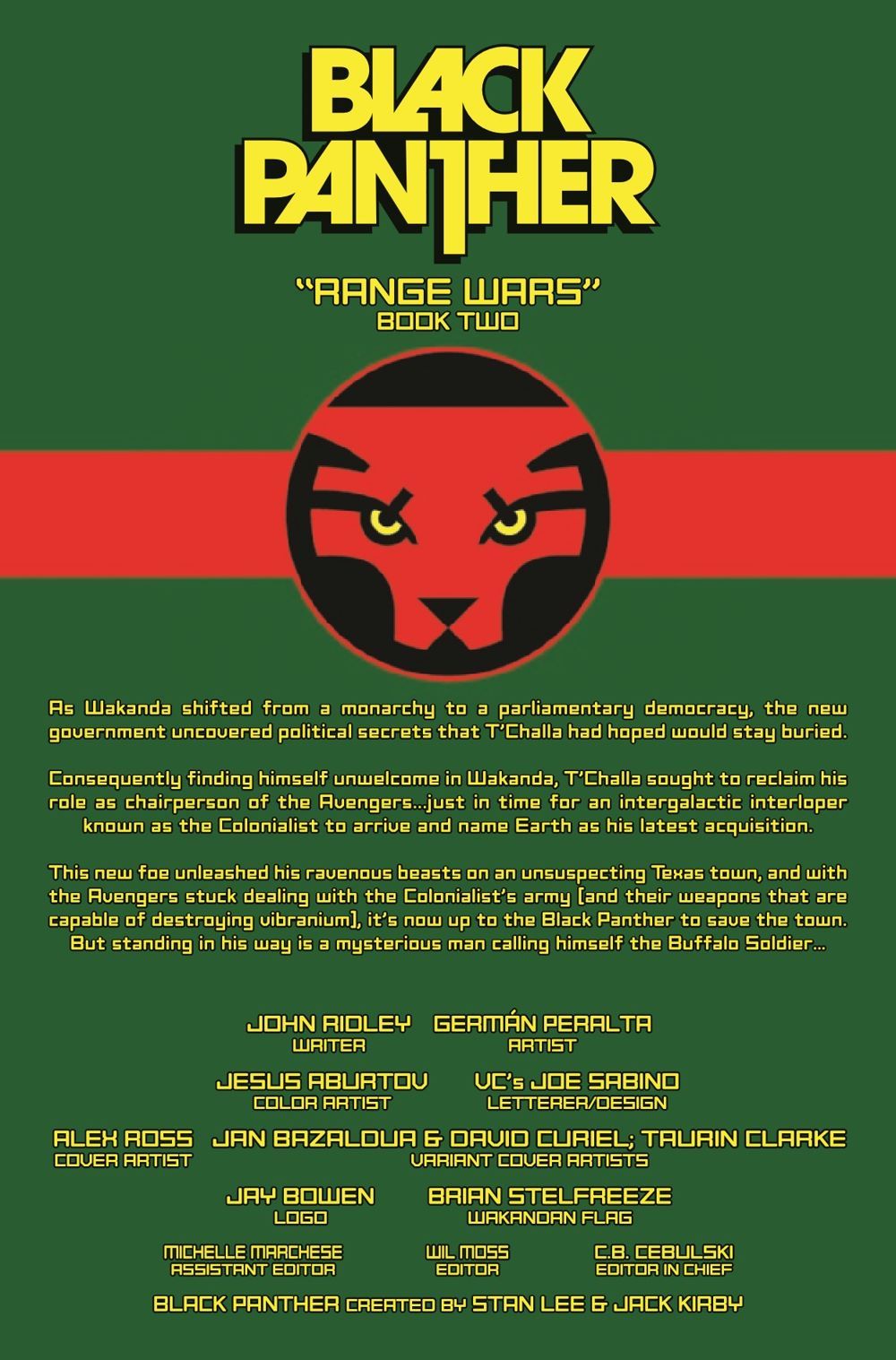 The devastating finale of "RANGE WARS"! While the Colonialist keeps the Avengers busy fighting his army, he sends his most dangerous lieutenant, the Buffalo Soldier, to deal with T'Challa. With advanced weaponry that can damage vibranium, T'Challa must think fast if he hopes to survive this fight and keep Earth from becoming the latest acquisition of the Colonialist!