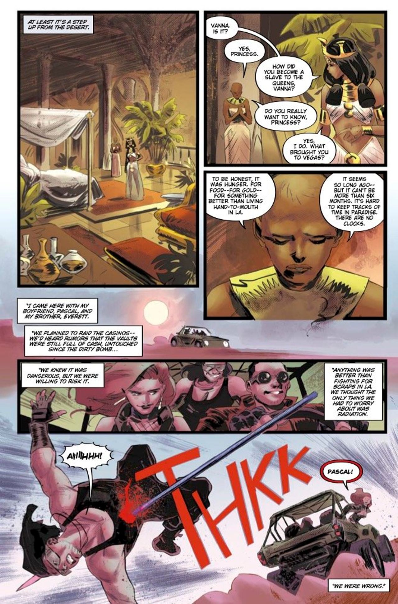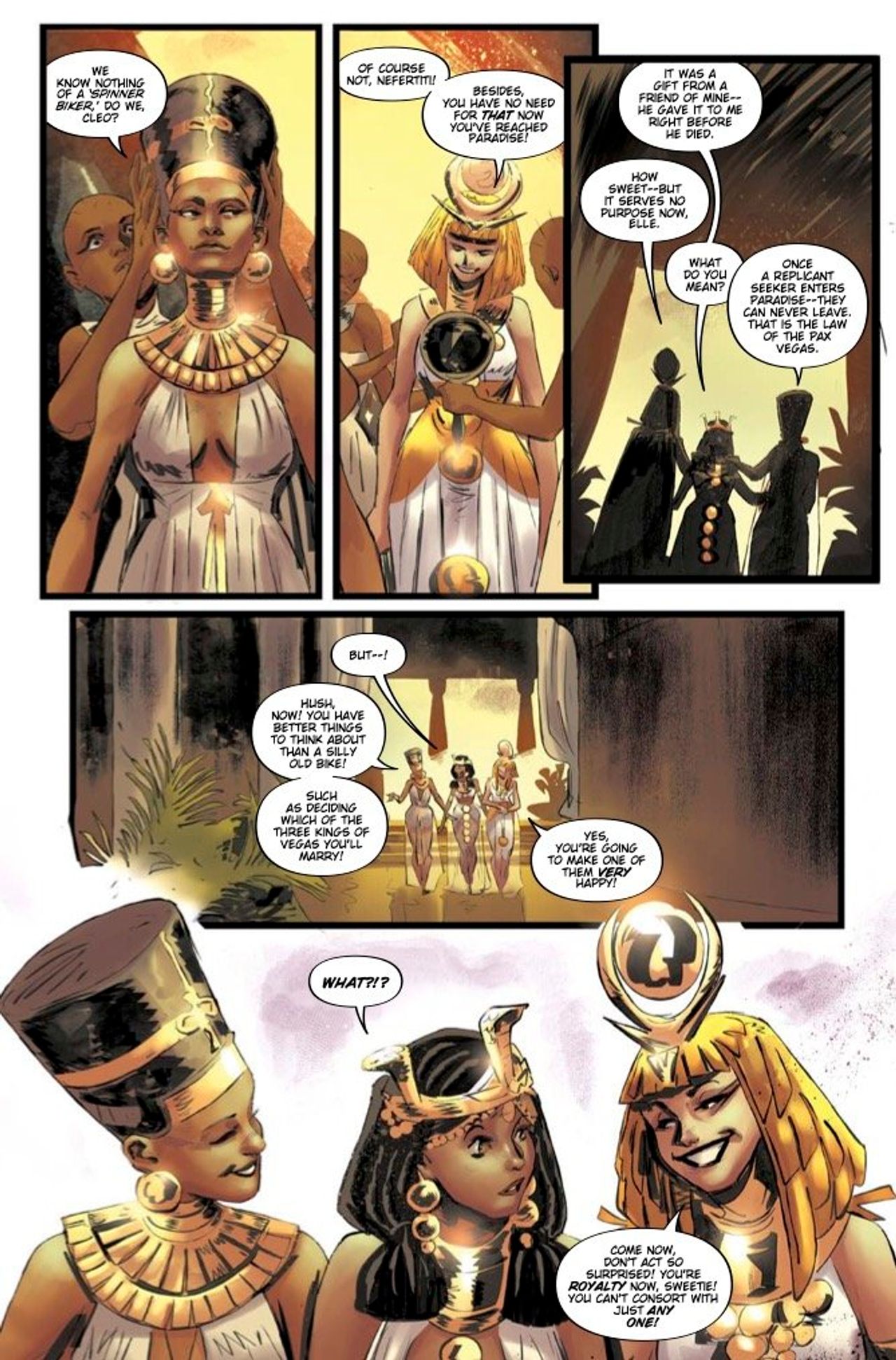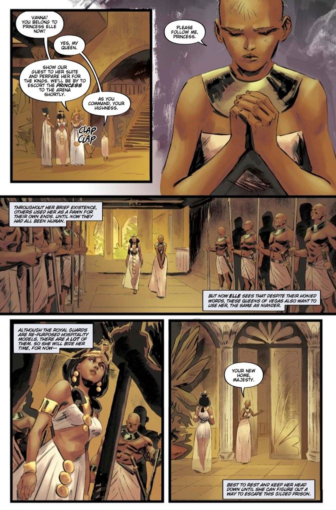 There she finds a community of roleplaying Replicants, abandoned hospitality models from the old casinos now living as embodiments of ancient Egyptian and Roman royalty. Meanwhile, Niander Wallace, smarting from his last encounter with Elle, has dispatched a seasoned kill team to bring back her head.