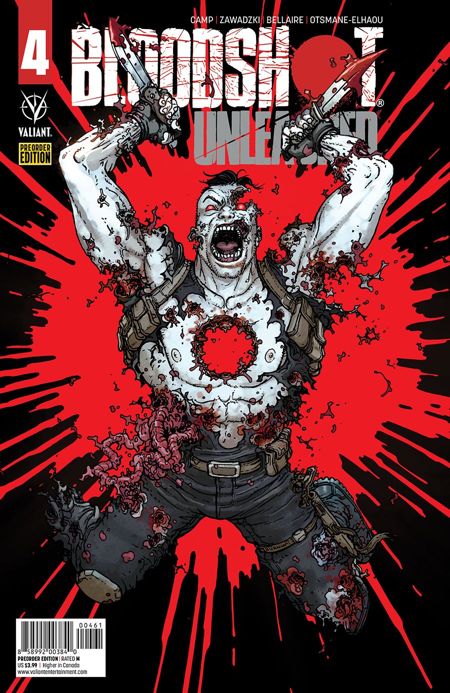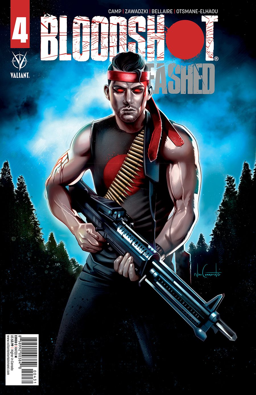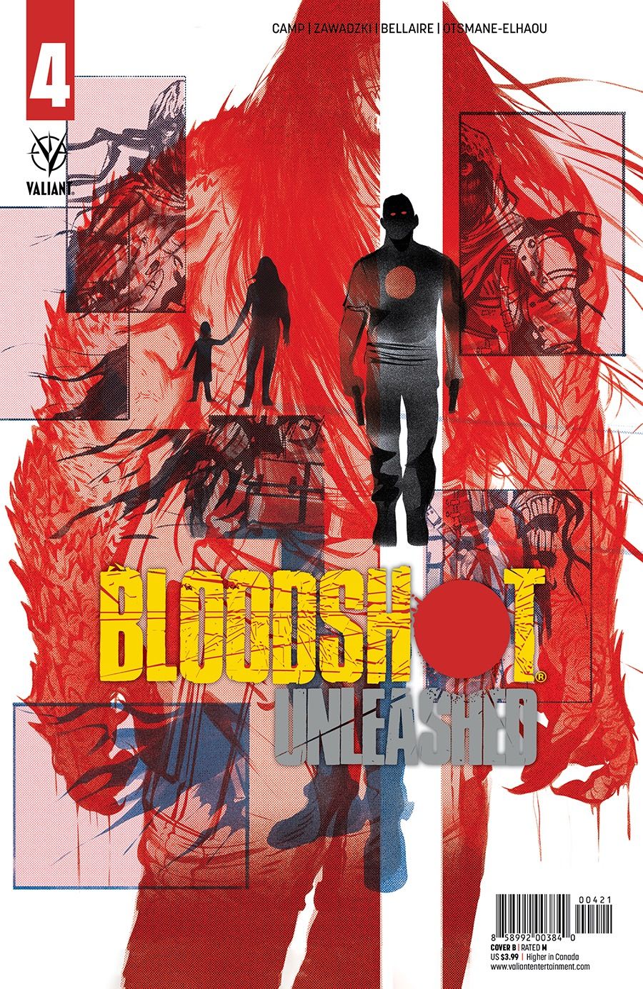 BLOODSHOT UNLEASHED #4 is written by DENIZ CAMP, features art by ERIC ZAWADZKI, colors by JORDIE BELLAIRE, letters by HASSAN OTSMANE-ELHAOU, and covers by JON DAVIS-HUNT (Cover A), NICOLE RIFKIN (Cover B), NINO CAMMARATA (Cover C), TRAVIS ESCARFULLERY (Cover D) and CHRIS BURNHAM (PreOrder Cover).