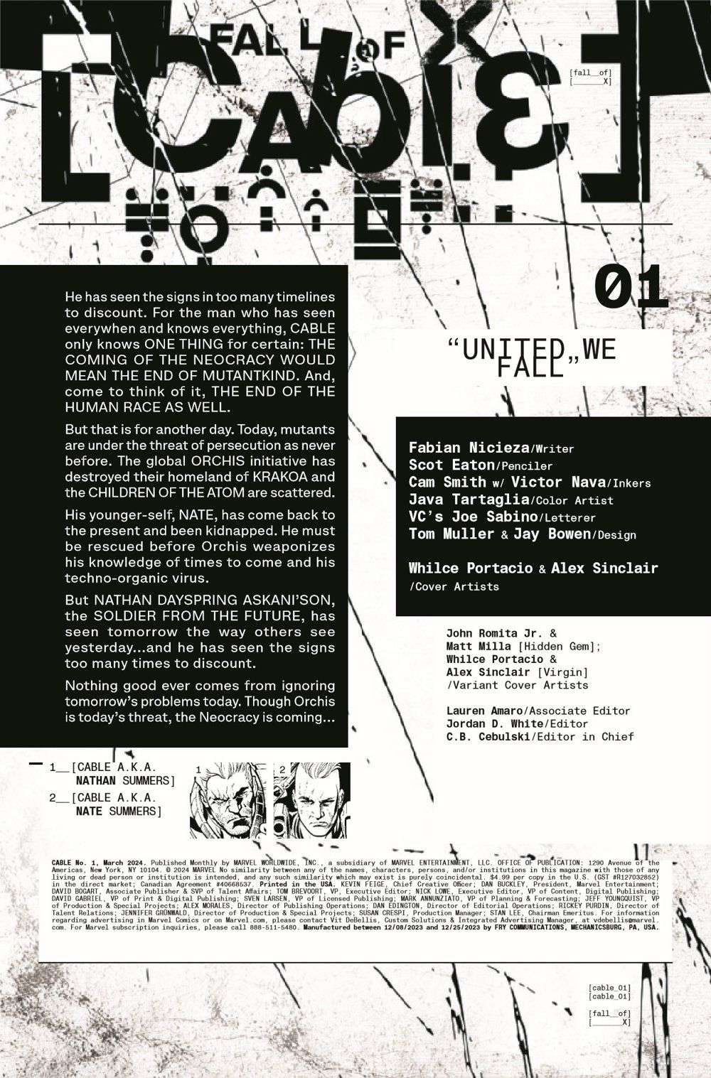 THE FUTURE MUST NOT COME TO PASS! All the signs are here: The Neocracy is coming - and with it comes not only the end of mutantkind, but all of the humankind as well! As if rescuing Young Nate from the ongoing threat of Orchis weren't enough, can Cable root out this growing threat and decimate it before the Neocracy has a chance to take hold. But is he already too late to change the future? Don't miss out on Fabian Nicieza and Scot Eaton's explosive first issue of CABLE!