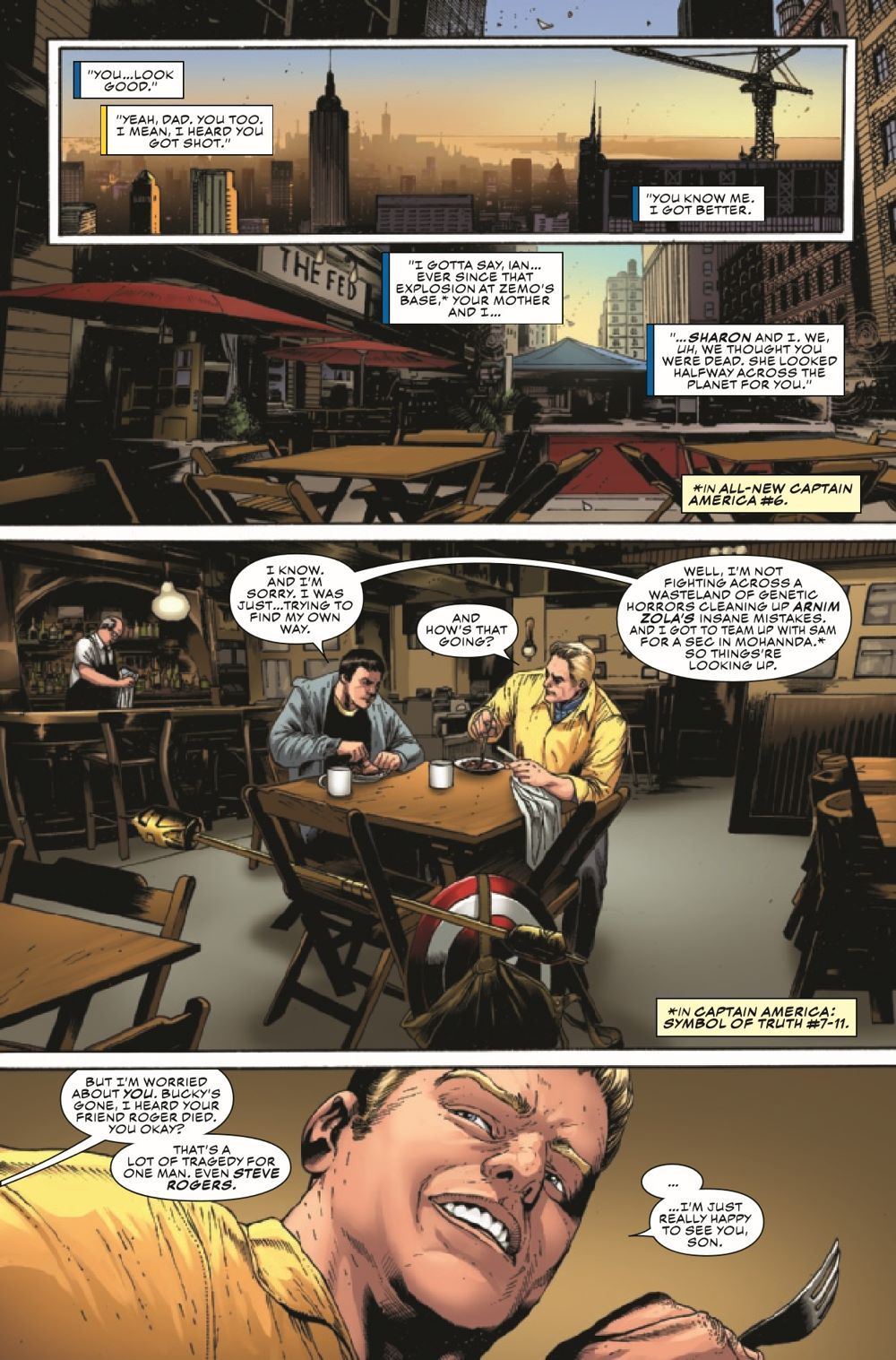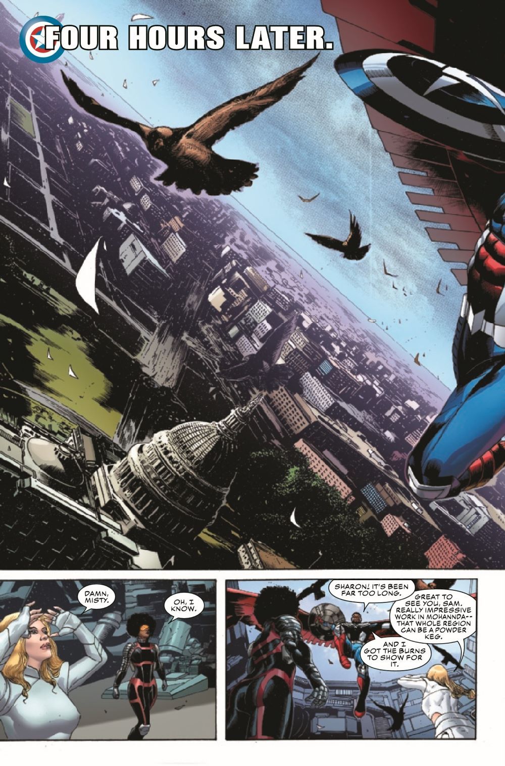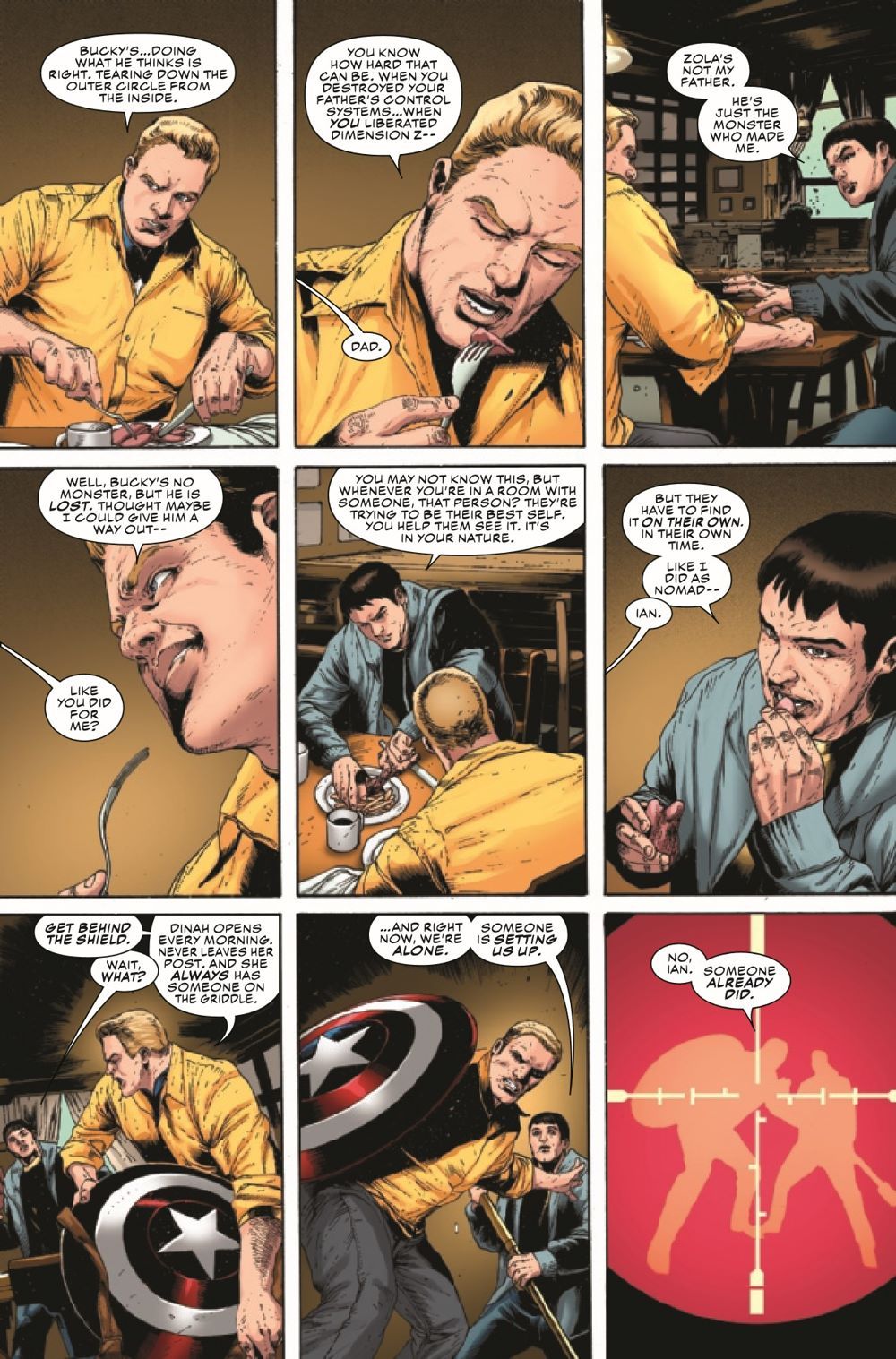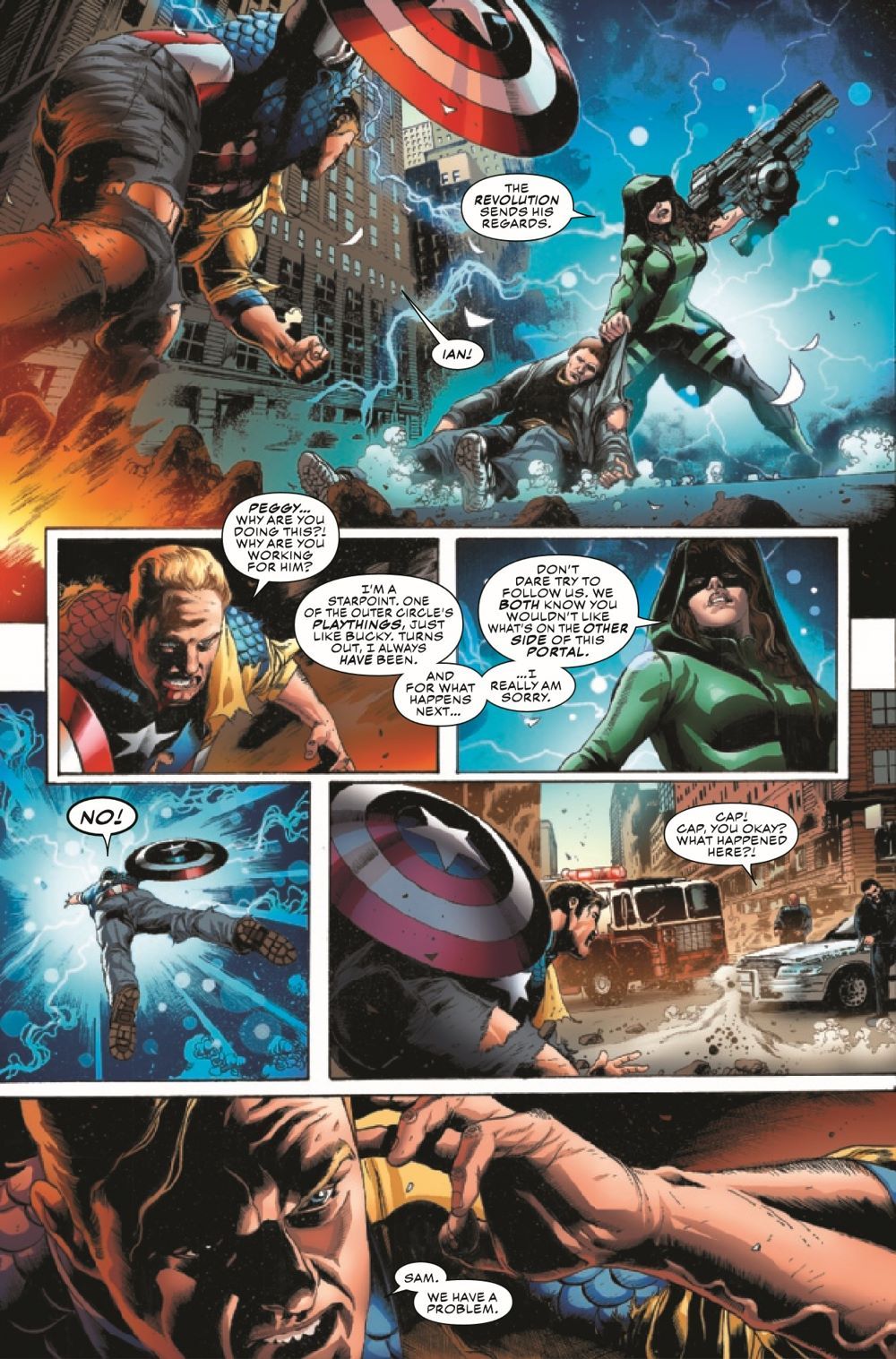 THE REVOLUTION STARTS HERE: COLD WAR - PART ONE! Bucky Barnes is the Outer Circle's New Revolution, and he has enacted his deadliest move yet — an alliance with Sam Wilson's nemesis, the White Wolf. When Steve Rogers' adopted son, Ian, A.K.A. Nomad, is abducted by someone Steve thought was a friend, he suspects Bucky's hand at work and calls upon the people who know Ian best — Sam Wilson, Sharon Carter and Misty Knight — to help him get to the bottom of the attack. Has Bucky finally gone too far? Why has Nomad been taken, and what does it have to do with a portal to Dimension Z opening over a secret battleground in Alaska? The Symbol of Truth and the Sentinel of Liberty reunite for a pulse-pounding crossover event that will make them question everything they believe in…and each other.