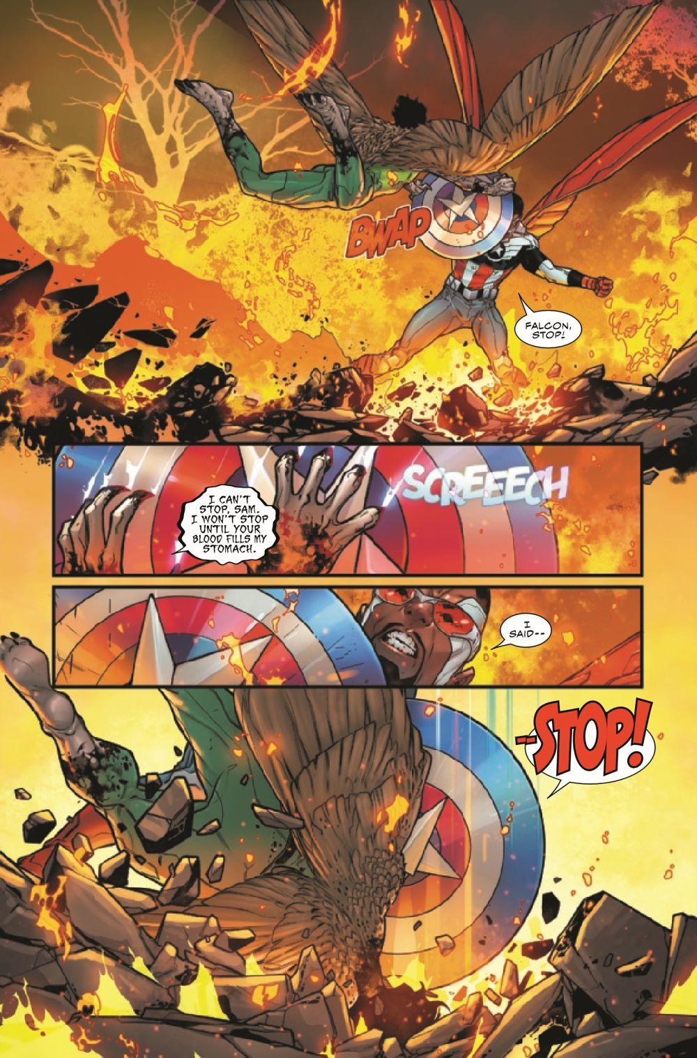 CAP VS. FALCON! When Falcon arrives in Mohannda, delirious and rampaging from the effects of White Wolf's chemical attack, it's up to Captain America to save his friend - or to stop Falcon from hurting anyone else. In this heartbreaking showdown between partners, Sam Wilson must make a choice about who he wants to be - and what he is willing to sacrifice for the mantle of Captain America.