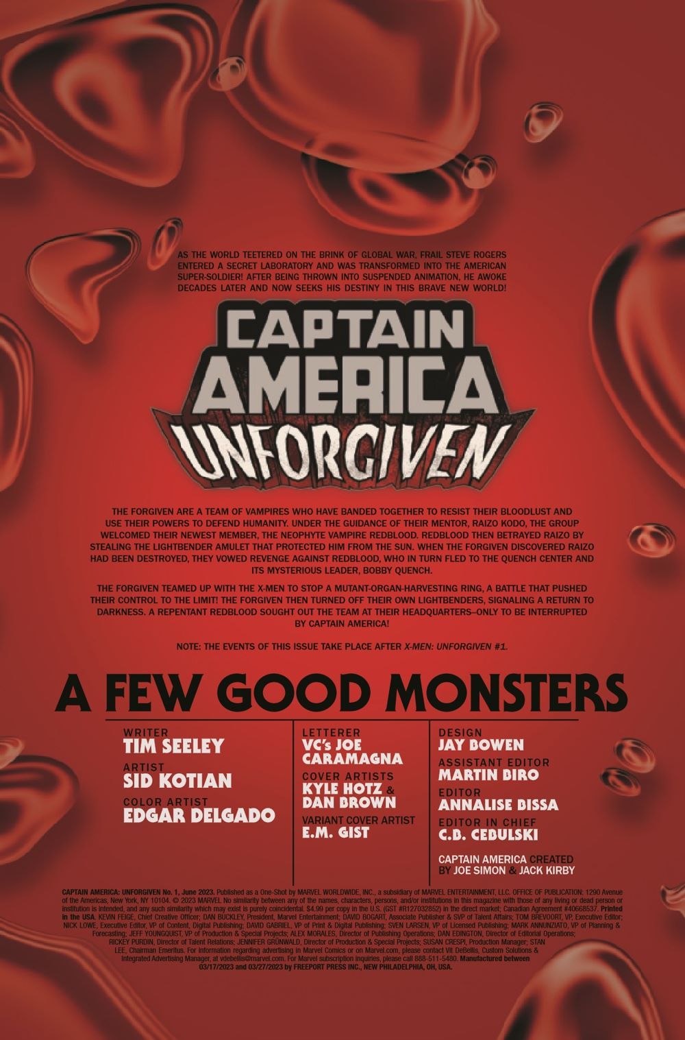 CAPTAIN AMERICA…VAMPIRE HUNTER? • The FORGIVEN have lost their way — defeat after defeat has made them bitter and bloodthirsty...and they're starting to like it! • Can CAPTAIN AMERICA bring them back into the light? Or will they give in to their darker natures? • Witness the thrilling conclusion to the UNFORGIVEN saga…if you dare!