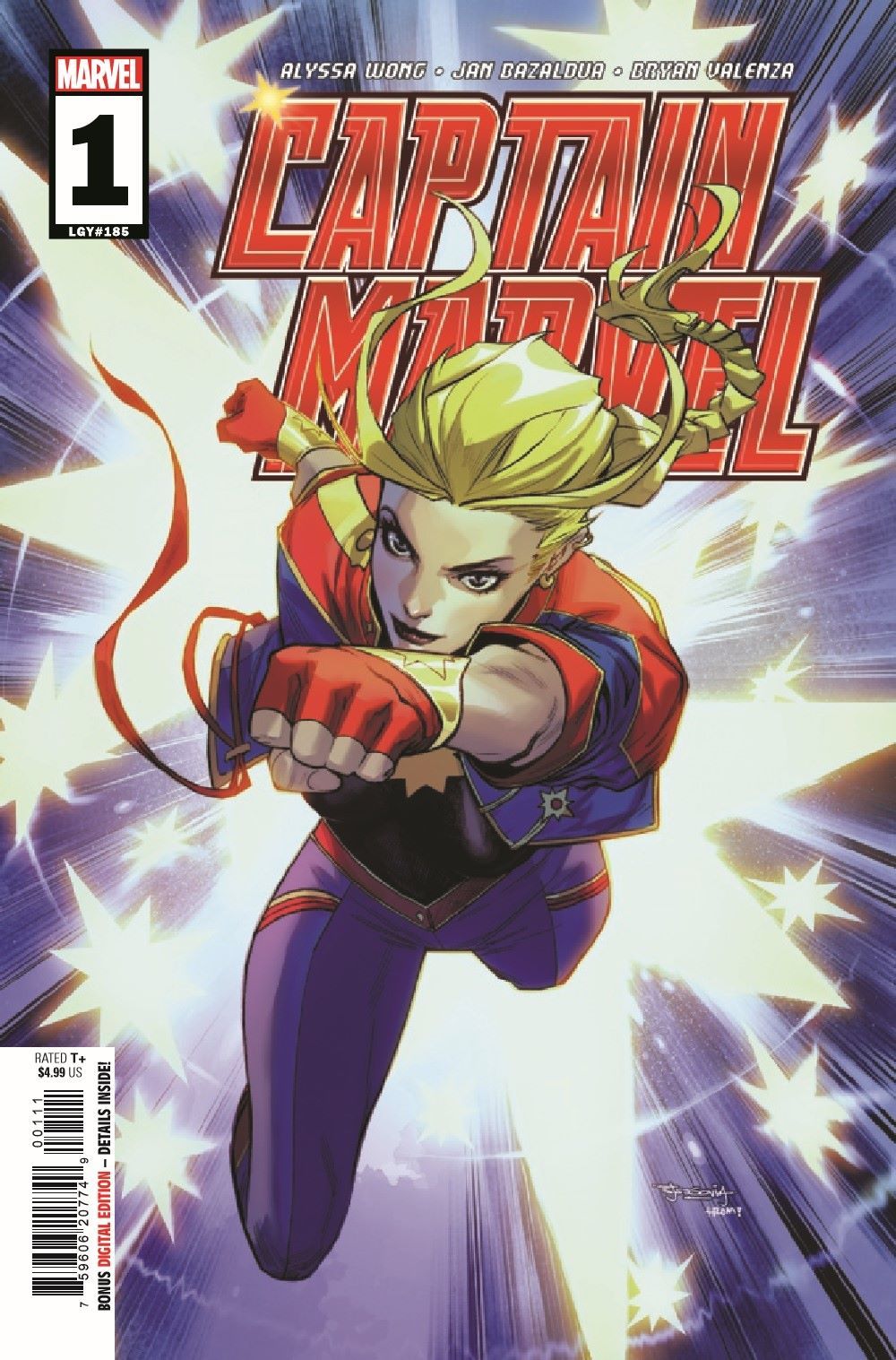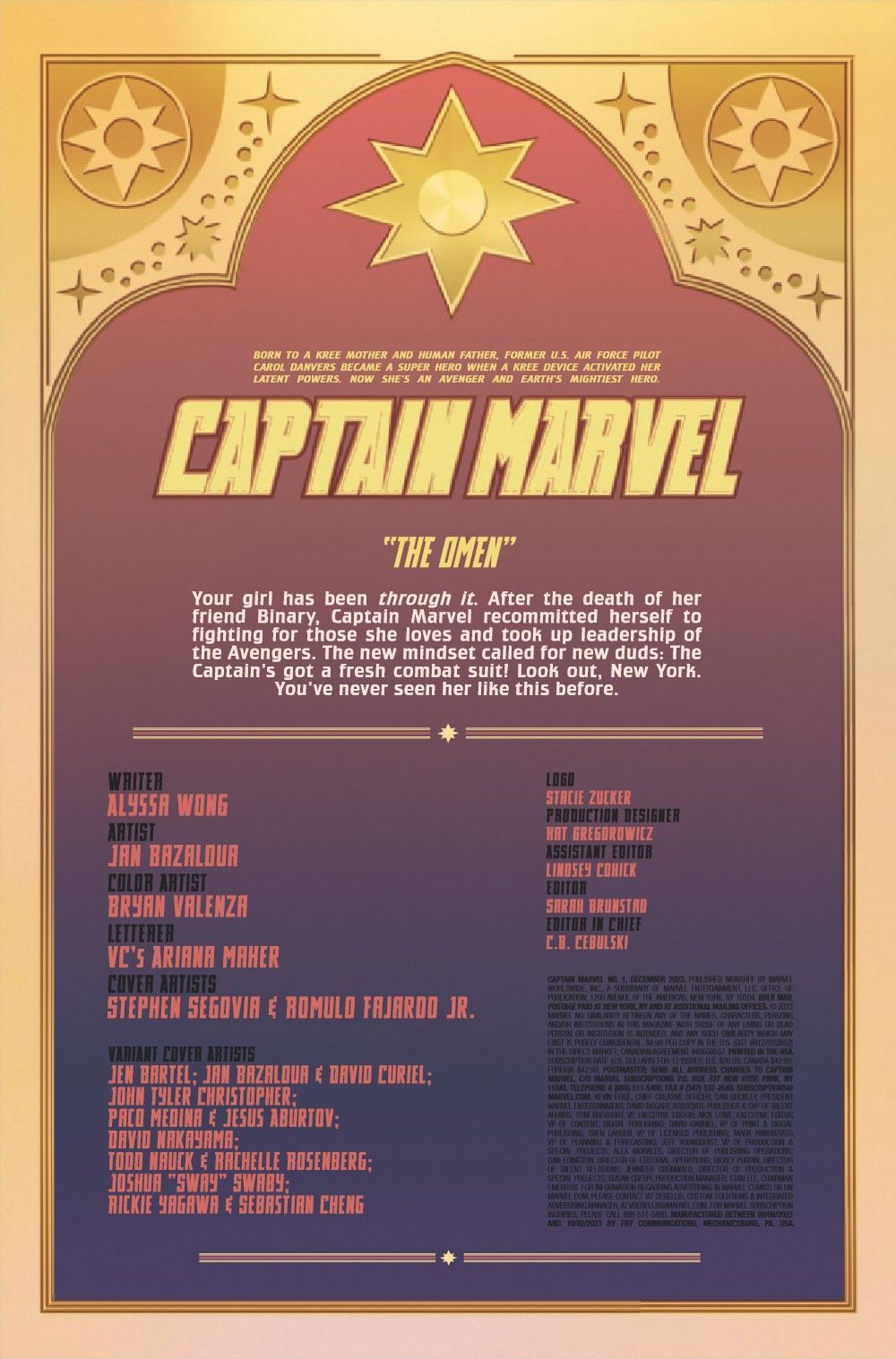 HIGHEST, FURTHEST, FASTEST! The Captain gets a permanent glow-up designed by superstar artist Jen Bartel! And that's not all that's changed. Brand-new look - brand-new creative team - and a brand-new status quo. Carol Danvers is one of the powerhouses of the Marvel Universe, a woman capable of harnessing the energy of the sun. So if you're coming for Earth? She's the first one you take off the board. Someone's figured just how to do just that. Introducing a new supporting cast and villains both beloved and dangerously fresh, Alyssa Wong and Jan Bazaldua's exhilarating series kicks off here!