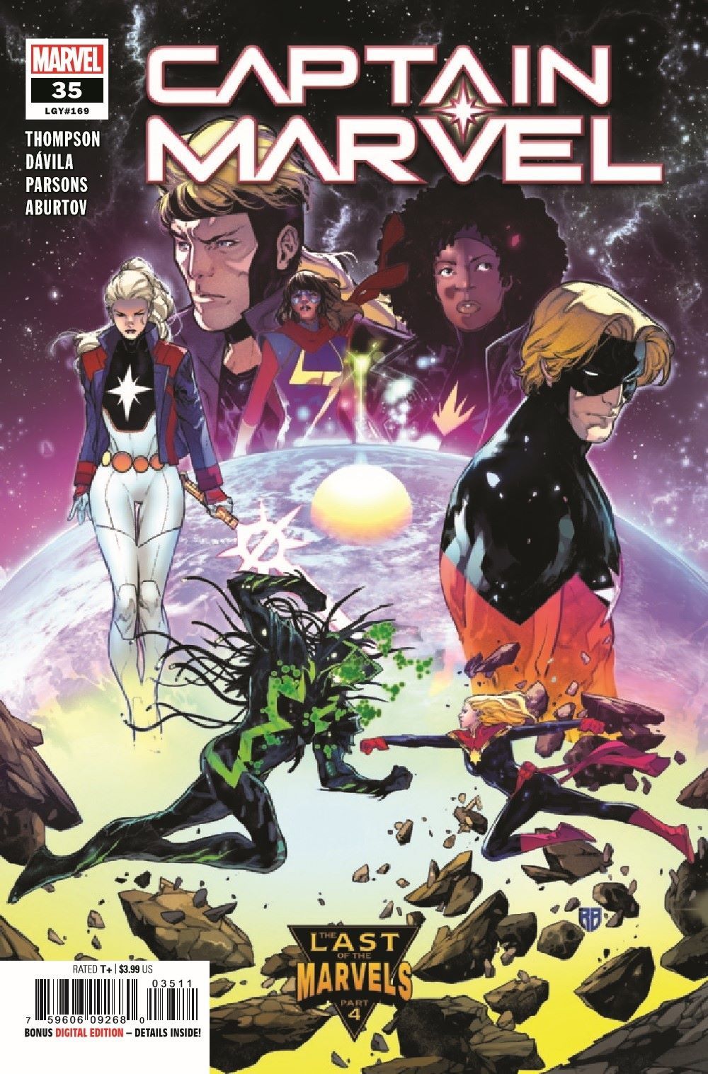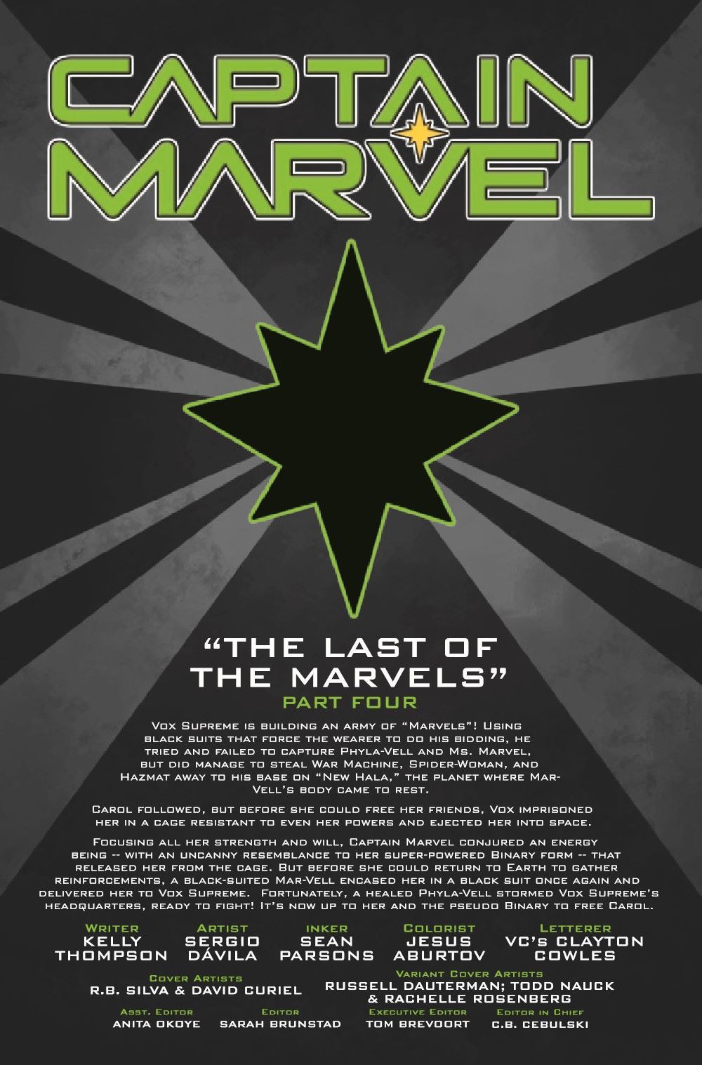 "THE LAST OF THE MARVELS" PART 4 As Carol and the other Marvels fight to save themselves and so much more from Vox Supreme's dark plans, the Avengers and the Guardians of the Galaxy join the battle! While Vox Supreme believes he knows Carol Danvers inside and out, she has thrown him a curveball that neither of them ever imagined. Fans old and new will lose their minds over this one-don't miss the biggest expansion of the Captain Marvel mythos since she took the name and claimed her stars!