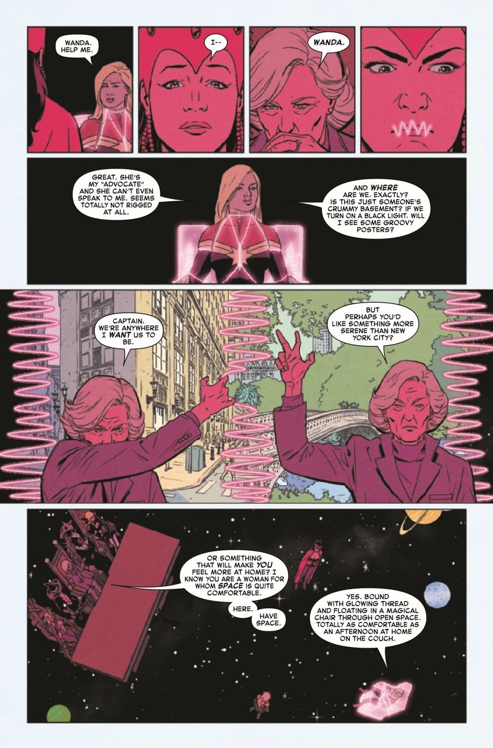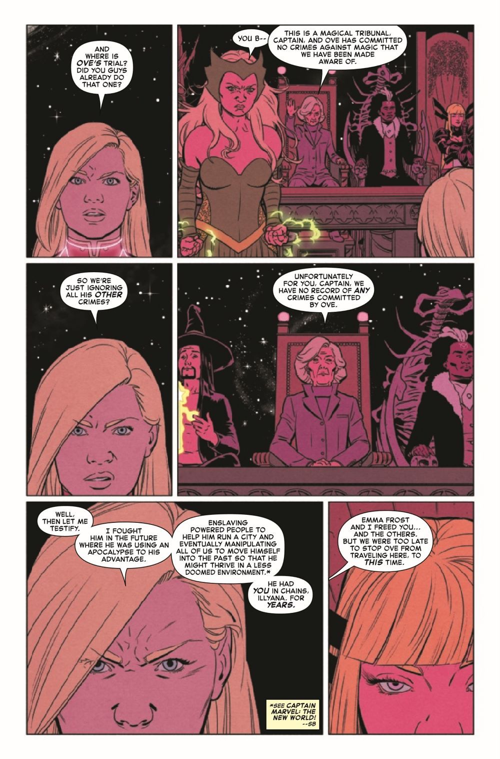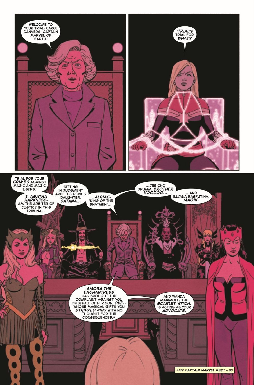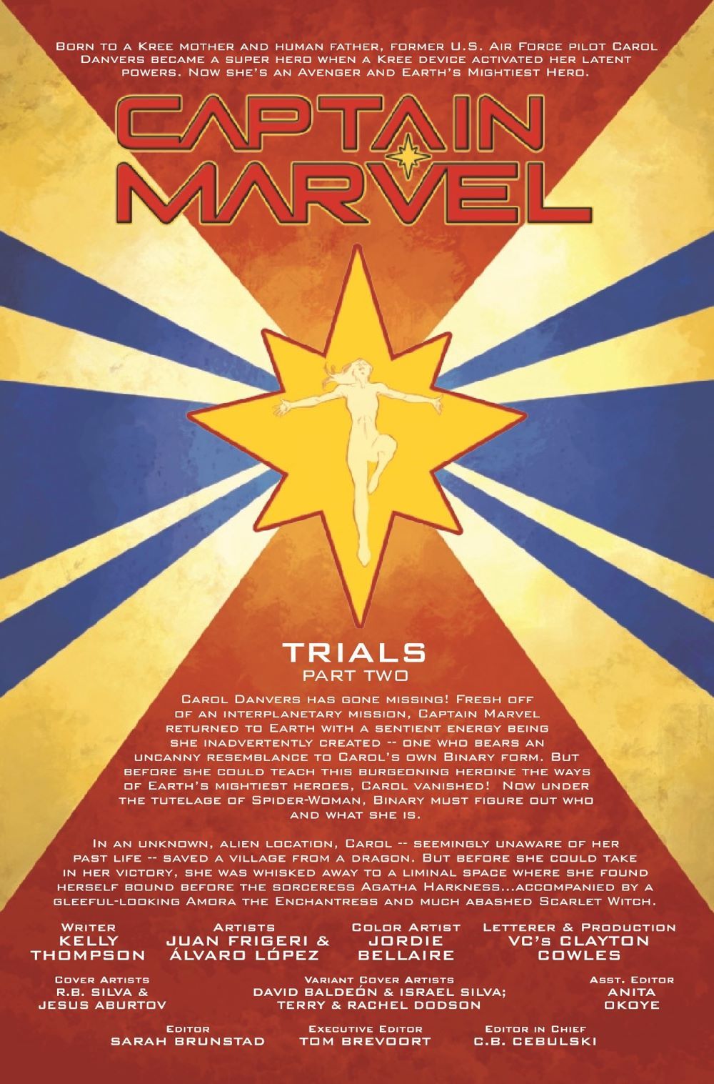 TRIAL BY MAGIC AND FIRE! Carol's "crimes" against a powerful foe are coming back to haunt her as Agatha Harkness, helming a tribunal of some of Marvel's most powerful magic-wielders, puts her on trial. But Captain Marvel isn't exactly thrilled to recognize this court's authority, nor does she appreciate being held against her will. Back on Earth, in the midst of a spiraling identity crisis, Binary's skills are put to the test when she must aid Spider-Woman in protecting humans against themselves.