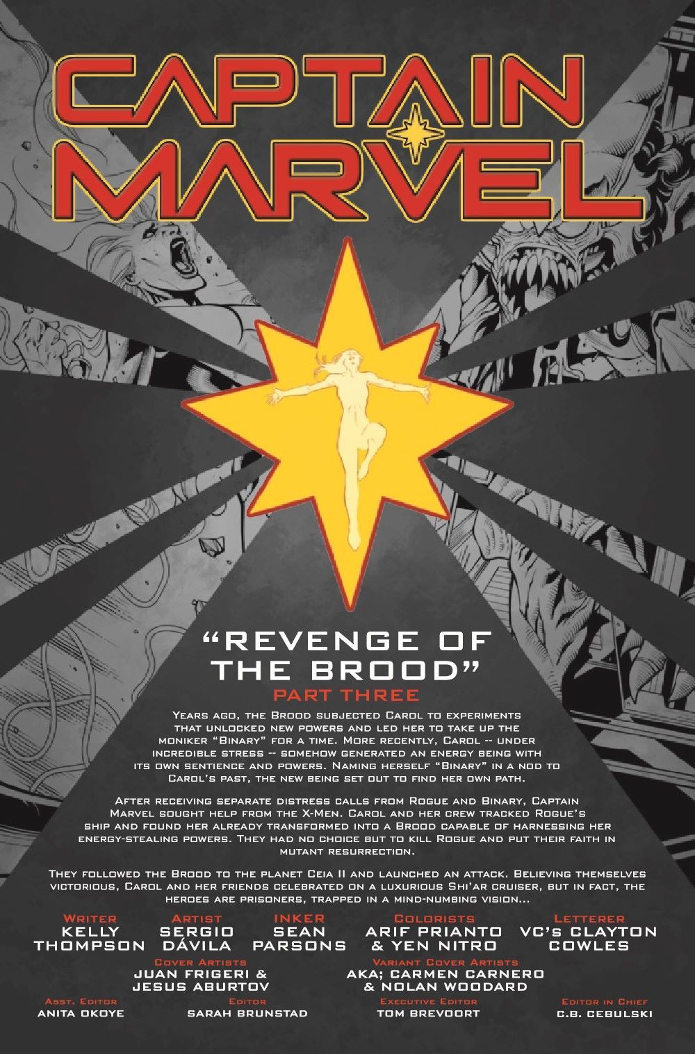 REVENGE OF THE BROOD - PART 3! Captain Marvel and her eXcellent allies revel in their big win against the Brood, but all is not quite what it seems… Carol and her friends have miles to go before they sleep. The Brood has always been one of the universe's most dangerous foes, and one of Carol Danvers' greatest enemies. And now, under the rule of an Empress Brood gone rogue, with a hive mind bent on revenge, what could possibly stop them?