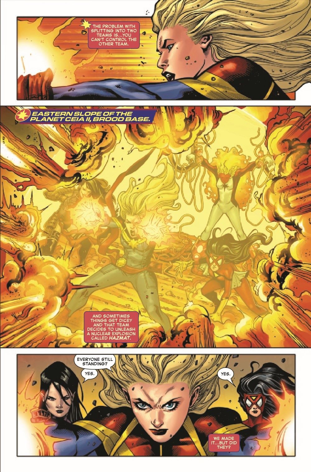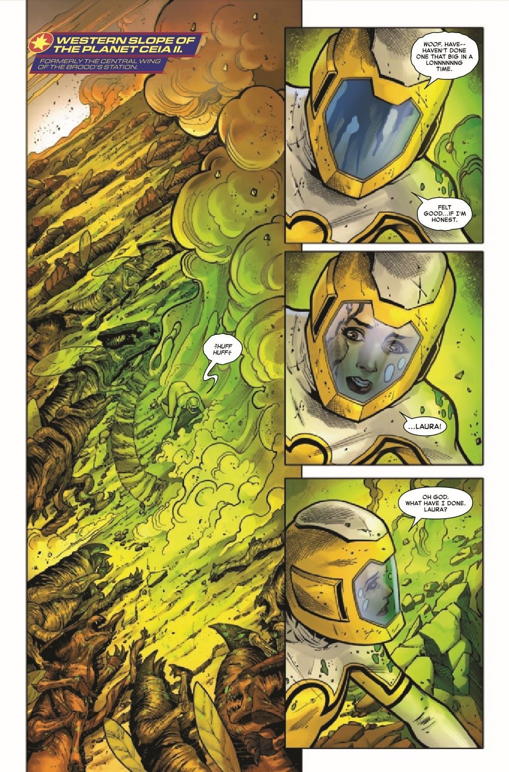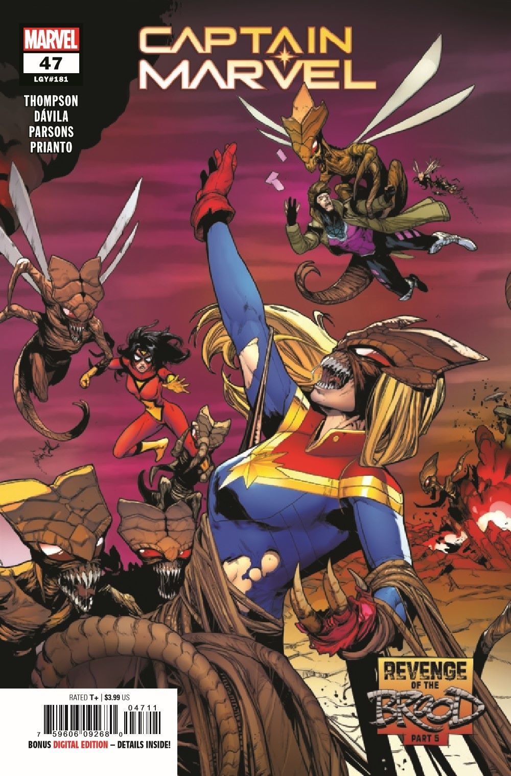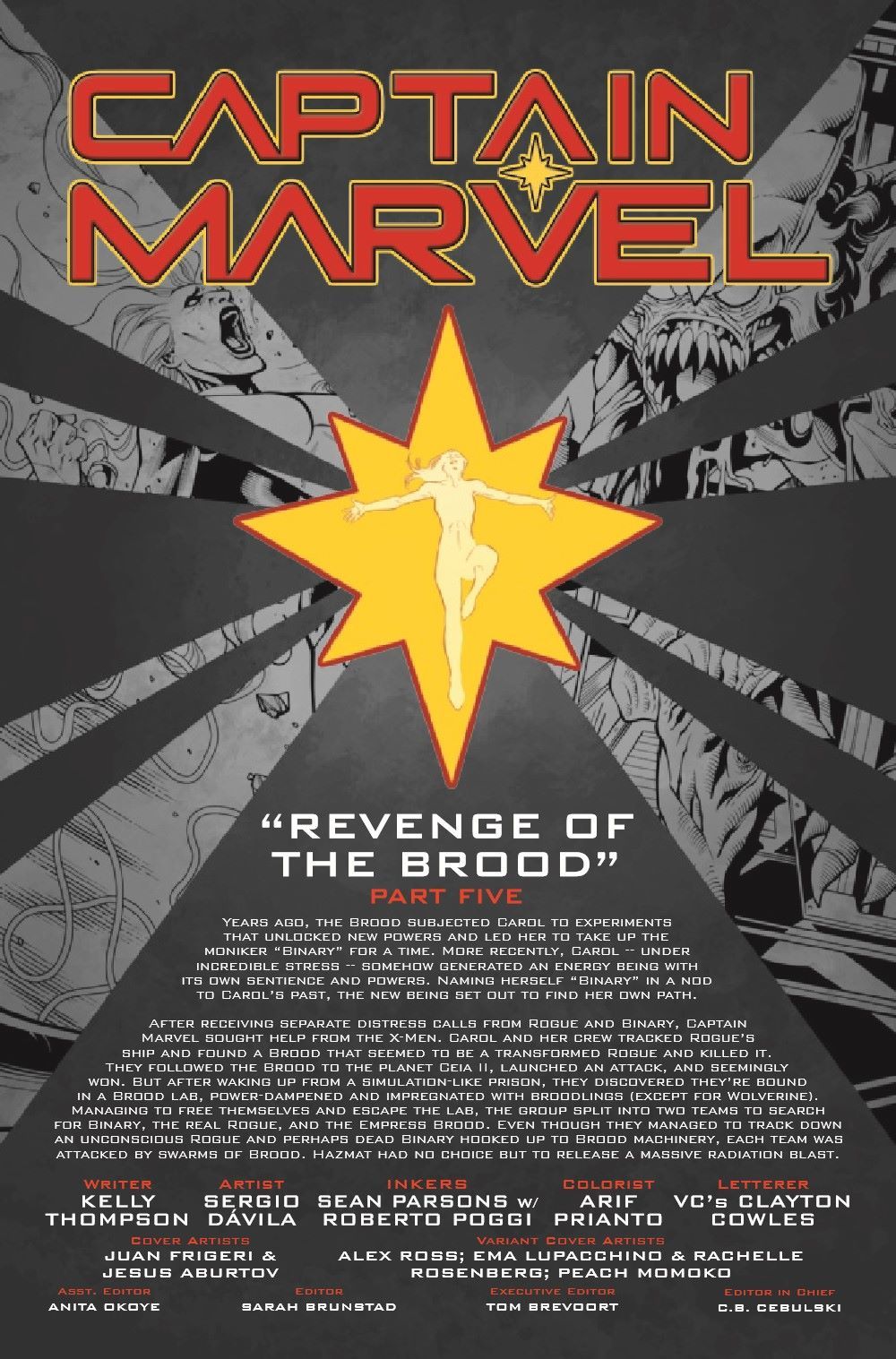 REVENGE OF THE BROOD - PART FIVE! Overwhelmed and trapped in the Brood's backyard, Captain Marvel and her team are forced to sacrifice one of their own. But the Brood let Carol through their clutches once before, and in so doing, created one of their worst enemies. They won't make that mistake again. Featuring a connecting cover to X-MEN #20!