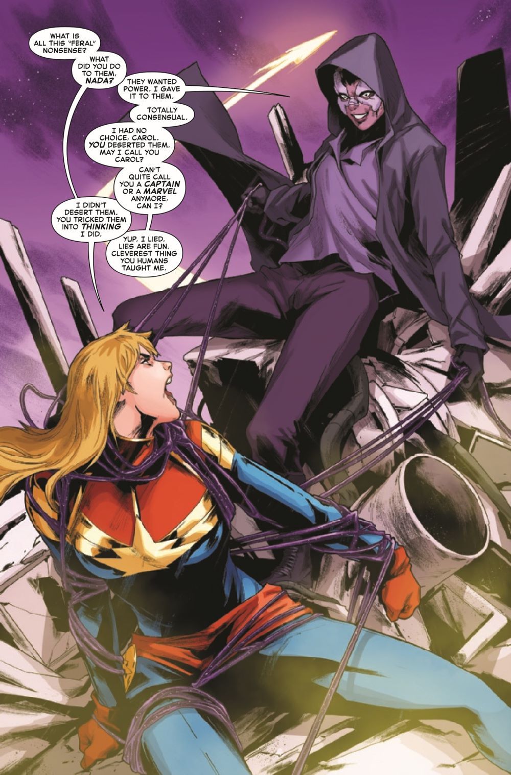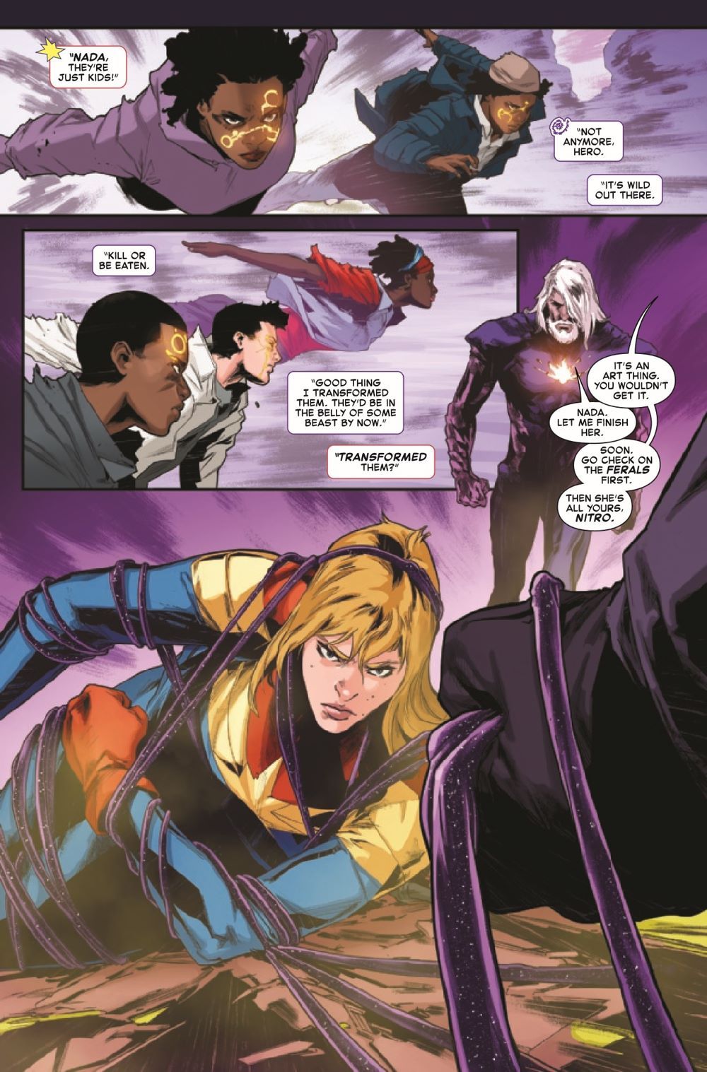 IN THE EYE OF THE STORM! Captain Marvel knows what it means to brave rough waters. There's no tsunami in this Multiverse that can pin Earth's Mightiest Hero. But the storm NADA is bringing to Earth will send even this harbor woman running for land! After corrupt technology turned her world into a wasteland, Nada is determined to drag the entire galaxy back to the Stone Age - for its own damn good. And with the FERAL FIVE and NITRO occupying the Captain, she's got a perfect shot.