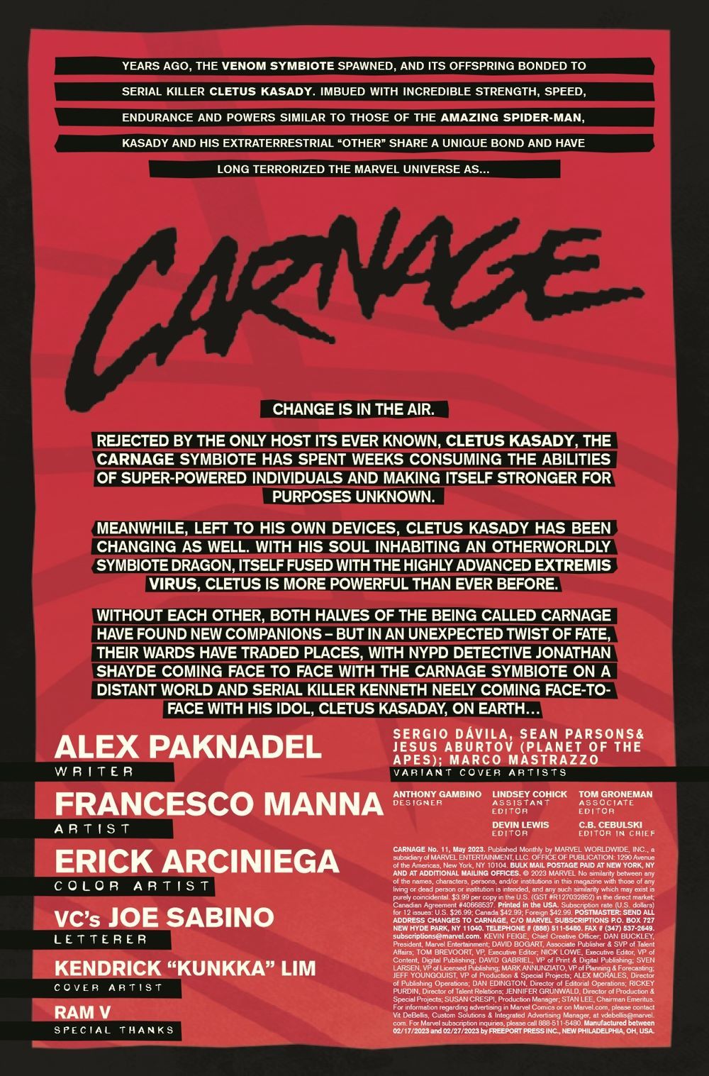 CLETUS KASADY IS BACK! Years ago, Peter Parker spurned the Venom symbiote and it created a monster. Last summer, Cletus Kasady spurned the Carnage symbiote similarly, willingly rejecting it in favor of forcing his consciousness into the deadly "Extrembiote" armor. You've seen what happened to the Carnage symbiote in the months that followed... Now watch on in horror and discover what happened to Cletus!